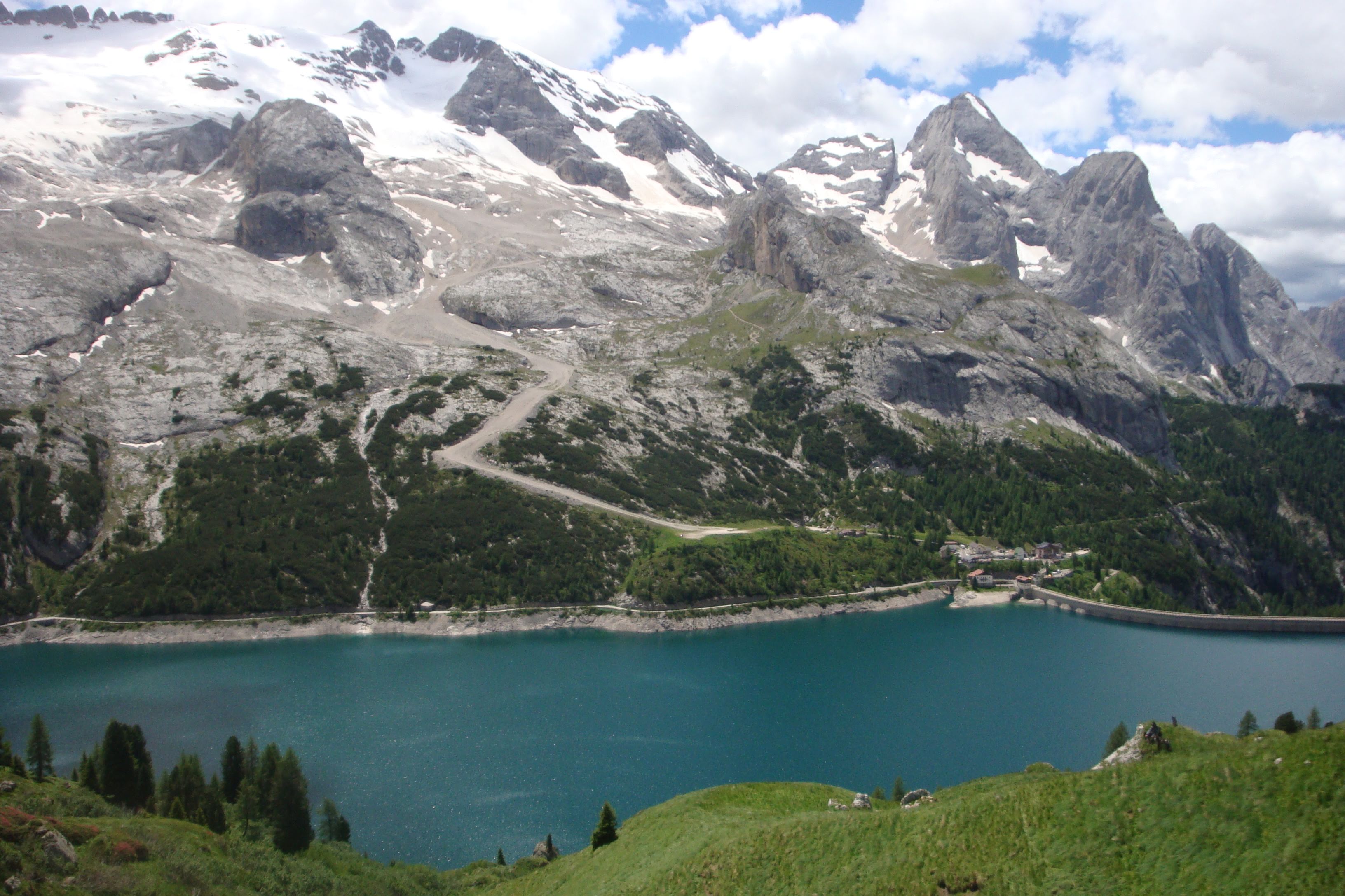 Nadszedł długo wyczekiwany dzień – wyjazd w Dolomity. Po spakowaniu niezbędnych rzeczy cała nasza trójka załadowała się do samochodu i w drogę do Canazei gdzie mieliśmy zakwaterowanie. Jednakże po całonocnej podróży nie chcieliśmy marnować dnia i wybraliśmy się na naszą pierwszą via ferratę, dla mnie i Wilusia to pierwsza żelazna droga w życiu natomiast Pelas jest w Dolomitach po raz piąty to własnie on zająłsię logistyką całego wyjazdu. Na korzyść tej ferraty przemawiało krótkie podejście i przede wszystkim położenie gwarantujące fantastyczne widoki. Zaparkowaliśmy samochód obok schroniska Rifugio Castiglioni Marmolada nad jeziorem Lago di Fadaia i po posiłku ruszamy w drogę.