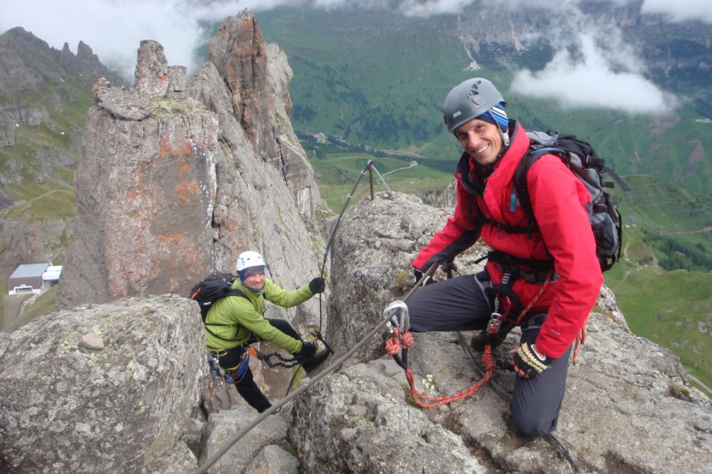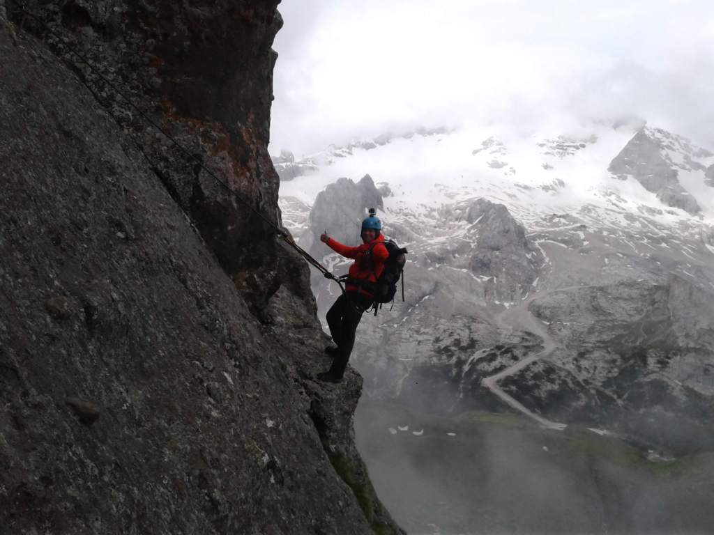 Rzeczywiście pierwsze metry Delle Trince, które poprowadzone zostały po prawie pionowej ścianie są dosyć trudne. W każdym razie mnie zaskoczyły mimo, że widziałem gdzie leziemy. Z dołu ściana nie wygląda na szczególnie trudną, ale kiedy wepniemy się w stalową linę i ruszymy w górę zobaczymy że jest inaczej. Pelas jest już gdzieś wysoko podczas gdy ja i Wiluś zamiast się wspinać podziwiamy miejsce w którym się znaleźliśmy.