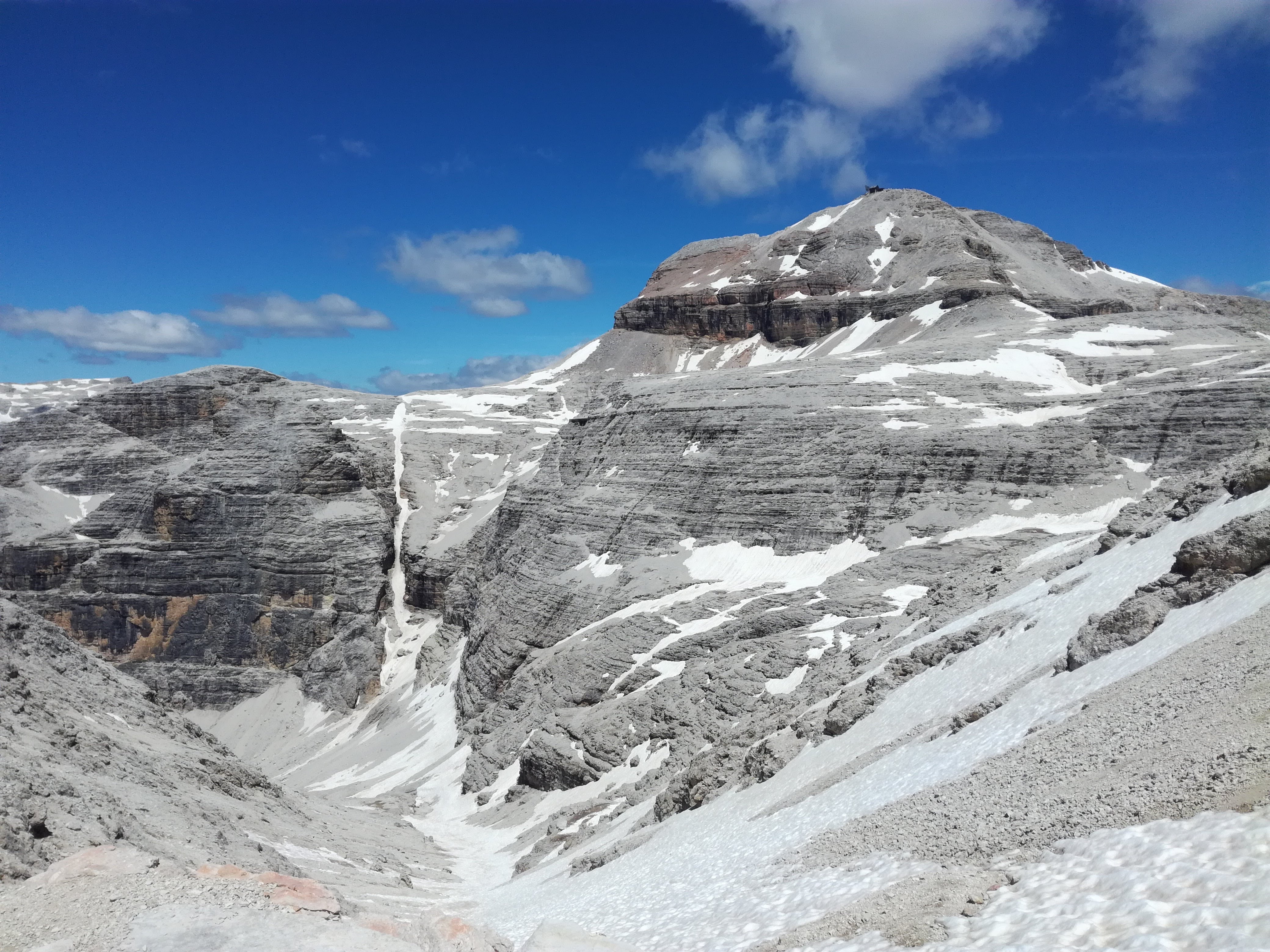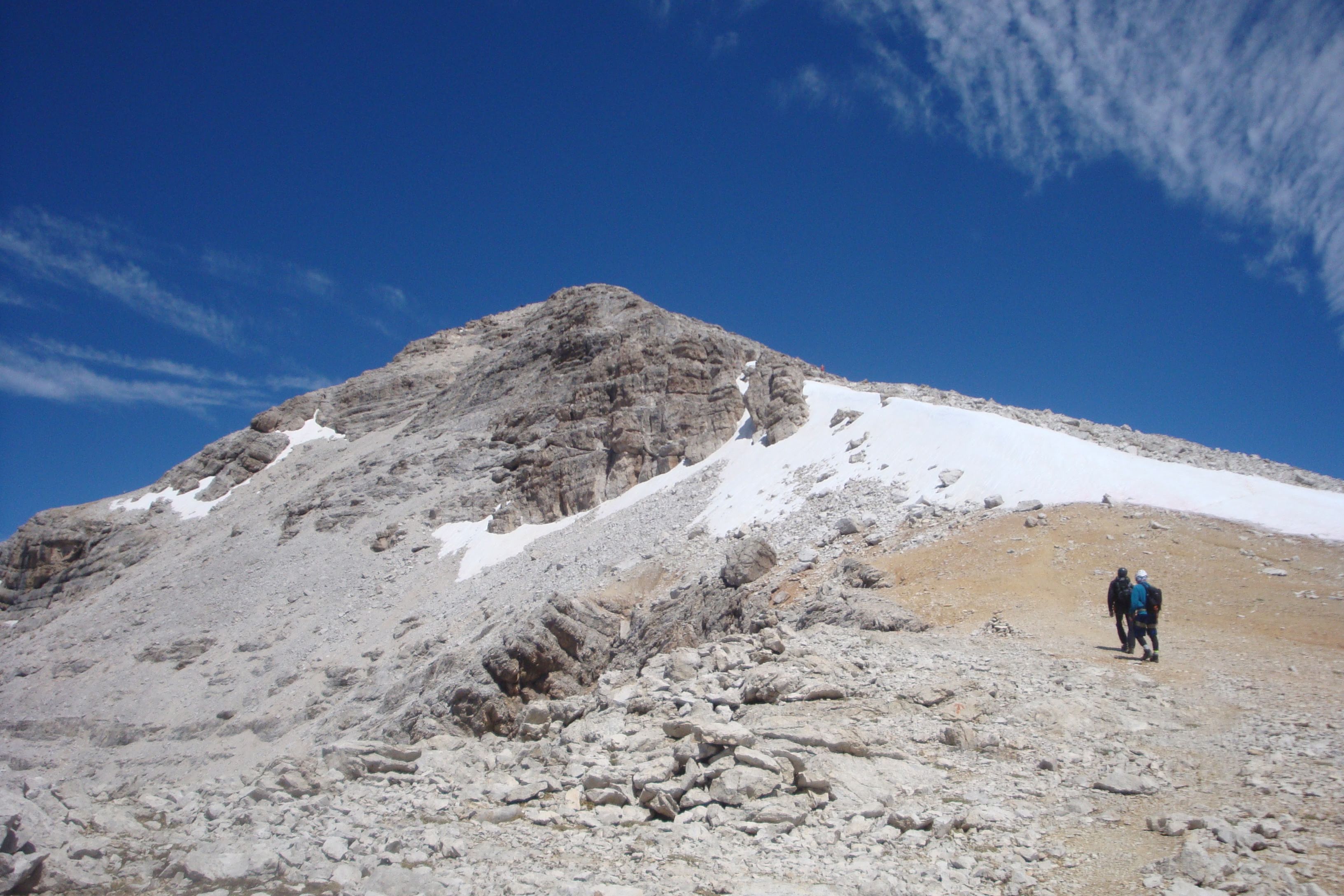 Kończąc wspinaczkę po jej krawędziach znaleźliśmy się na zboczu ze ścieżką prowadzącą pomiędzy głazami dolomitu na sam szczyt Piz Boe.
