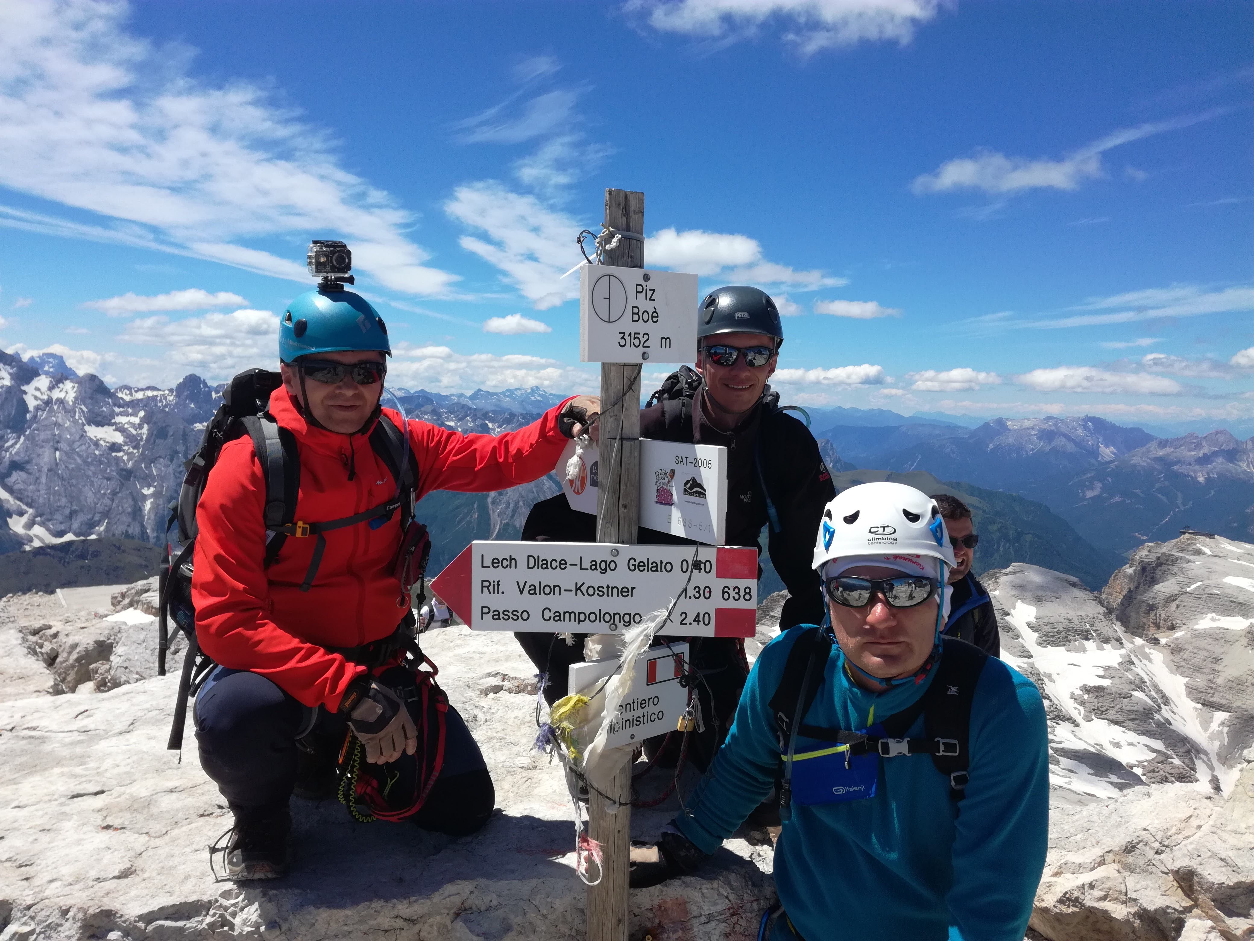 Drugi dzień wyjazdu pobudka o godz 4.30. Pelas jako kierownik proponuje na dzisiaj via ferratę Cesare Piazzetta z wejściem na Piz Boe (3152 m npm) .Droga ta uznawana jest za jedną z najtrudniejszych w Dolomitach –w zależności od opisu jest na drugim albo trzecim miejscu. Oczywiście akceptujemy ten wybór i po śniadaniu pakujemy plecaki nie zapominając włożyć do nich dobrego Raciborskiego piwka ( w celu ugaszenia pragnienia po zdobyciu Piz Boe :).