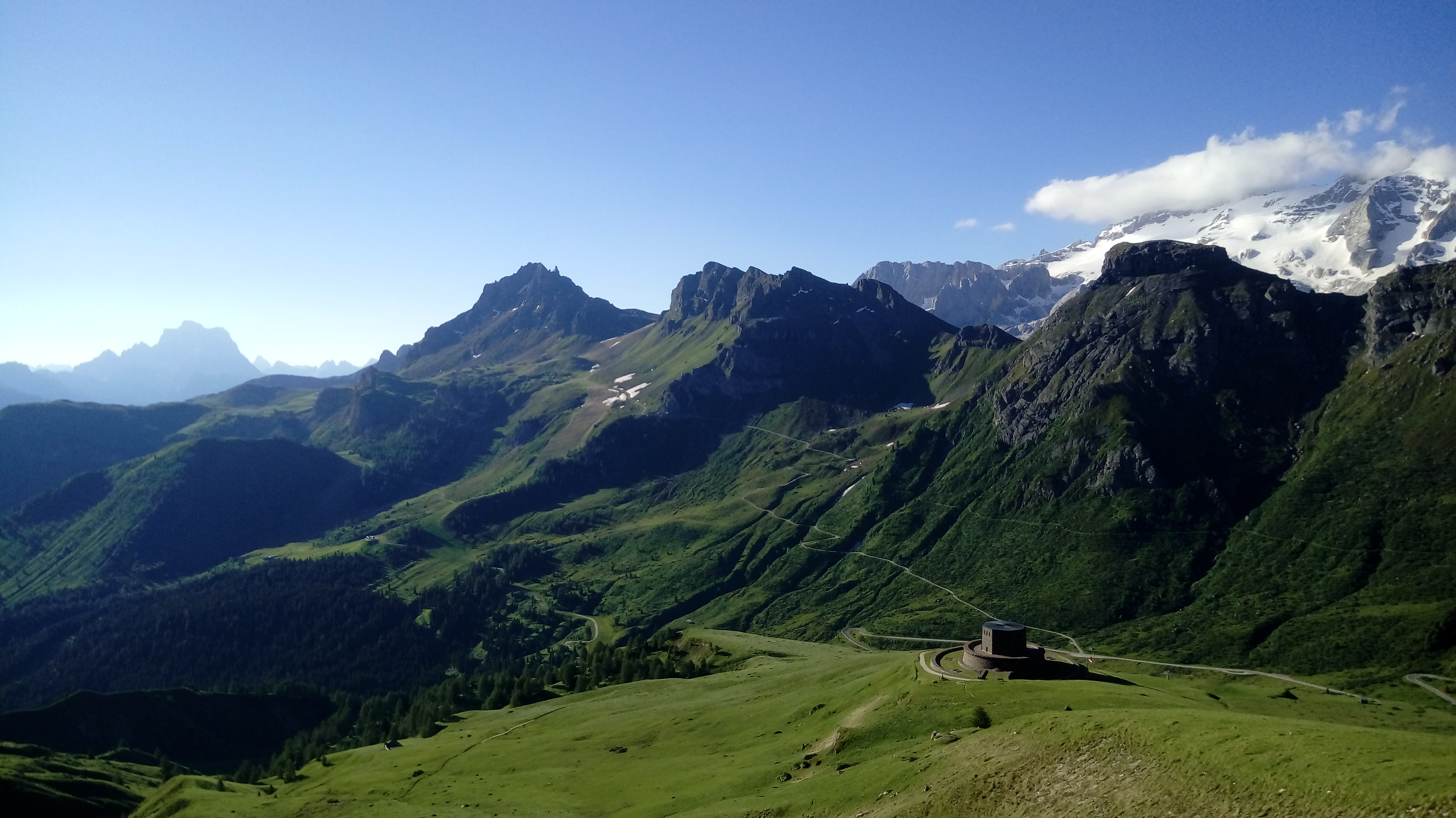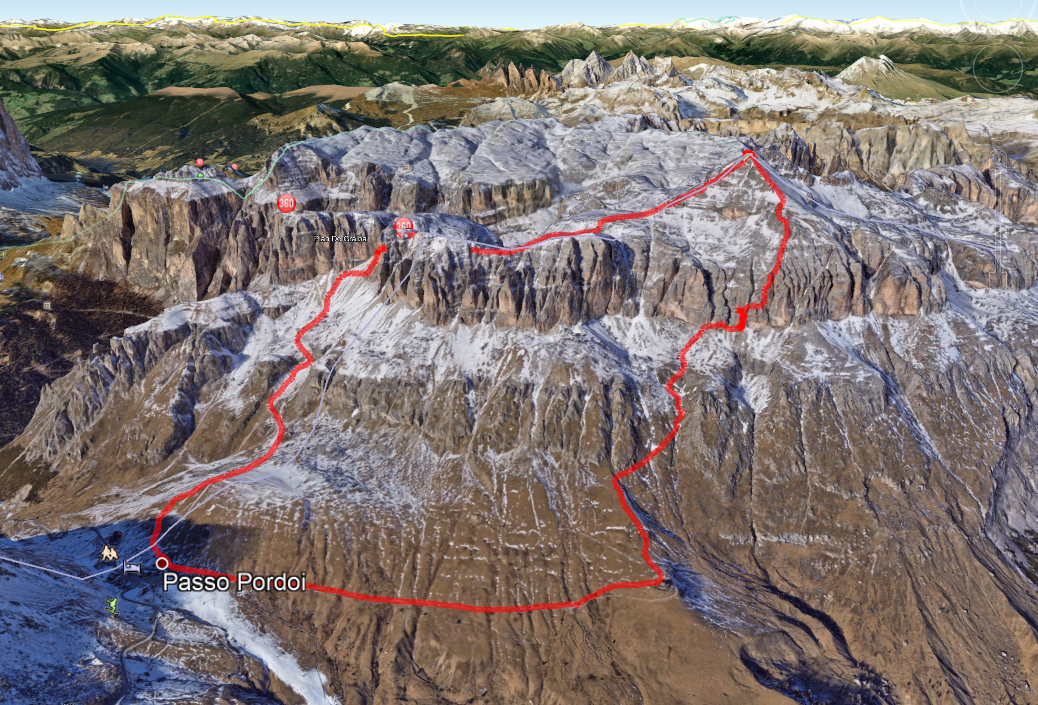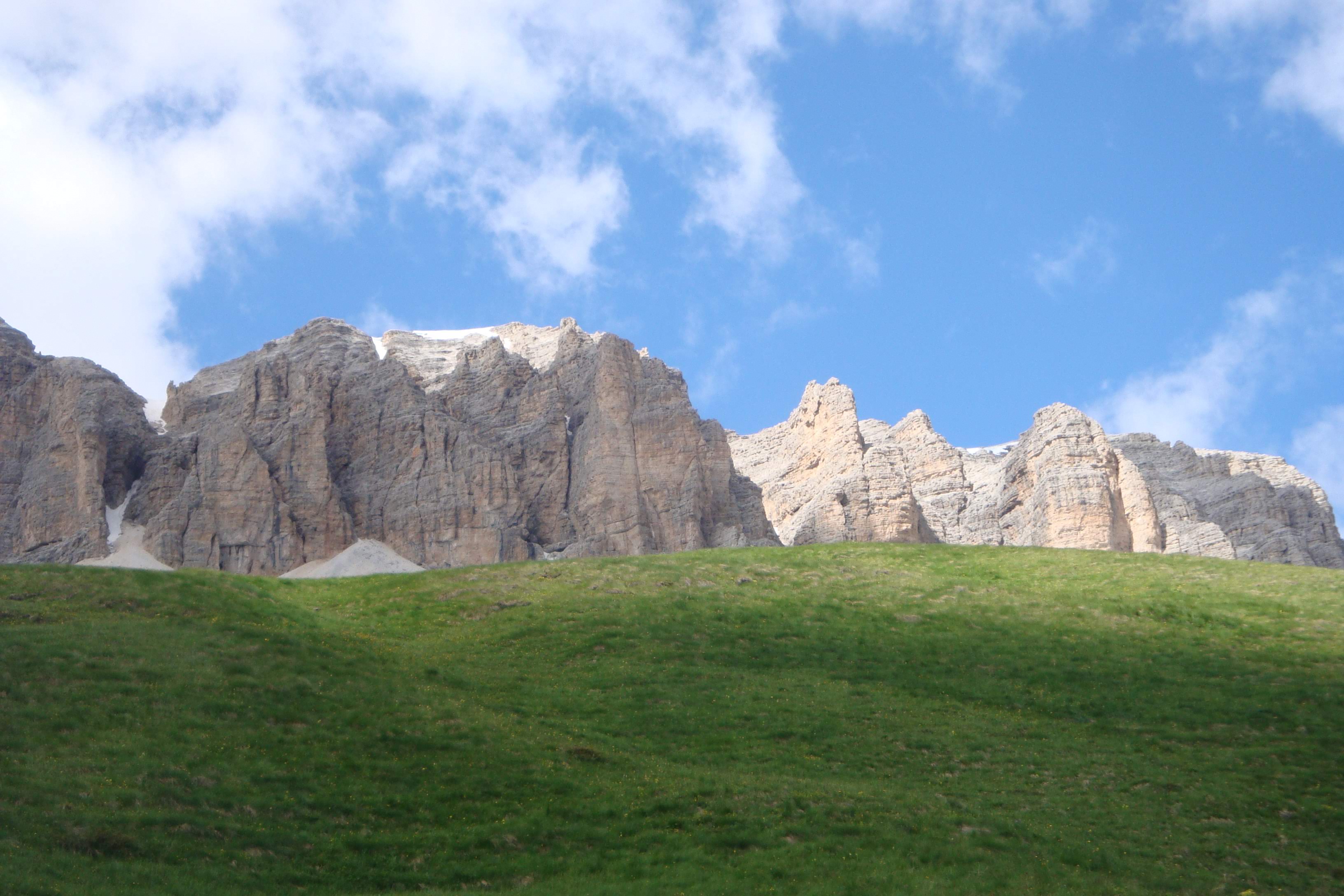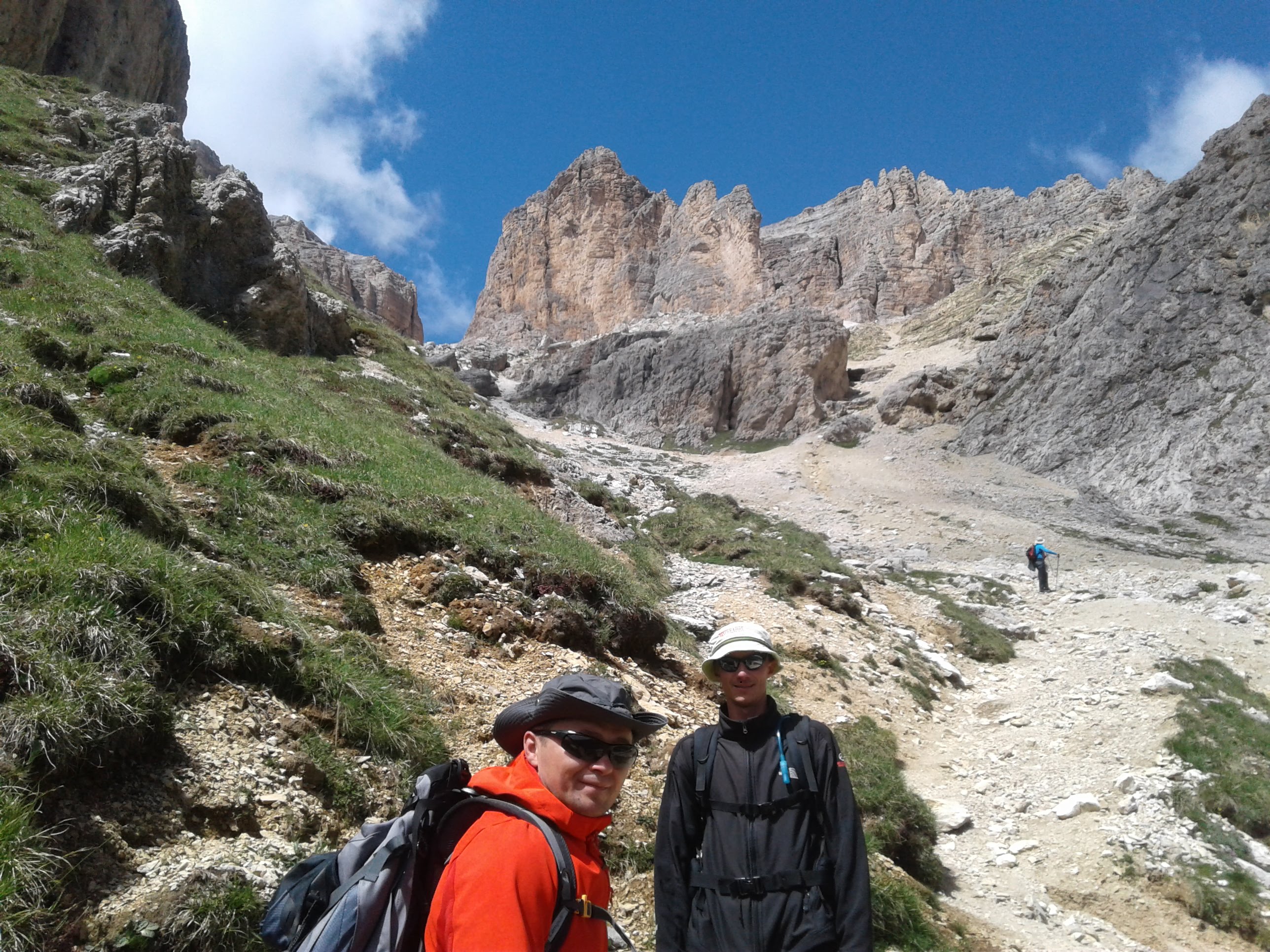 Wymijając powolne wycieczki turystów ruszyliśmy po płaskowyżu podziwiając okoliczne widoki. W oddali widniała przełęcz Pordoi, a po przeciwnej stronie piramidka szczytu Piz Boe, od którego znacznie się oddalaliśmy. doszliśmy do schroniska Forcella Pordoi skąd piargowym trawersem zeszliśmy na sam dół. Przemierzając zieloniutkie wzniesienia stanowiące podnóże pionowych ścian masywu zachwycaliśmy się przebytą trasą. Zmierzay w kierunku parkingu gdzie kończymy dzisiejszą wycieczkę.