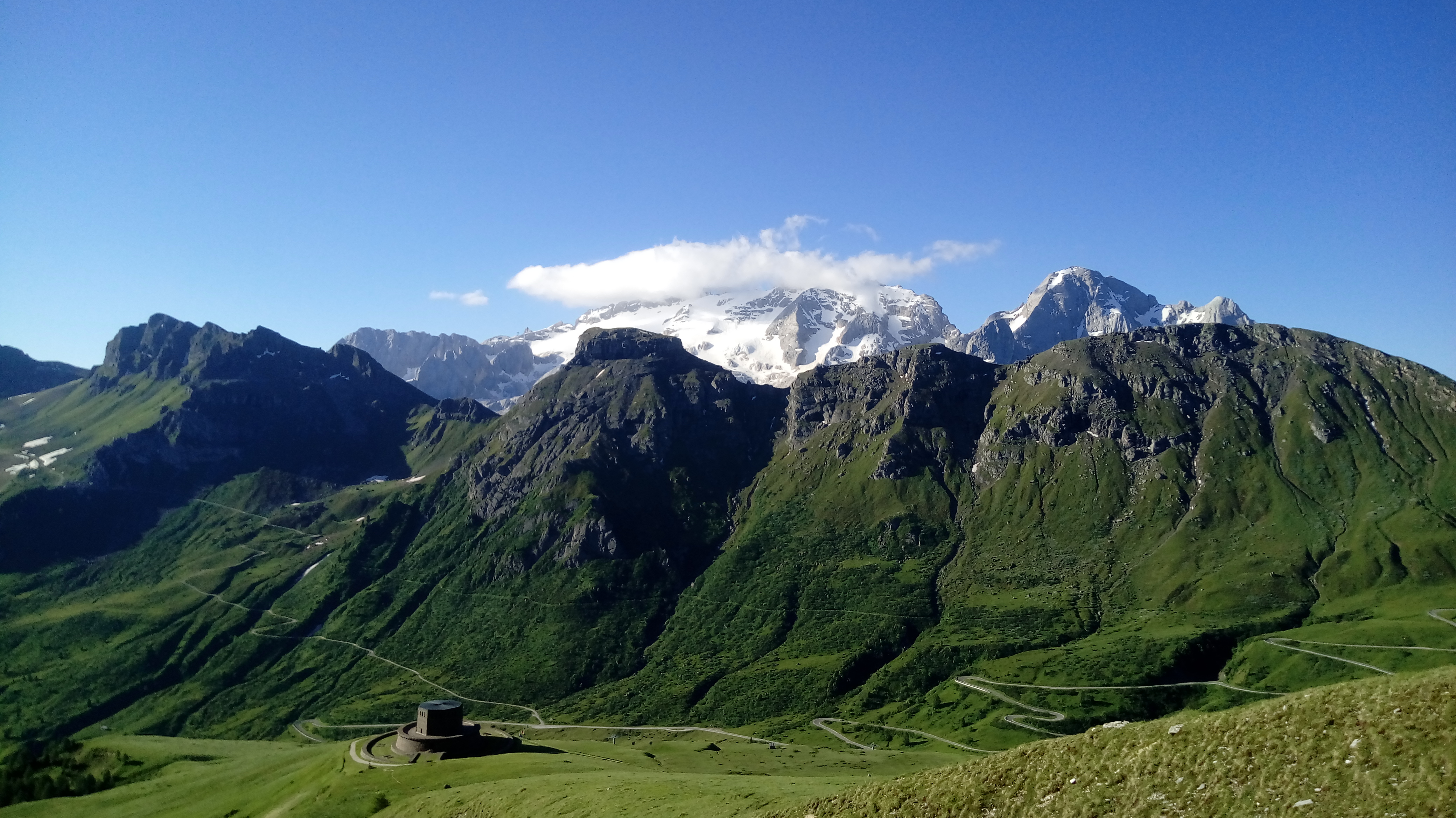 Za cmentarzem kierujemy się ścieżką w stronę podnóża płaskowyżu. Mamy wspaniałą pogodę i możemy podziwiać piękny widok na masyw Marmolady. Po około półtorej godziny docieramy do początku ferraty.
