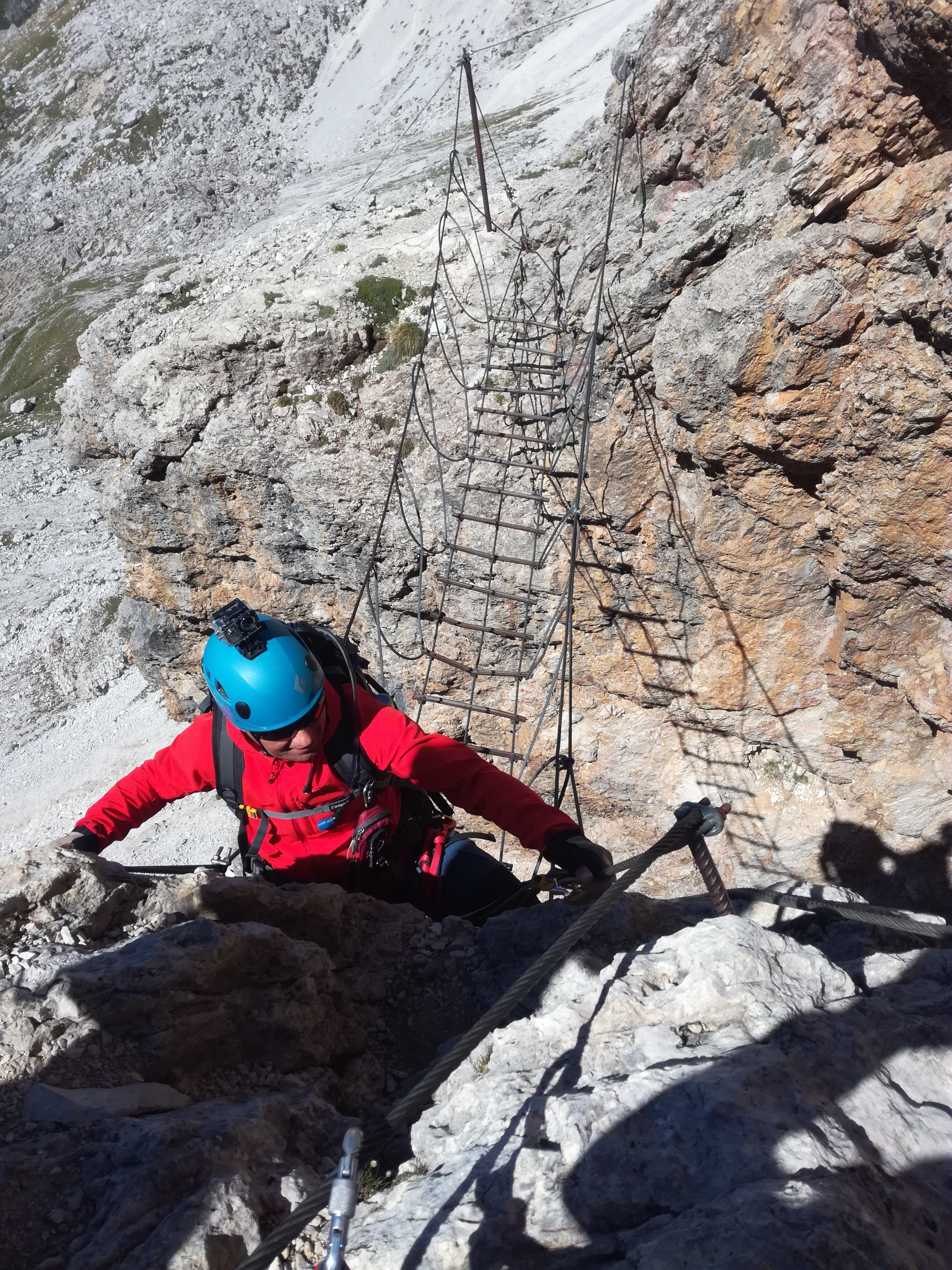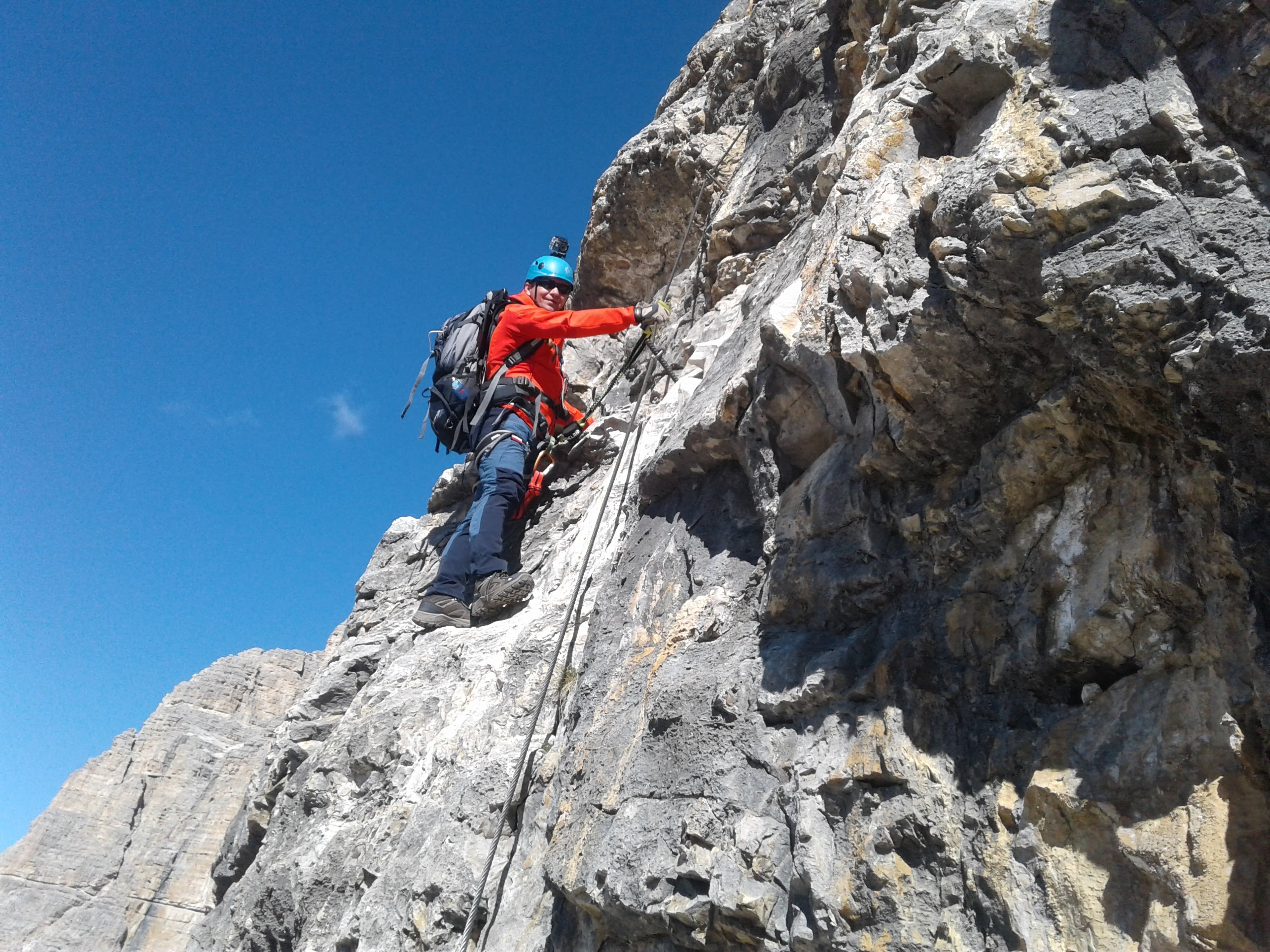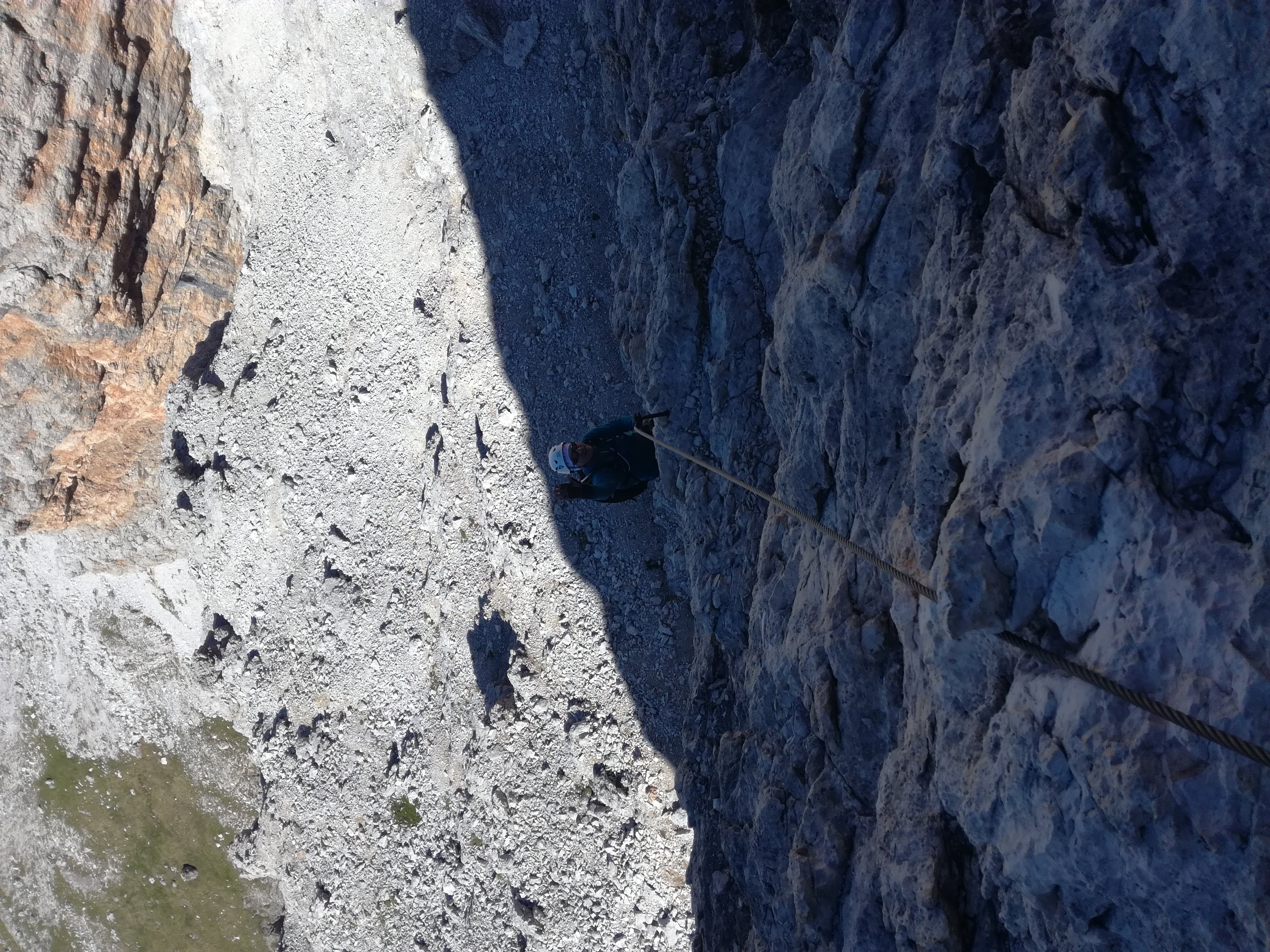 Wspinaczka po ferracie Cesare Piazzetta dała nam niesłychaną przyjemność. Po zdobyciu stromej przeszkody, maszerowaliśmy po kolejnym odcinku podejściowym charakteryzującym się brakiem ubezpieczeń. Dotarliśmy do łatwej i krótkiej rynny w poszarpanej skale.