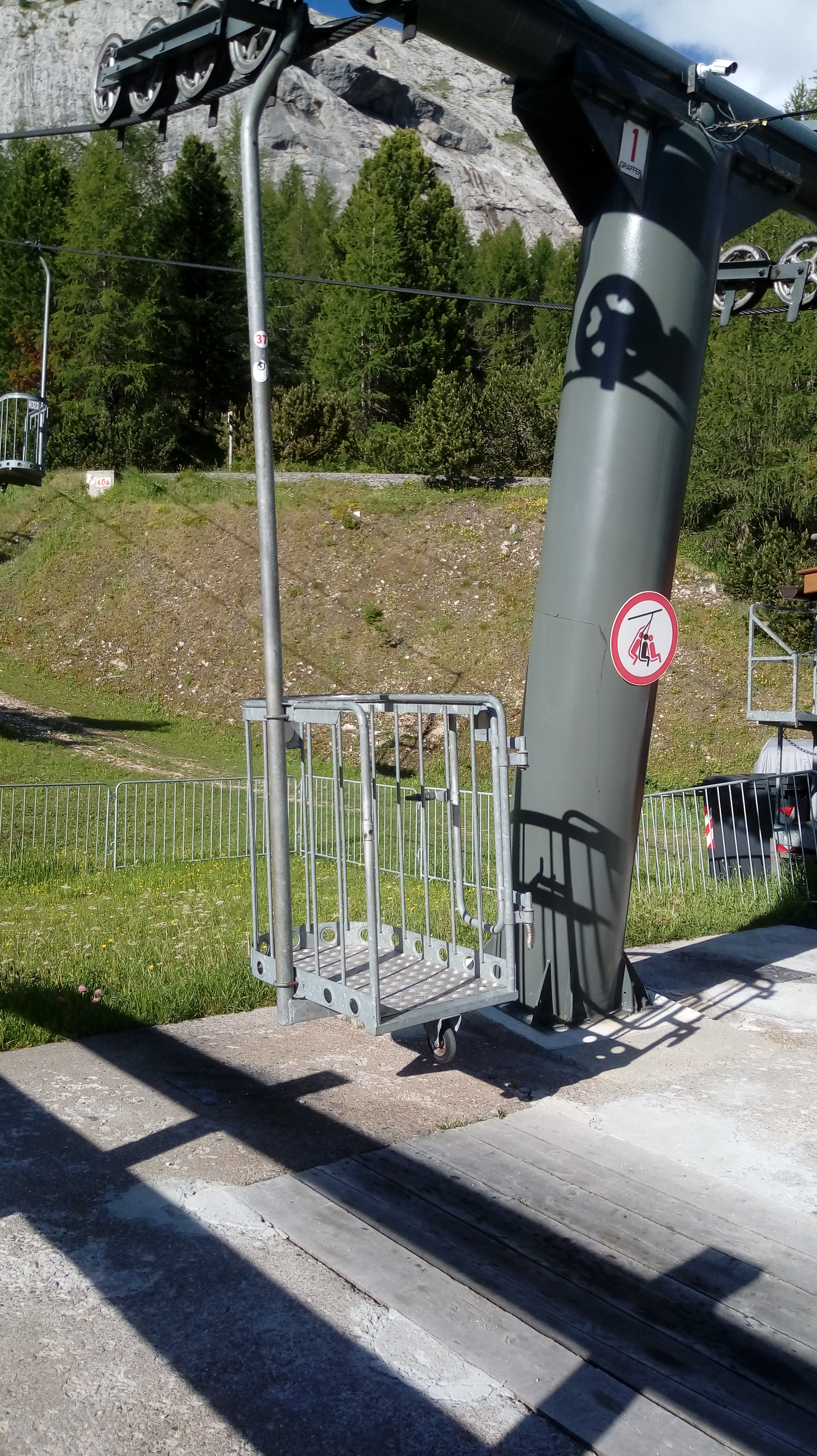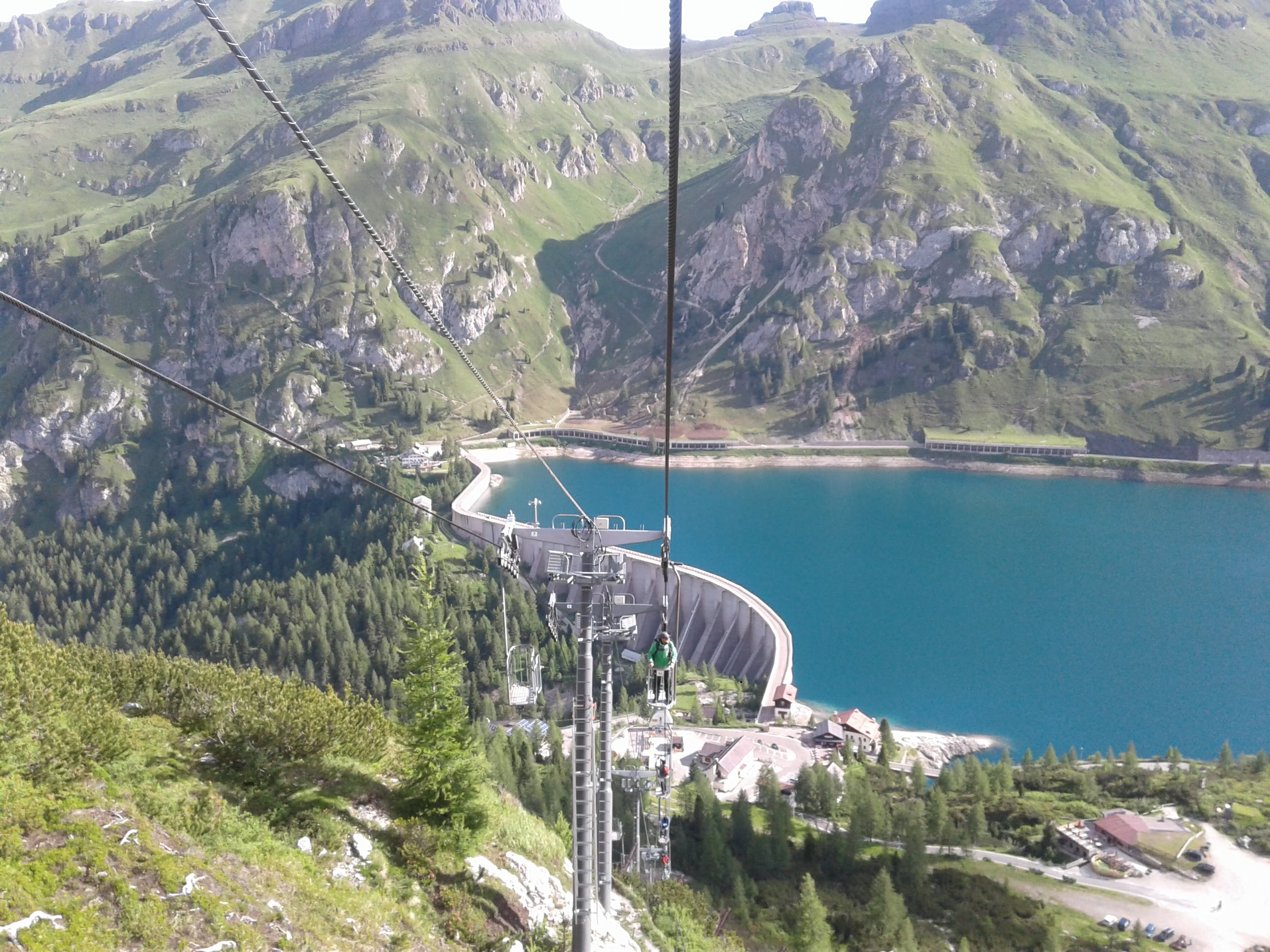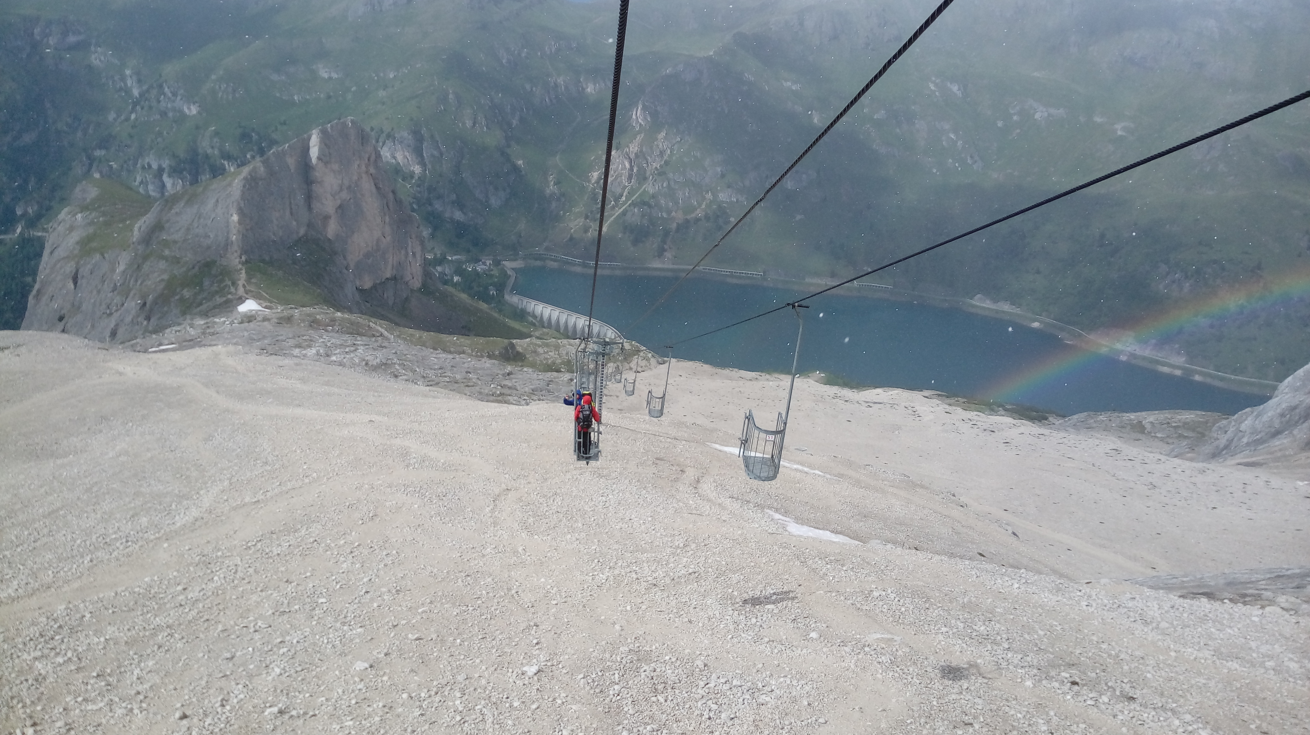 Wsiadamy, a raczej wbiegamy do jakże osobliwych wagoników kolejki linowej Fedaia Pian Fiacconi , którą dostajemy się na wysokość 2626 m n.p.m., . Zwolennikami kolejek nie jesteśmy, jednak możliwość pokonania trochę ponad 570 metrów przewyższenia w niezwykle krótkim czasie, sprawia że bez oporów podejmujemy decyzję o wsparciu się na tym odcinku jakże specyficzną kolejką.