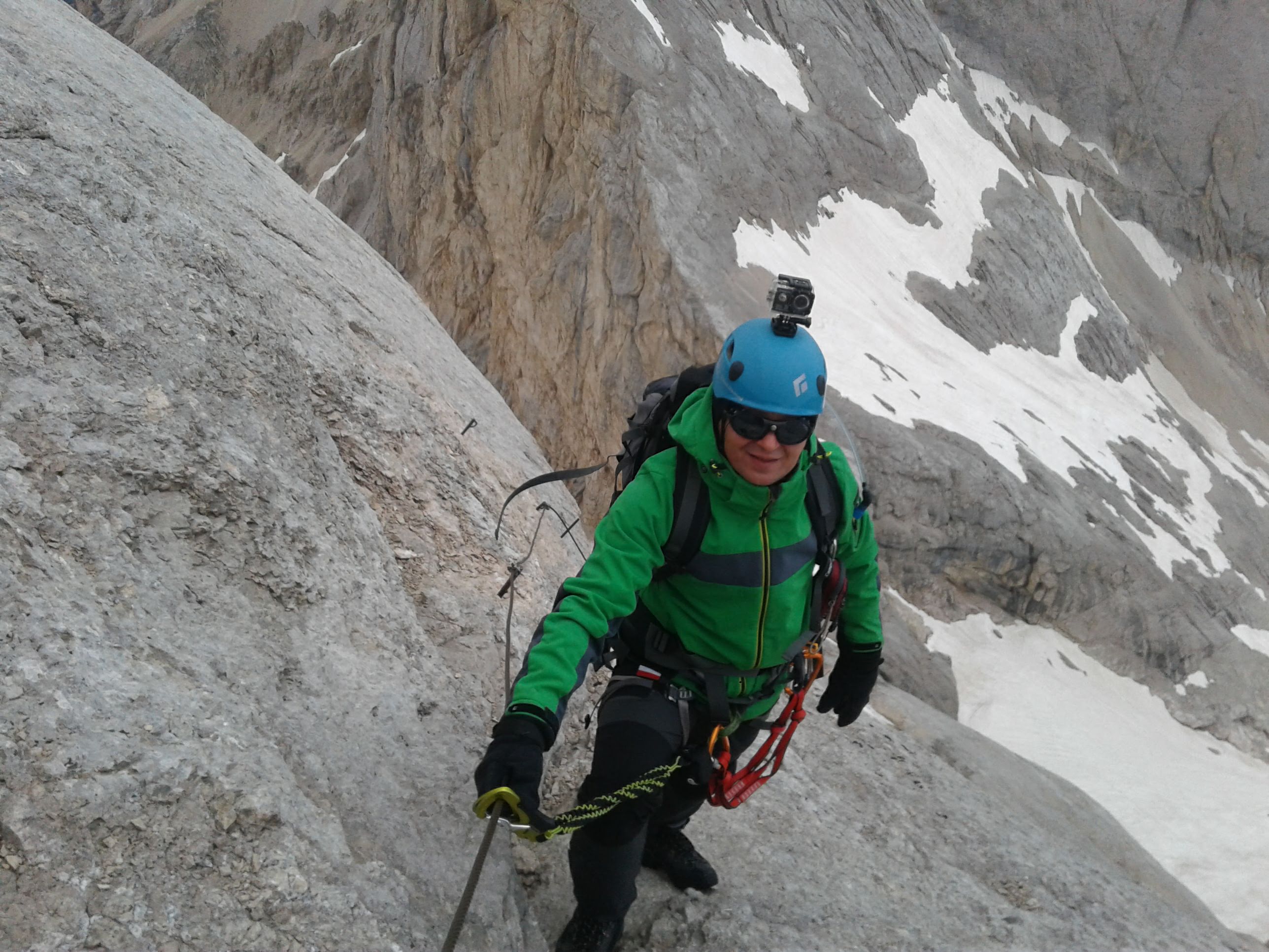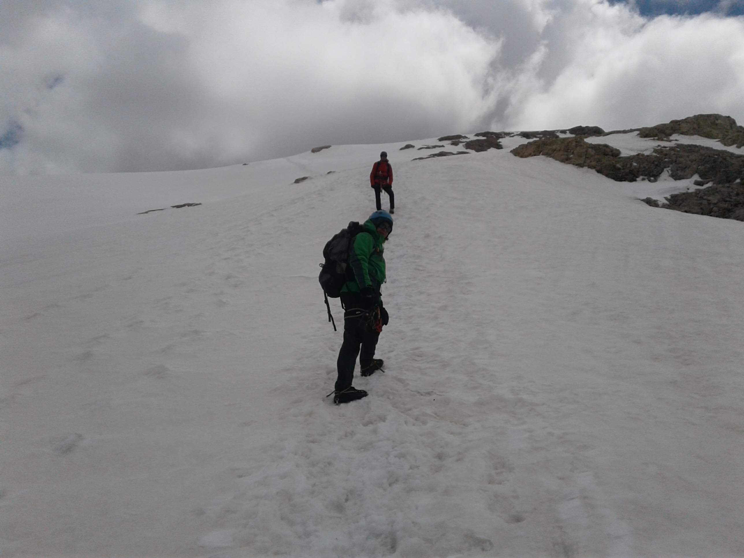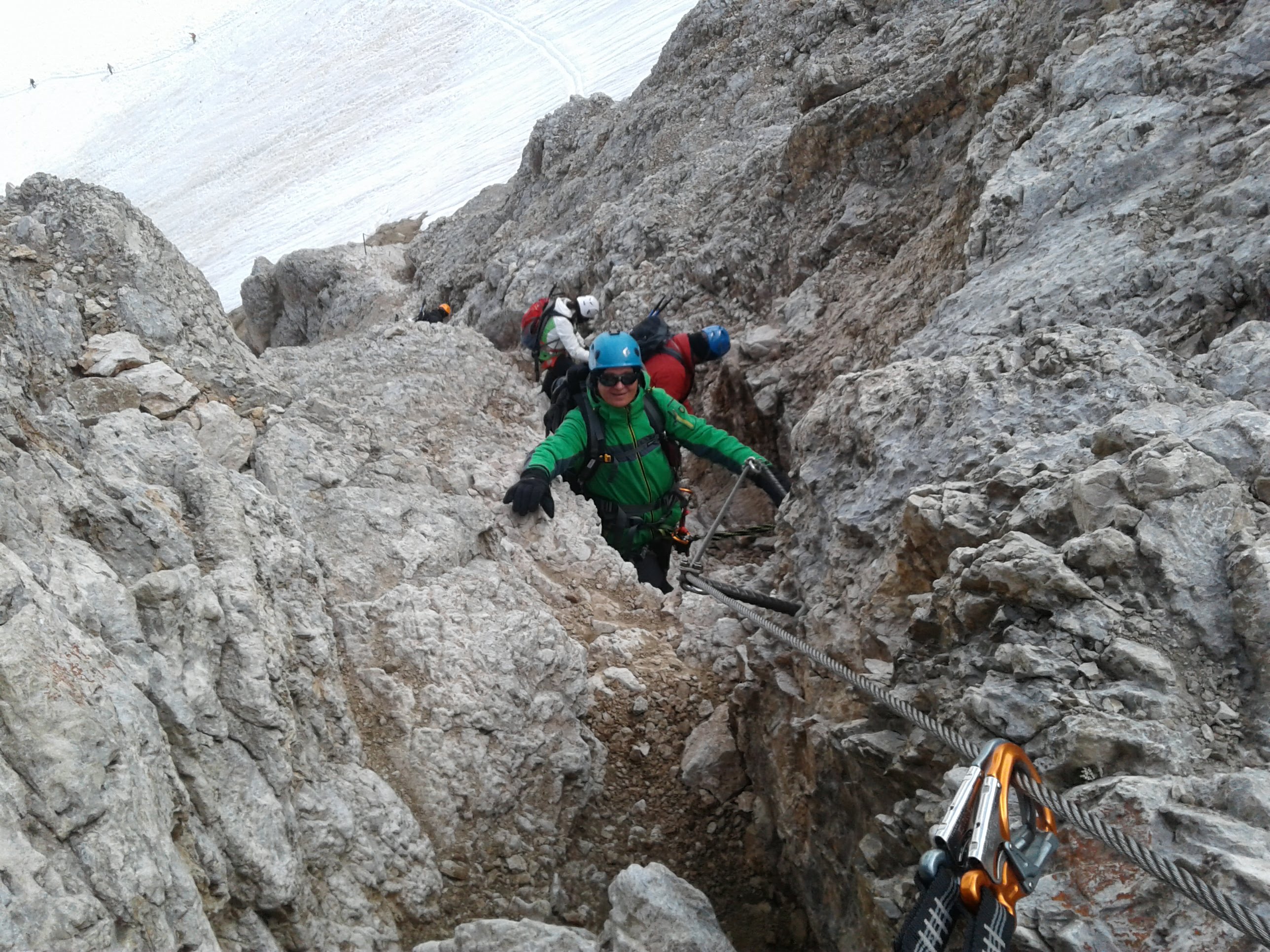 Po odpoczynku w schronisku związujemy się liną i rozpoczynamy zejście .Początkowo droga prowadzi śnieżnym polem po łagodnym grzbiecie, który jednak szybko się zwęża. Po niezbyt długim marszu dochodzimy do via feraty. Choć droga przebiega prawie pionowo nie stwarza większych trudności ze względu na liczne pręty i poręczówkę. Należy jednak uważać na luźne kamienie.