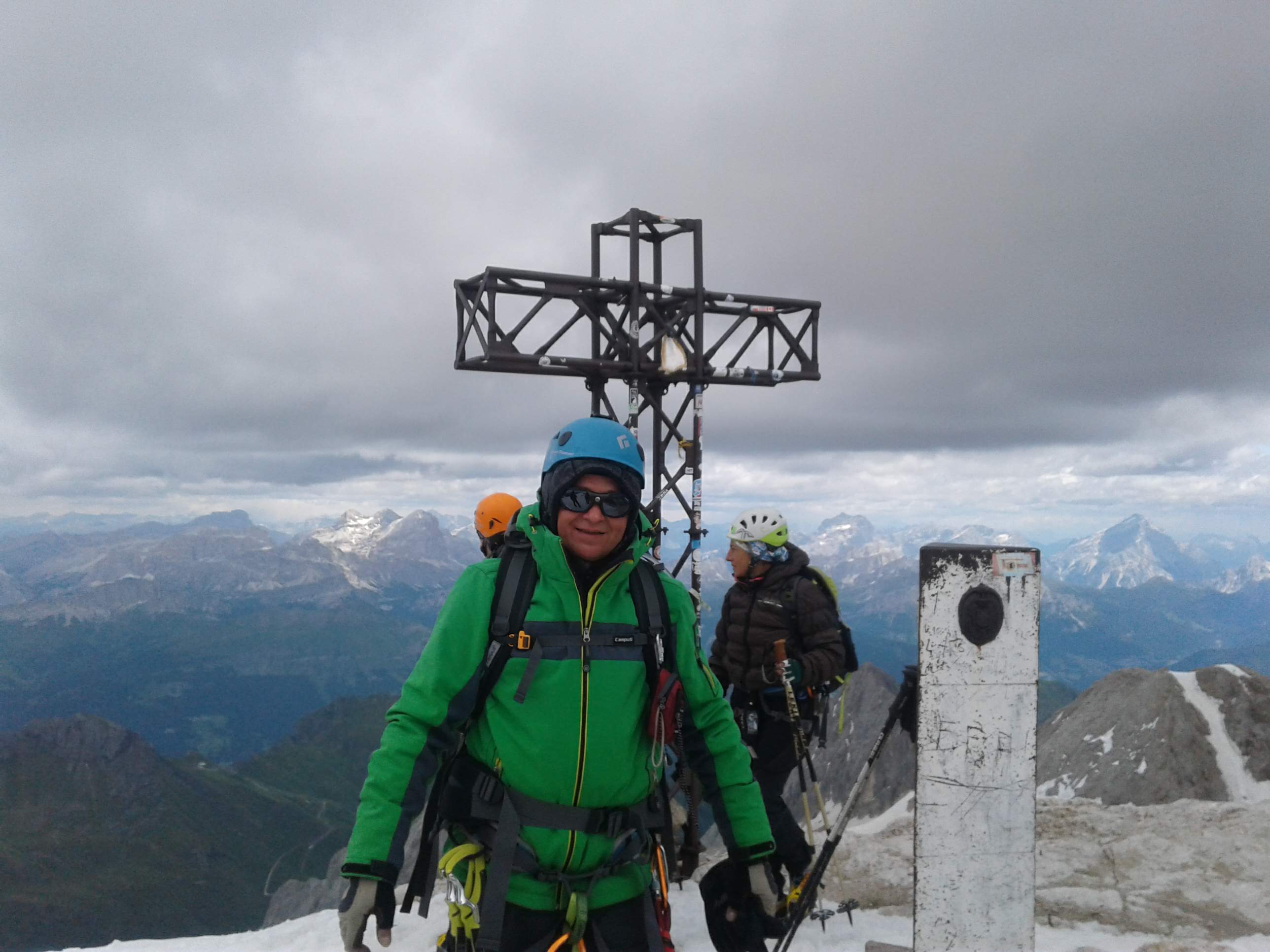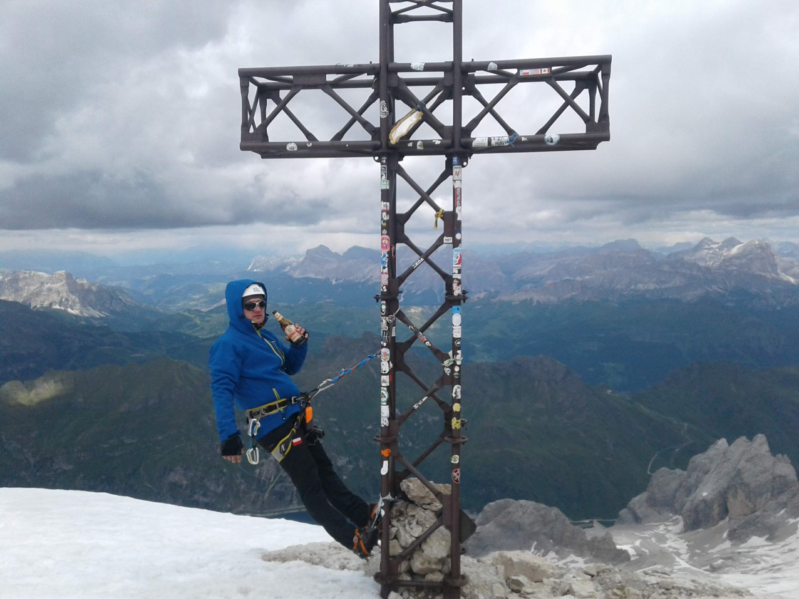 Jesteśmy, widoki przepiękne – Marmolada wystaje 3343 m ponad poziom morza. Na szczycie zaskakuje mnie widok brzydkiej budy obitej blachą, jest to schronisko Capanna Punta Penia. Jest zimno,wieje wiatr więc mimo wszystko wchodzimy do środka i jestem mile zaskoczony. Wnętrze przytulne i ciepłe, gospodarz bardzo sympatyczny. Ceny adekwatne do wysokości.