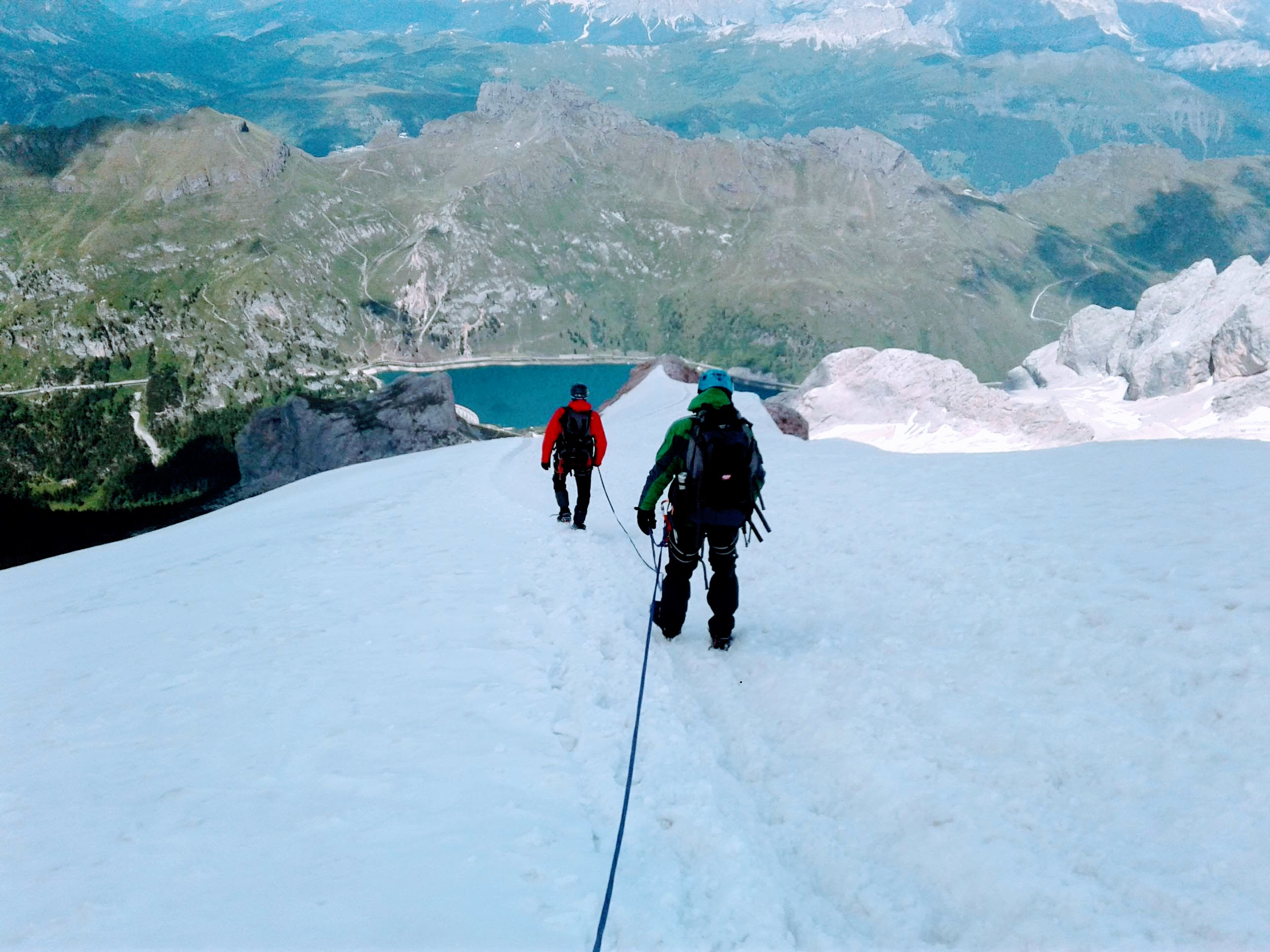 Dochodzimy do miejsca, gdzie od lodowca dzieli nas już tylko kilka metrów wysokości, tu kończy się via ferata. Związani liną, dużymi zakosami podążamy w kierunku Pian Fiacconi, którą zjeżdżamy w dół.