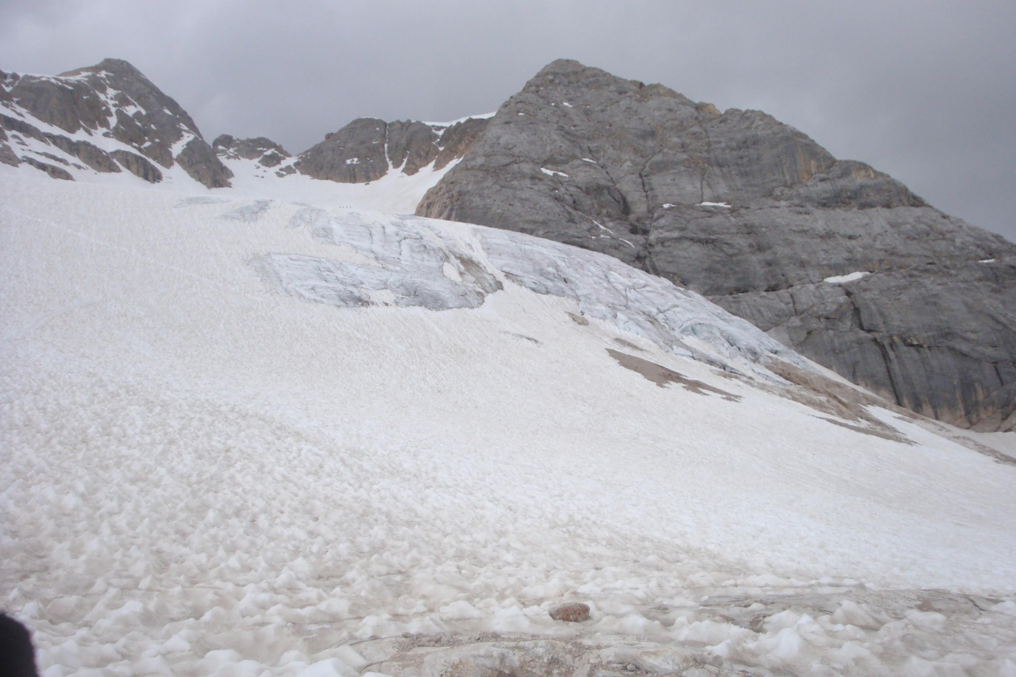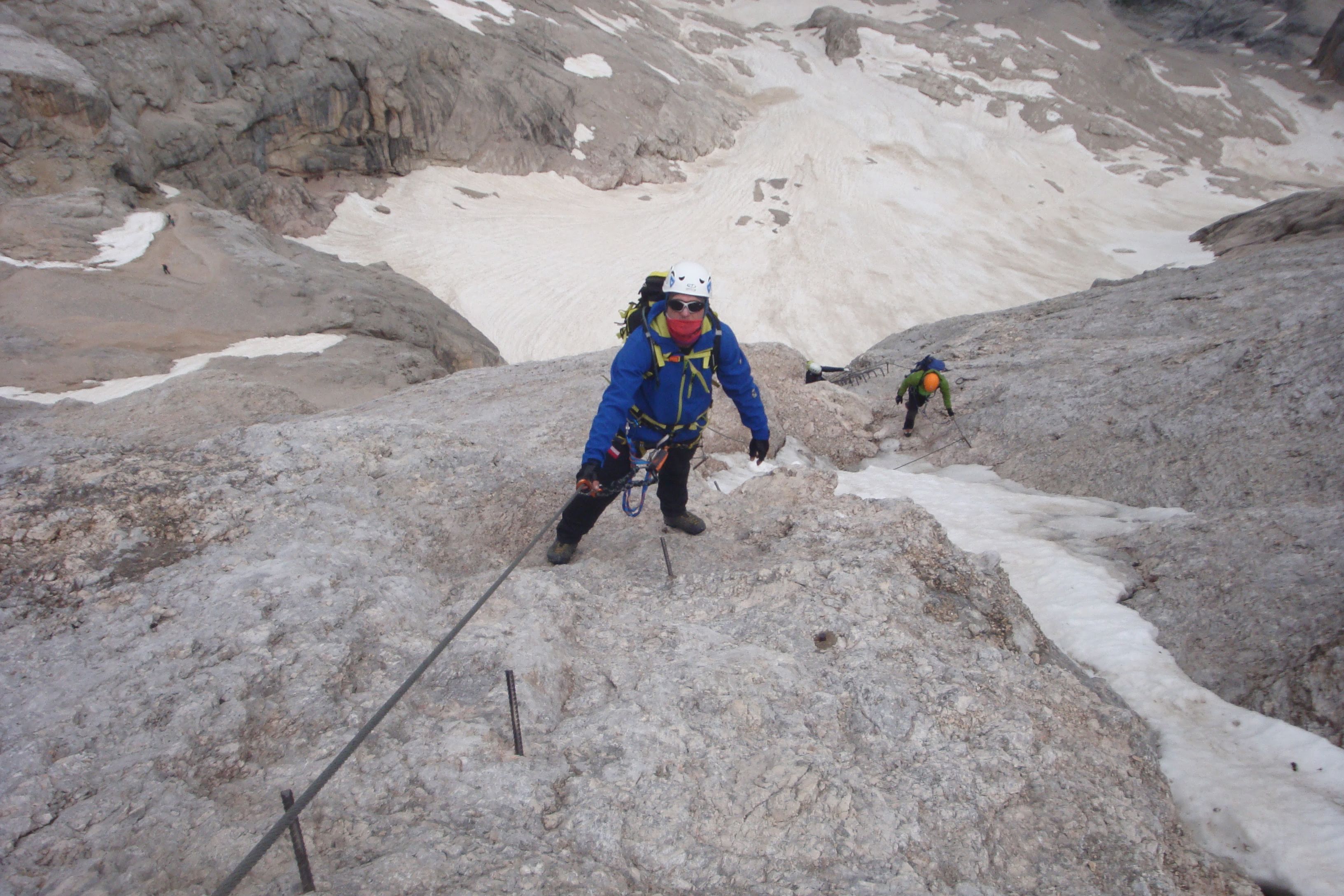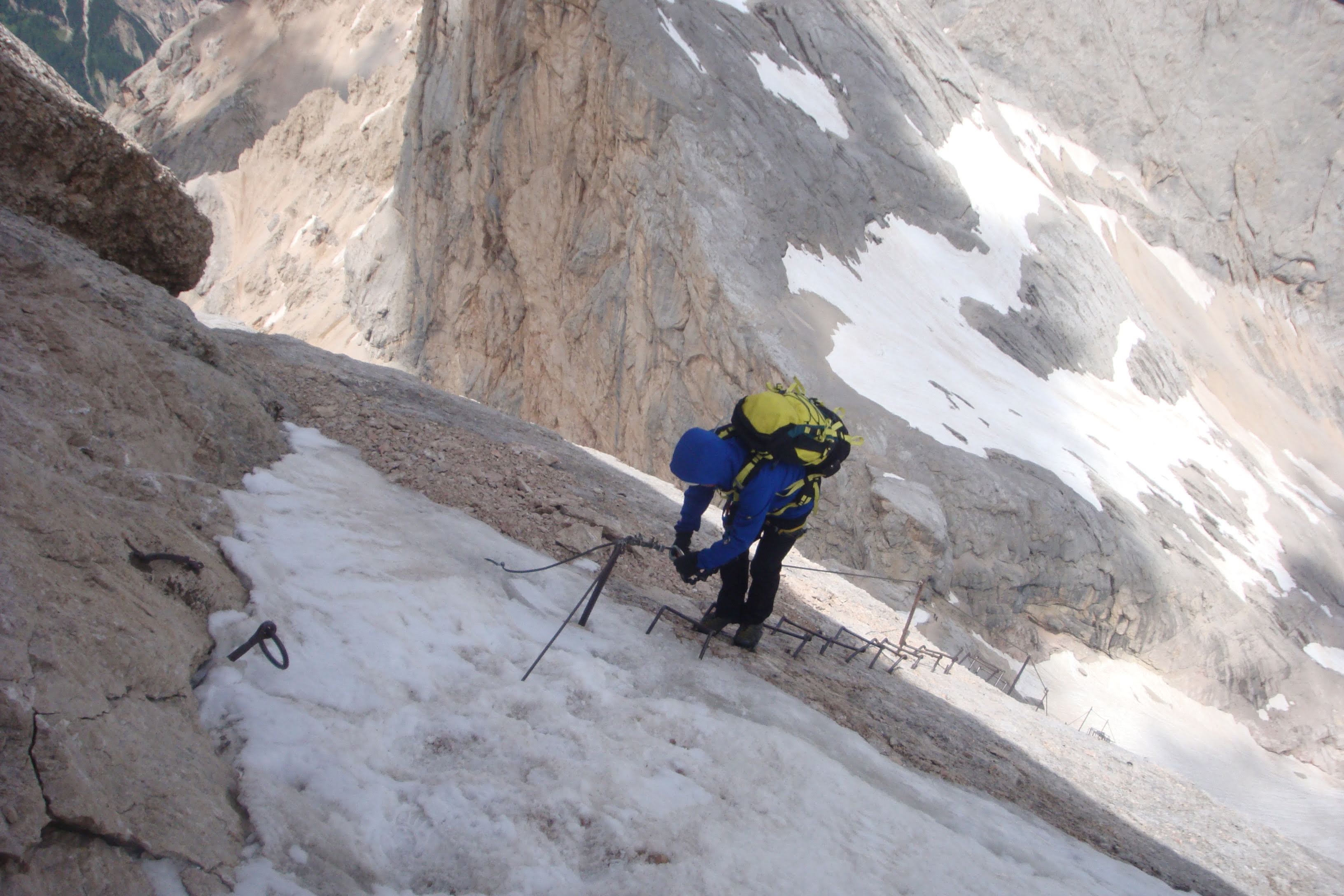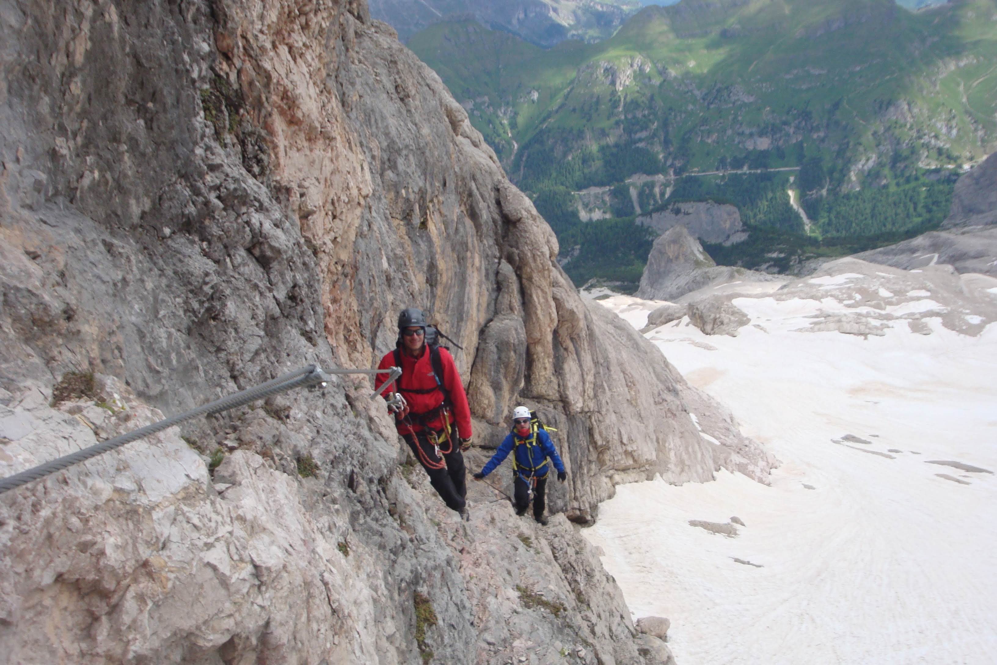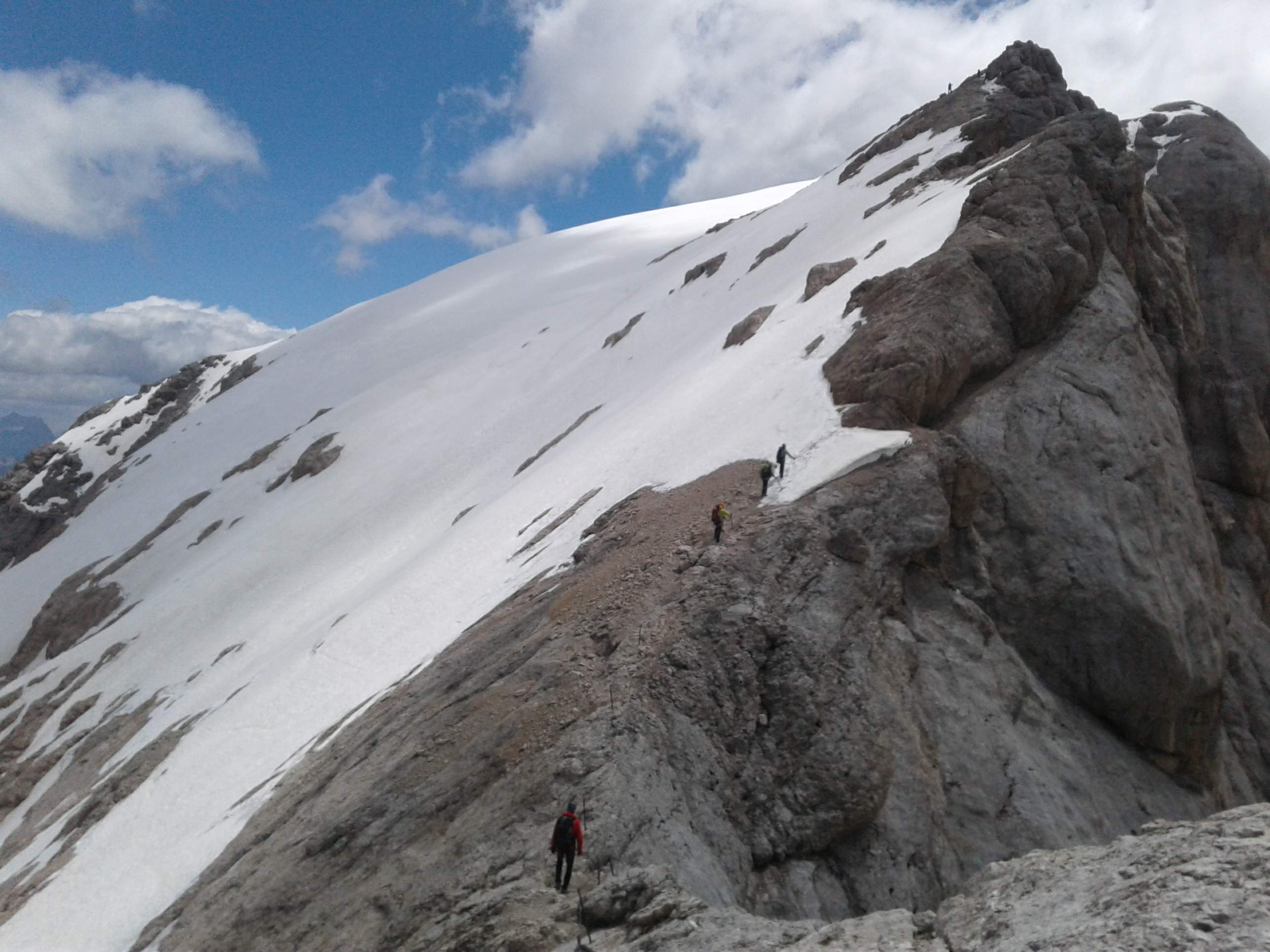 Mijając niewielkie łaty śniegu trawersujemy grań Punta Penia, którą następnie przemierzać będziemy ferratą. Droga prowadzi aż za charakterystyczne skalne żebro i dalej skręca w lewo, gdzie czekają nas kolejne atrakcje. Po niewiele ponad godzinie od opuszczenia wagonika docieramy do Ghiacciai del Vernel małego lodowca, który przypomina wielkie śnieżne pole i jest prosty technicznie.