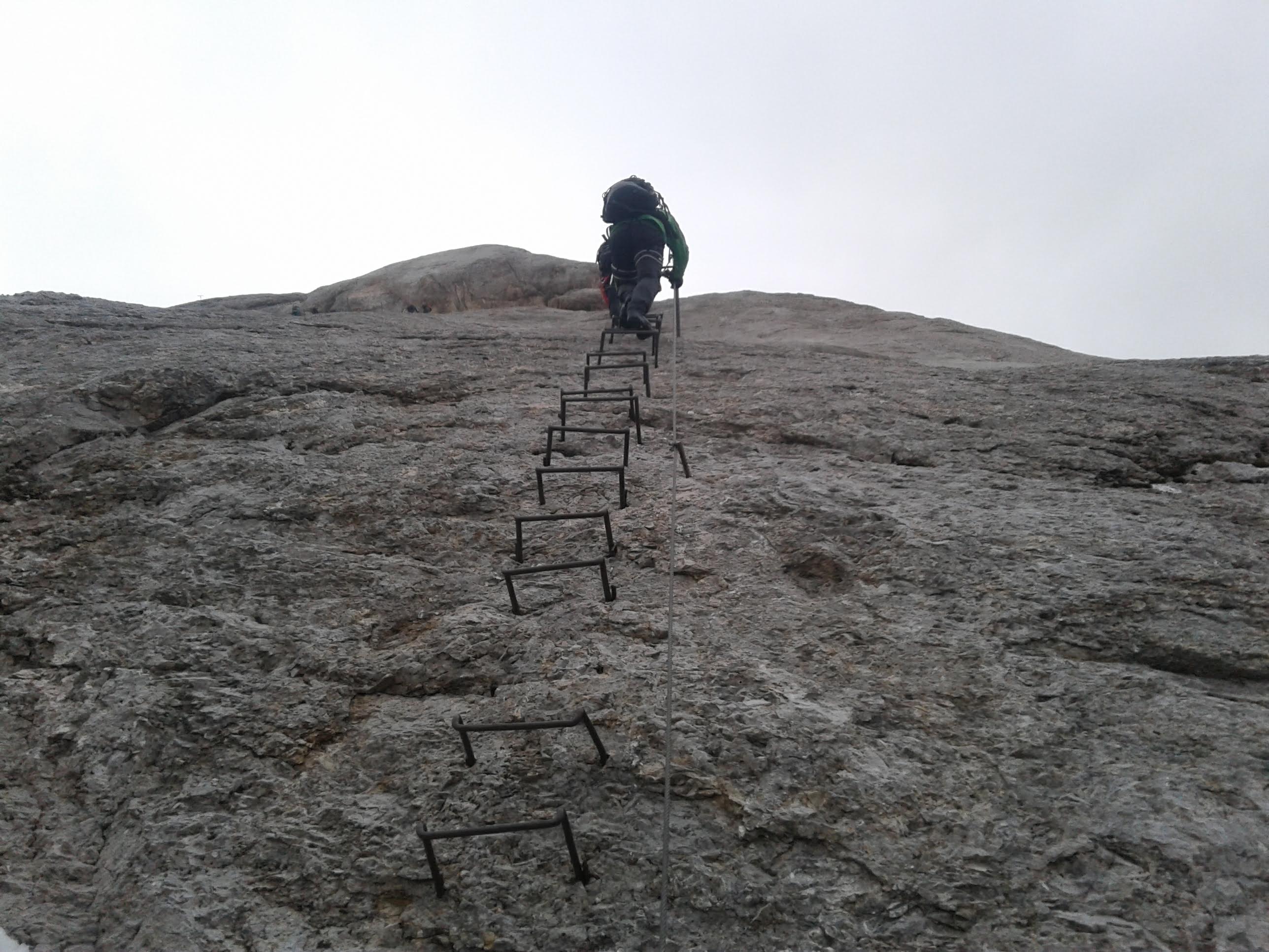 Teraz na szlaku przeważają są ogromne powierzchnie gładkiej, pochyłej skały, pokonujemy ją za pomocą bardzo długich drabin. Dochodzimy do krawędzi grani, jej nachylenie nie jest stałe, strome odcinki przeplatają się z łagodnymi. Droga jest bardzo dobrze ubezpieczona, ekspozycja znaczna. Wspinaczka ostrzem grani nie jest specjalnie kłopotliwa- cały czas towarzyszą nam ubezpieczenia- czasem bardziej męczące jest nieustanne przepinanie karabinków niż samo wejście. Jeden z odcinków via feraty jest niemal pionowy, jednak stalowe klamry i rozciągnięta wzdłuż nich poręczówka ułatwiają pokonanie ściany.