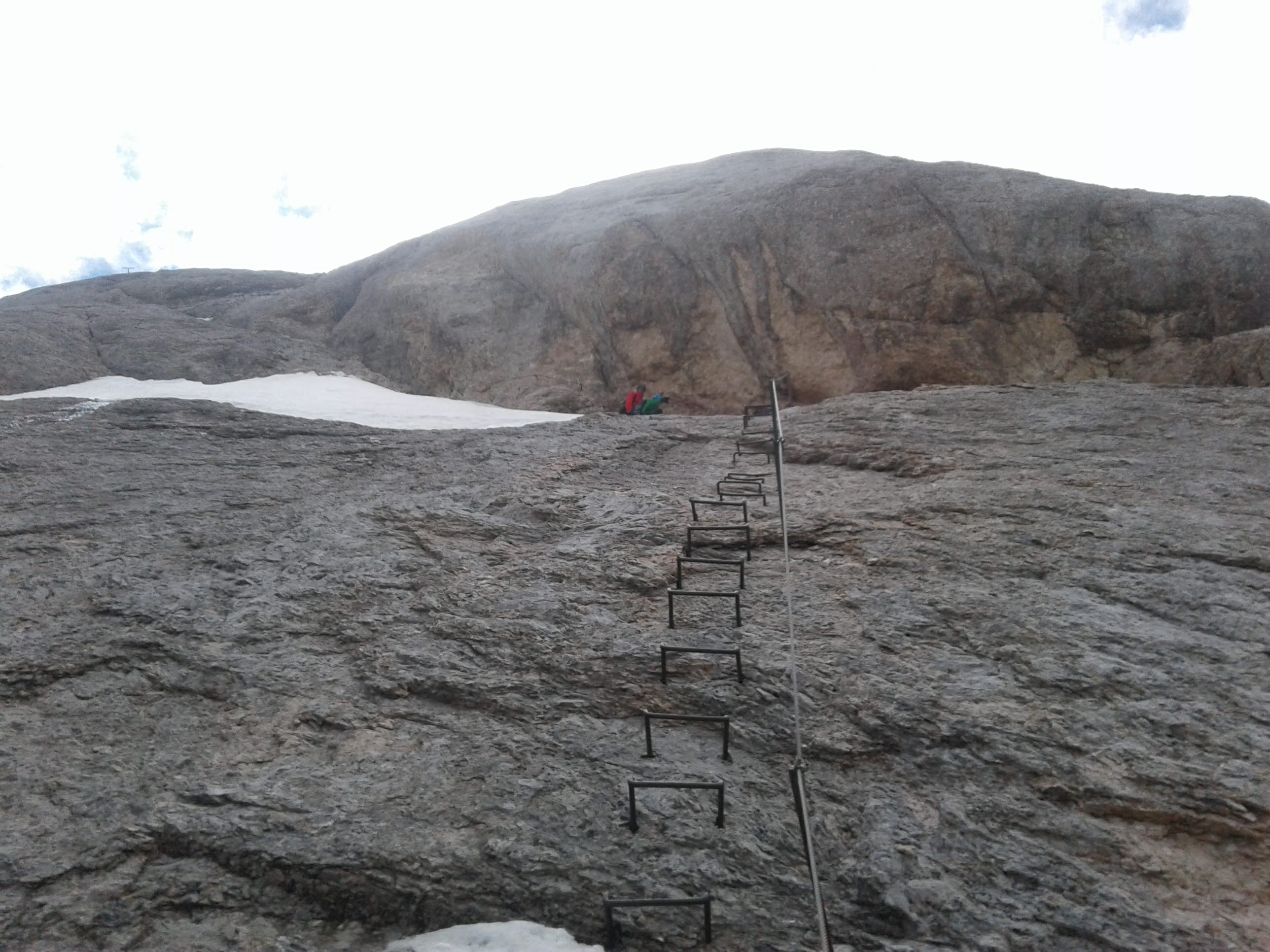 Wydeptaną przez jego środek ścieżką docieramy w miejsce gdzie zaczyna się ostre, dobrze ubezpieczone podejście w kierunku przełęczy. Właściwie można powiedzieć, że już za lodowcem zaczyna się ferrata, chociaż nominalnie zalicza się do niej tylko odcinek od przełęczy Forcellada (2896m.) Panuje tutaj niewielki tłok, naszą uwagę zwraca para Polskich turystów którzy ewidentnie nie sa przygotowani na to co ich dzisiaj czeka.