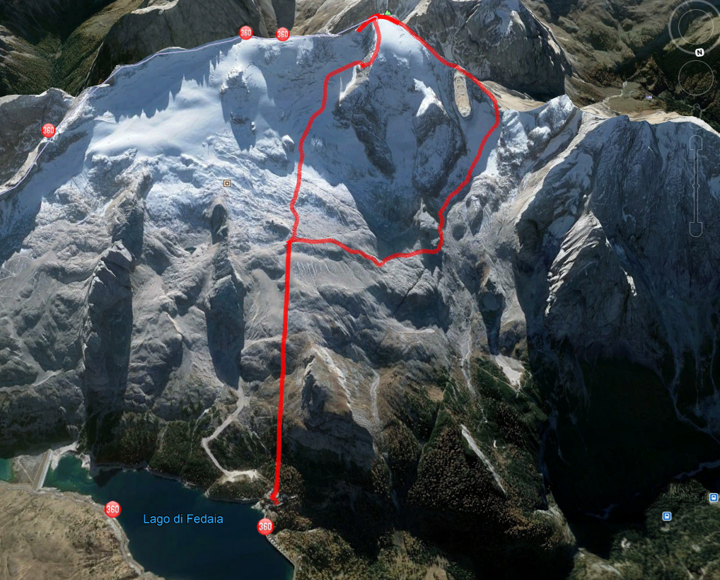 Grań staje się bardziej płaska, a do szczytu pozostało ok. 150 m przewyższenia. Droga jest rozległa, a zbocze niezbyt strome, łatwe do pokonania. Po krótkim marszu widać najwyższy wierzchołek Marmolady z umieszczonym na nim krzyżem.