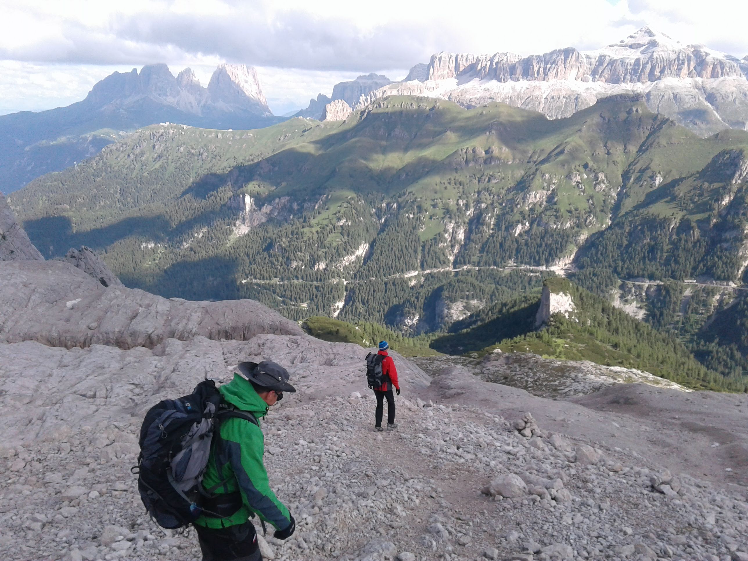 Wychodząc z kolejki, udajemy się na prawo. Droga sprowadza nas 100 m w dół, aby ominąć wielkie skały – potem wysokość trzeba będzie nadrobić. Ścieżka kluczy między zadziwiającymi ogładzeniami lodowcowymi w piarżystym terenie w stronę przełęczy Forcella Marmolada (2896 m n.p.m.).