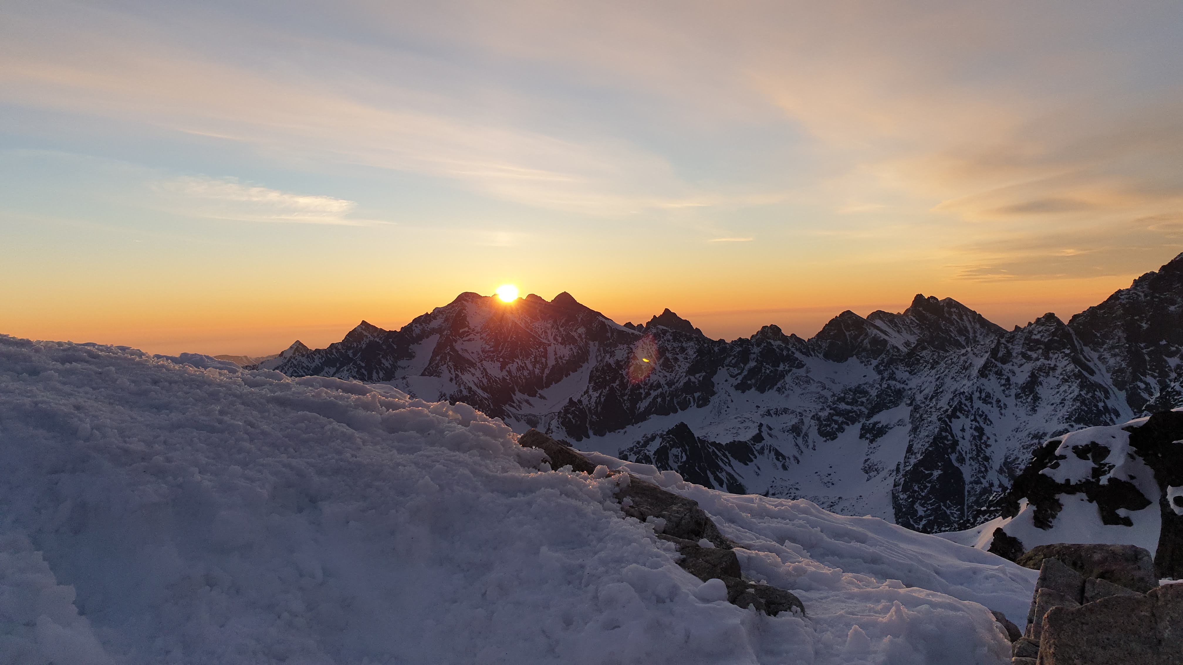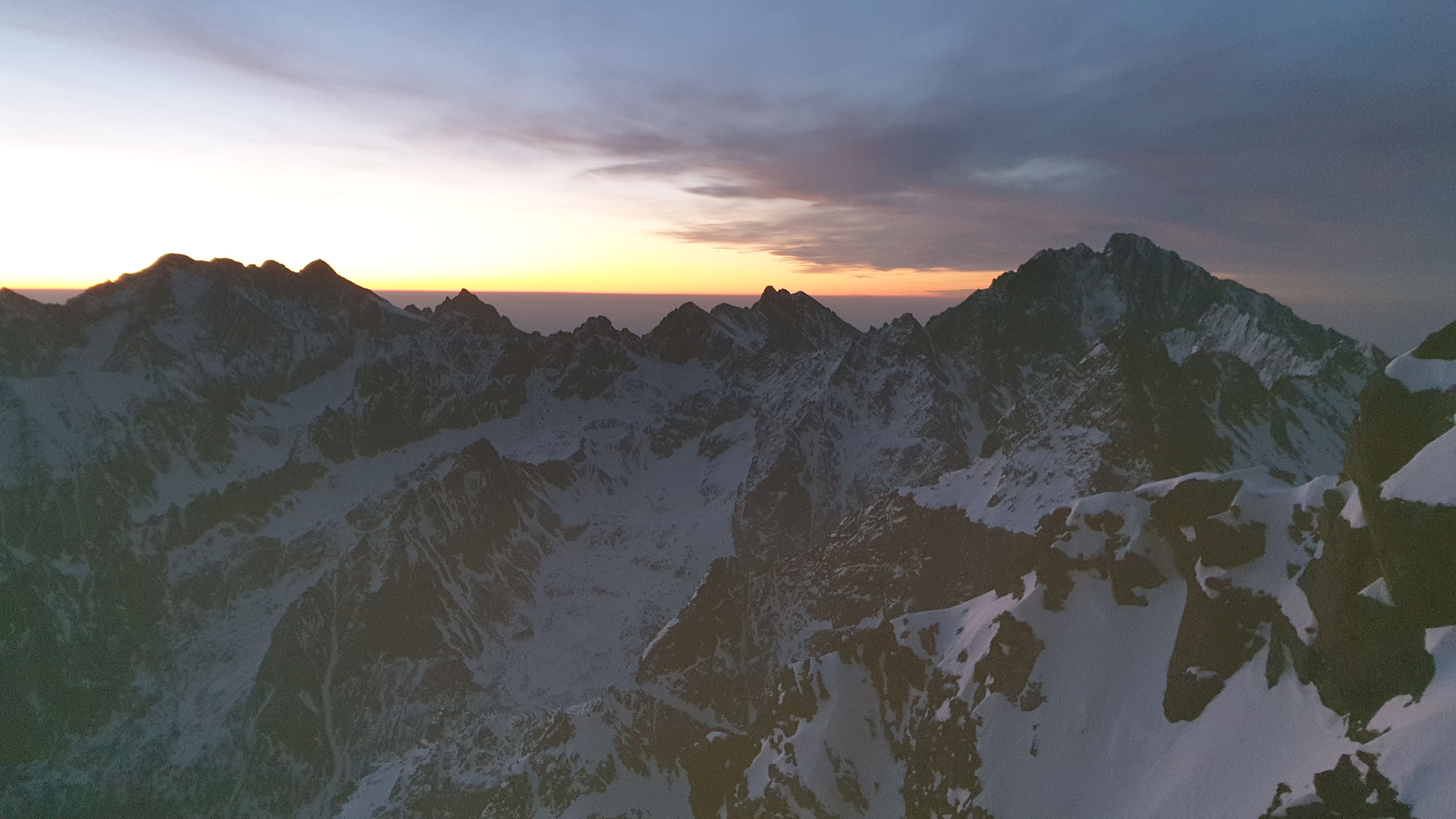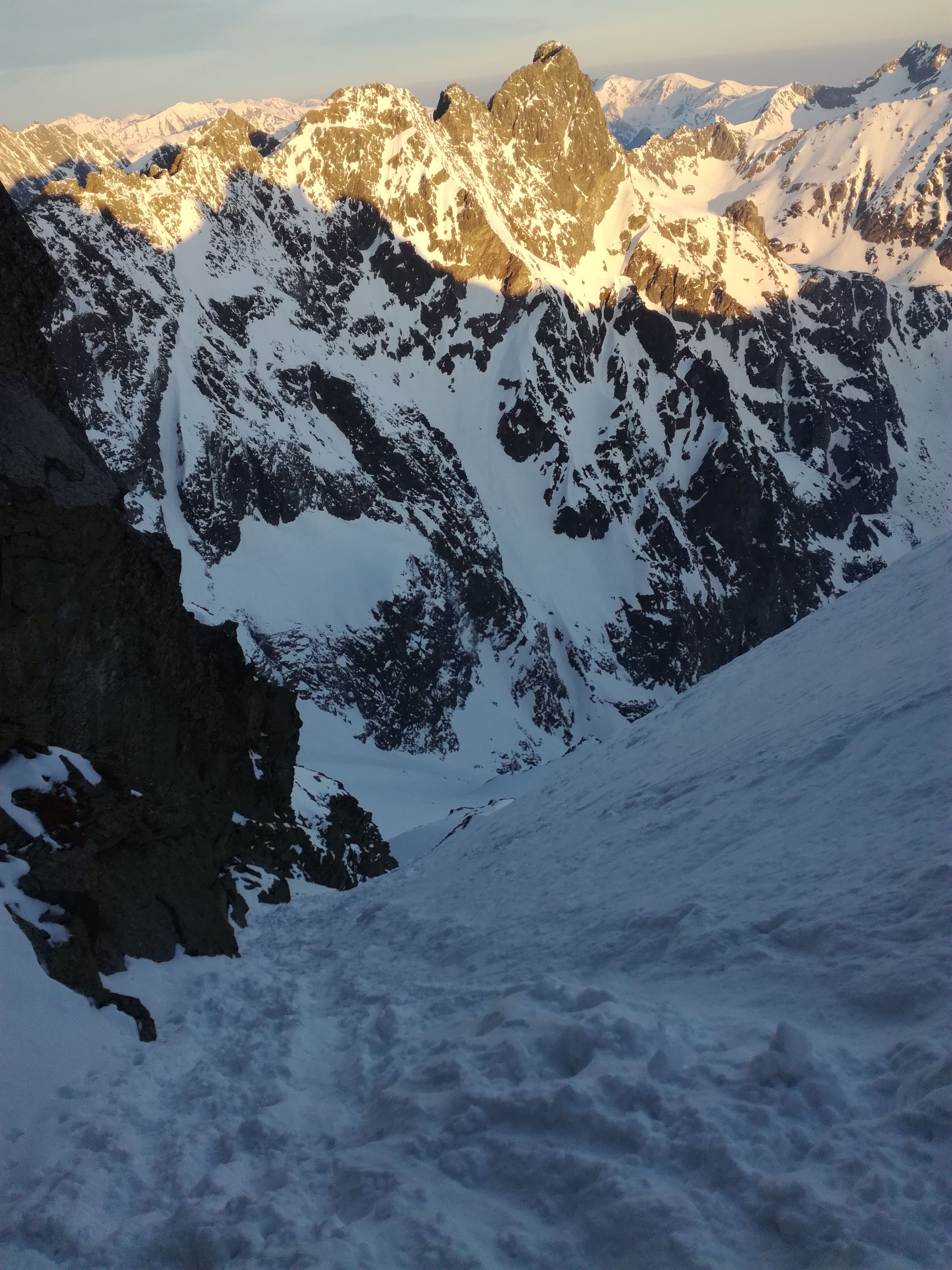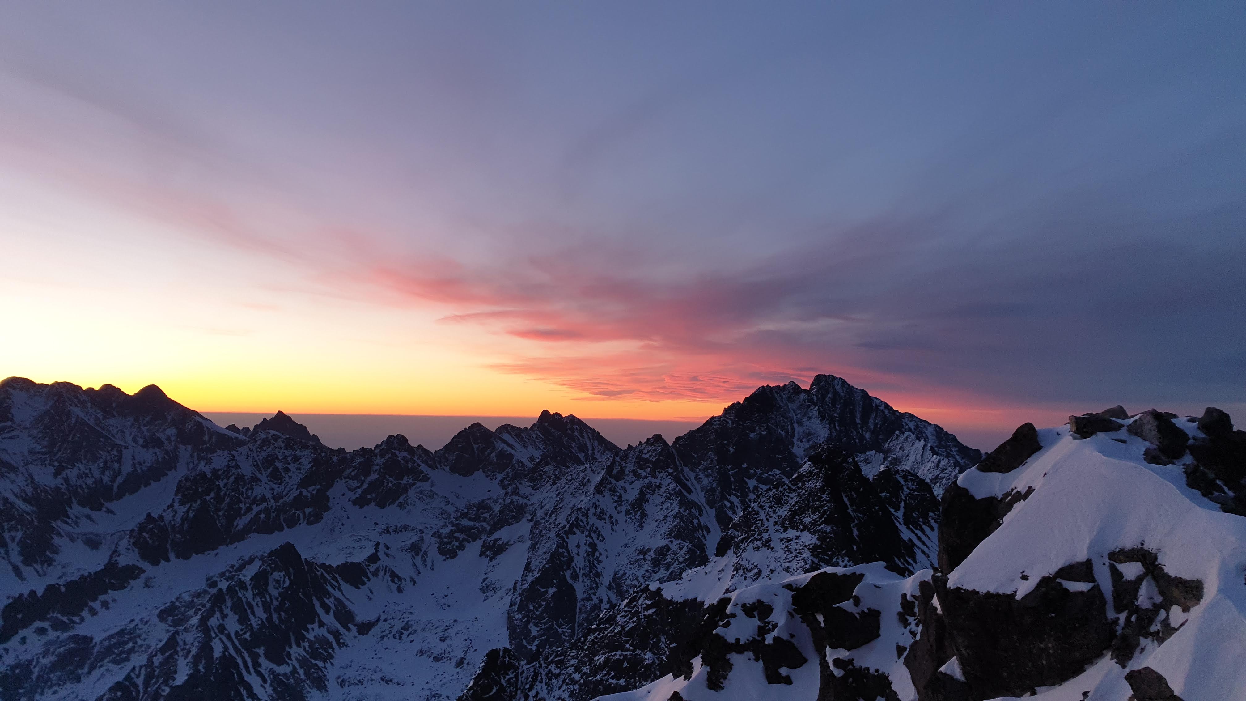 Początek nie jest aż taki ciężki. Po prostu idzie się lekko pod górę. Później nachylenie zbocza jest już na tyle duże, że nie da się trzymać pierwotnego tempa. Ta końcówka jest na prawdę wymagająca, a przełączka gdzie kończy się to długie i wyczerpujące podejście wydaje się być na wyciągnięcie ręki. Docieramy do nawisu śnieżnego i kierujemy się w prawo. Stąd do szczytu już tylko kawałek. Oczywiście pod górę, ale za to z łańcuchami. Nie wszystkie są przysypane, więc można je wykorzystać do asekuracji. A nawet warto to zrobić, bo ekspozycja na tym odcinku jest bardzo duża. W pewnym momencie ma się po prawej stronie taką przepaść, że upadek skończyłby się fatalnie.