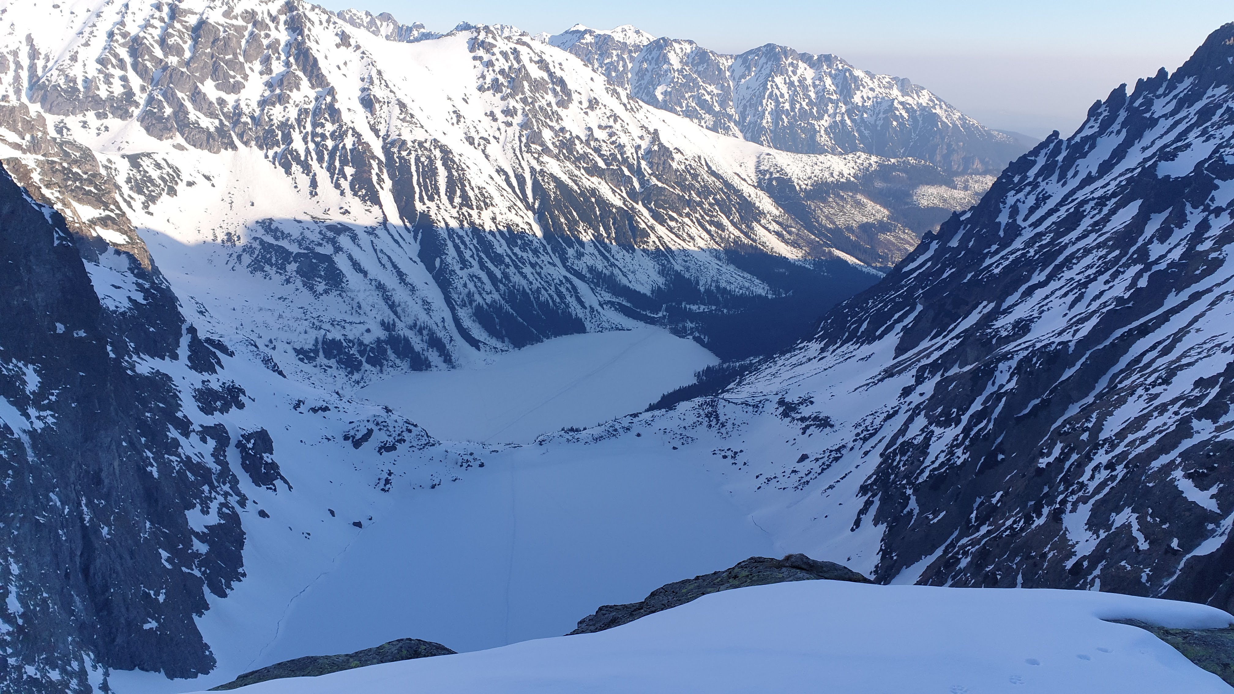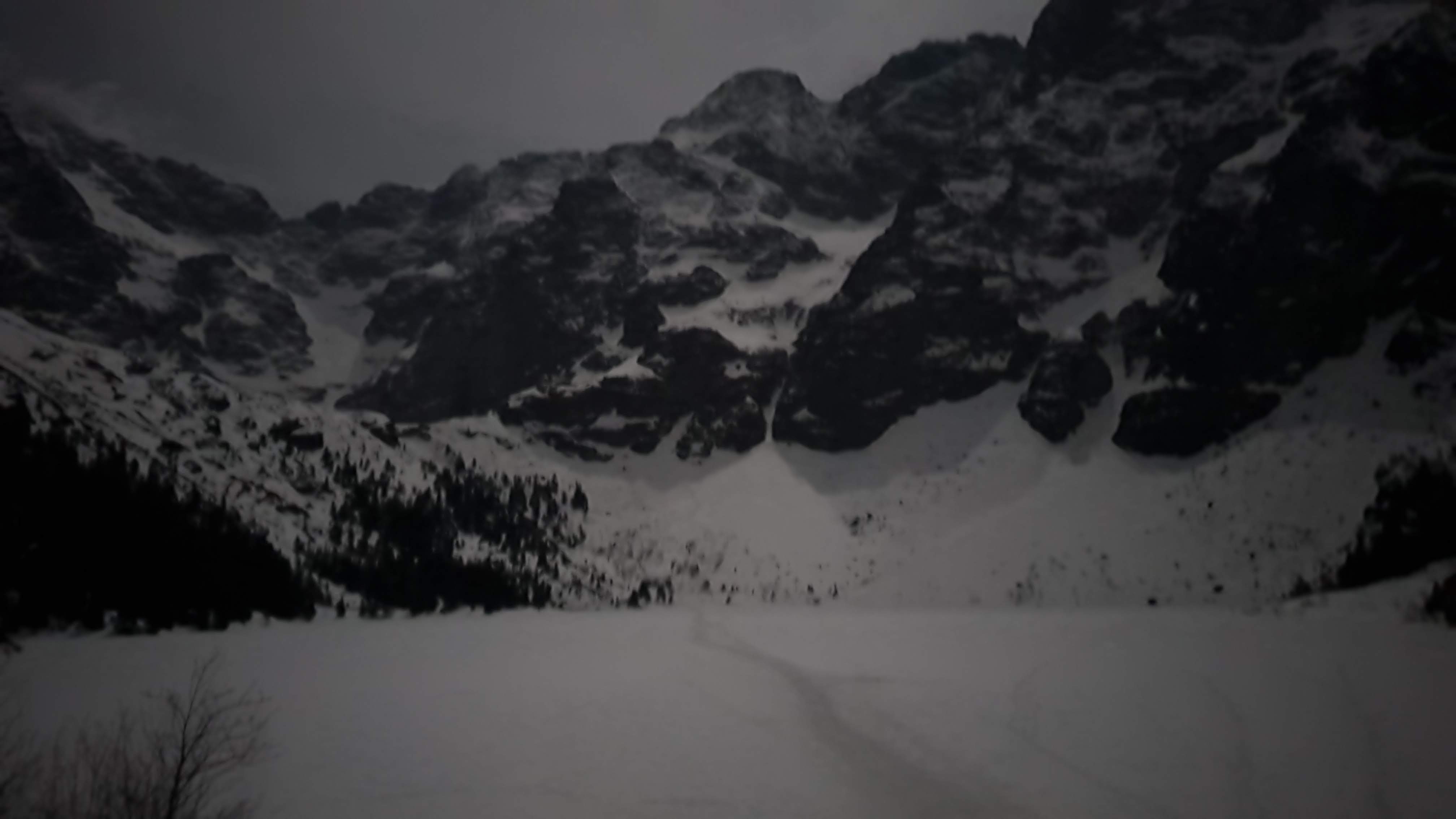 Ok 2.00 wychodzimy ze schroniska idziemy przez zamarznięte Morskie Oko, dzięki skrótowi oszczędzamy kilkanaście minut. Droga po płaskim i dobrze przetartym terenie jest o wiele szybsza niż letnie obchodzenie stawu, po jego przejściu zakładamy raki.