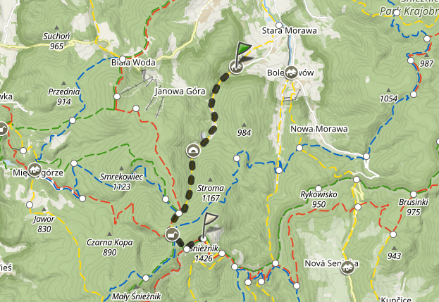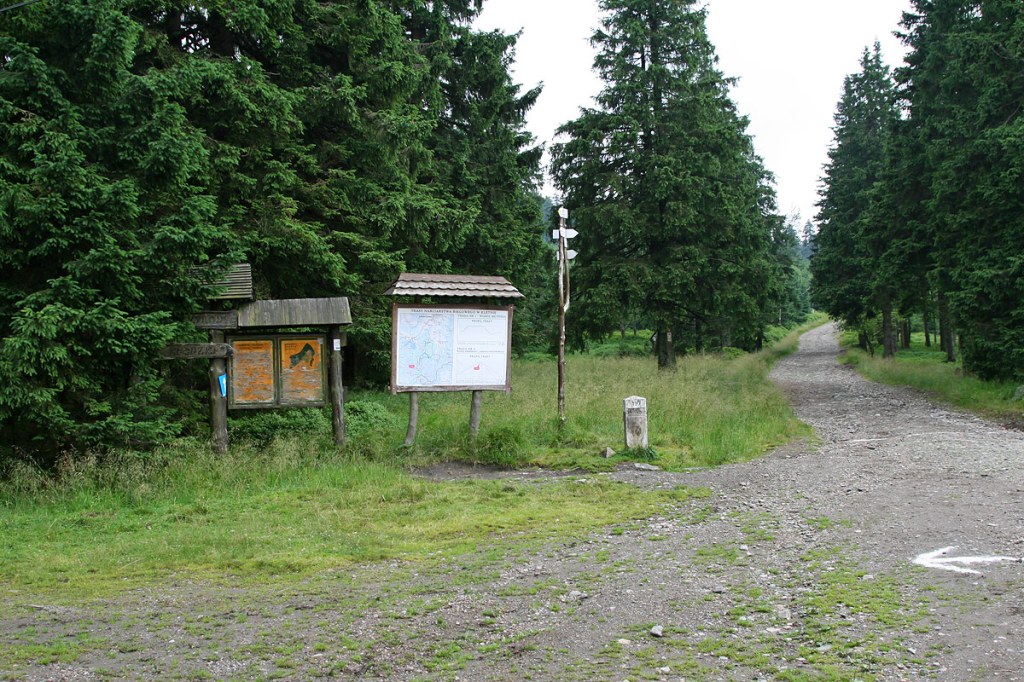 Po kilku minutach podejścia szlak ponownie łączy się z drogą rowerową, tym razem na dłużej. Trzyma się on drogi przez kilkaset metrów, do kolejnego zakrętu w prawo, tutaj znajduje się miejsce odpoczynku z ławeczkami. Po odpoczynku ruszam dalej żółtym szlakiem kierując się na wprost i po ok. 35 minutach wydostaję się z lasu tuż przed Przełęczą Śnieżnicką (1123 m n.p.m.) tutaj łączy się ze szlakiem niebieskim i zielonym z Międzygórza oraz czerwonym z Czarnej Góry przez Żmijowiec.