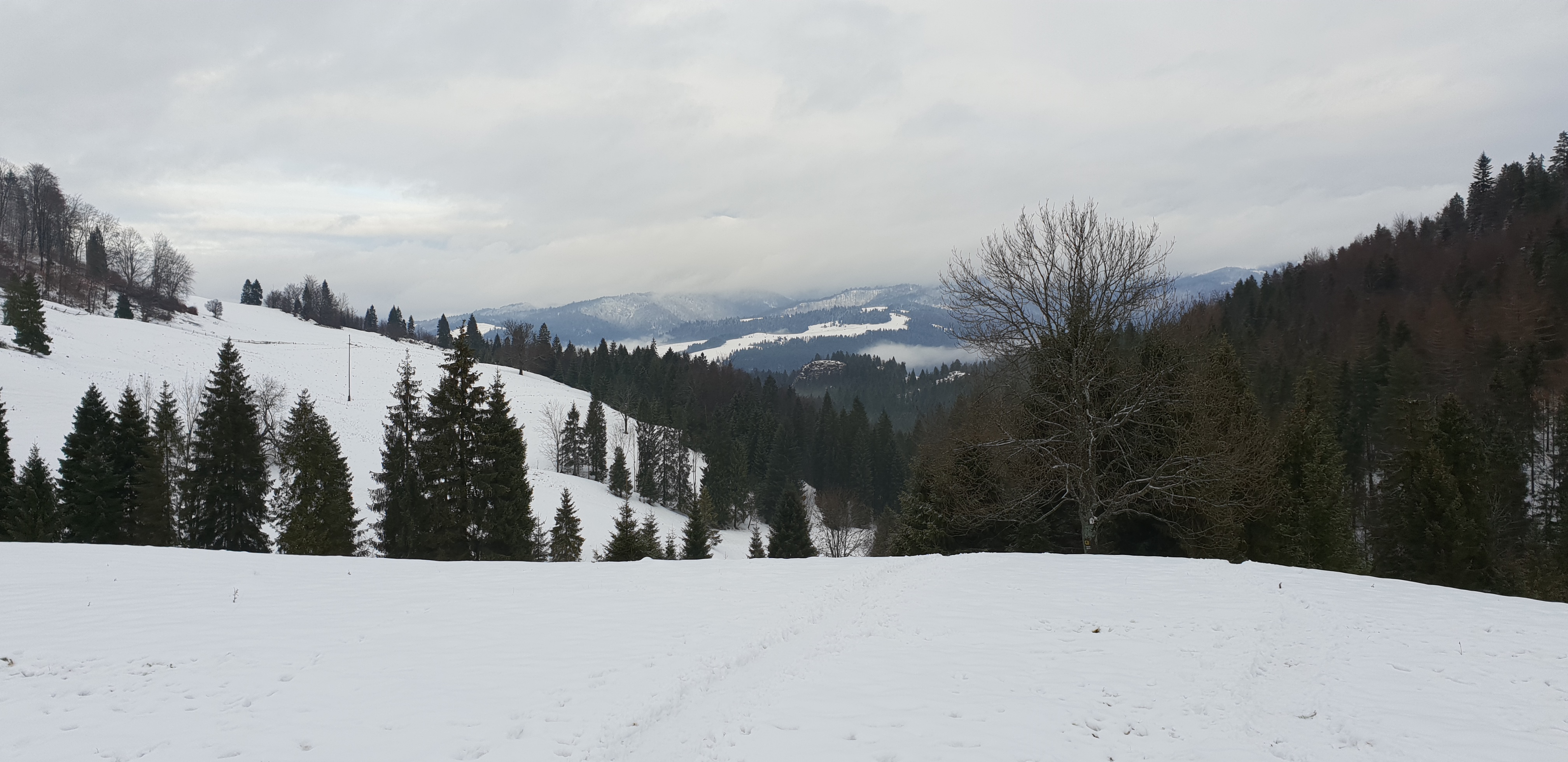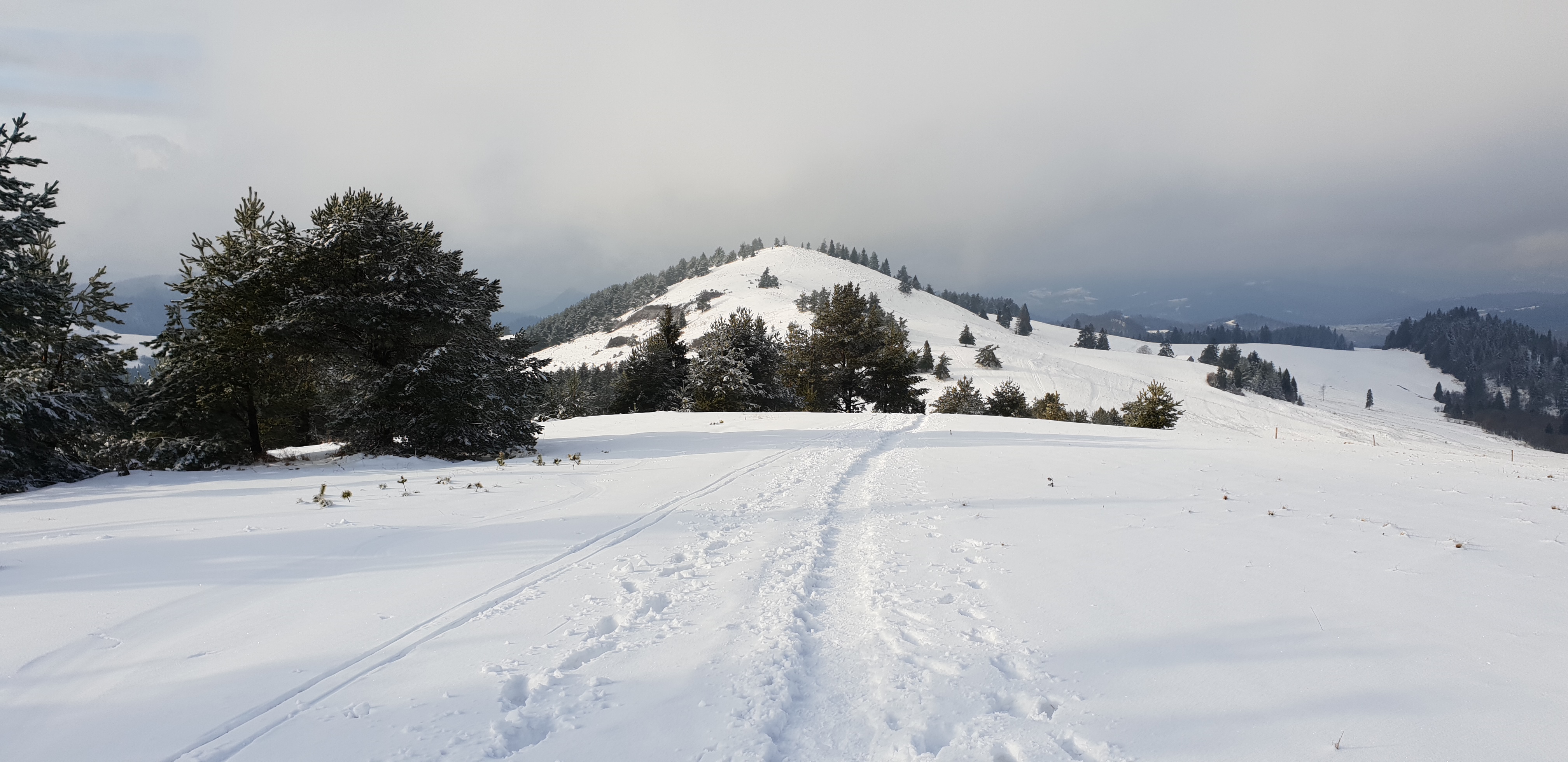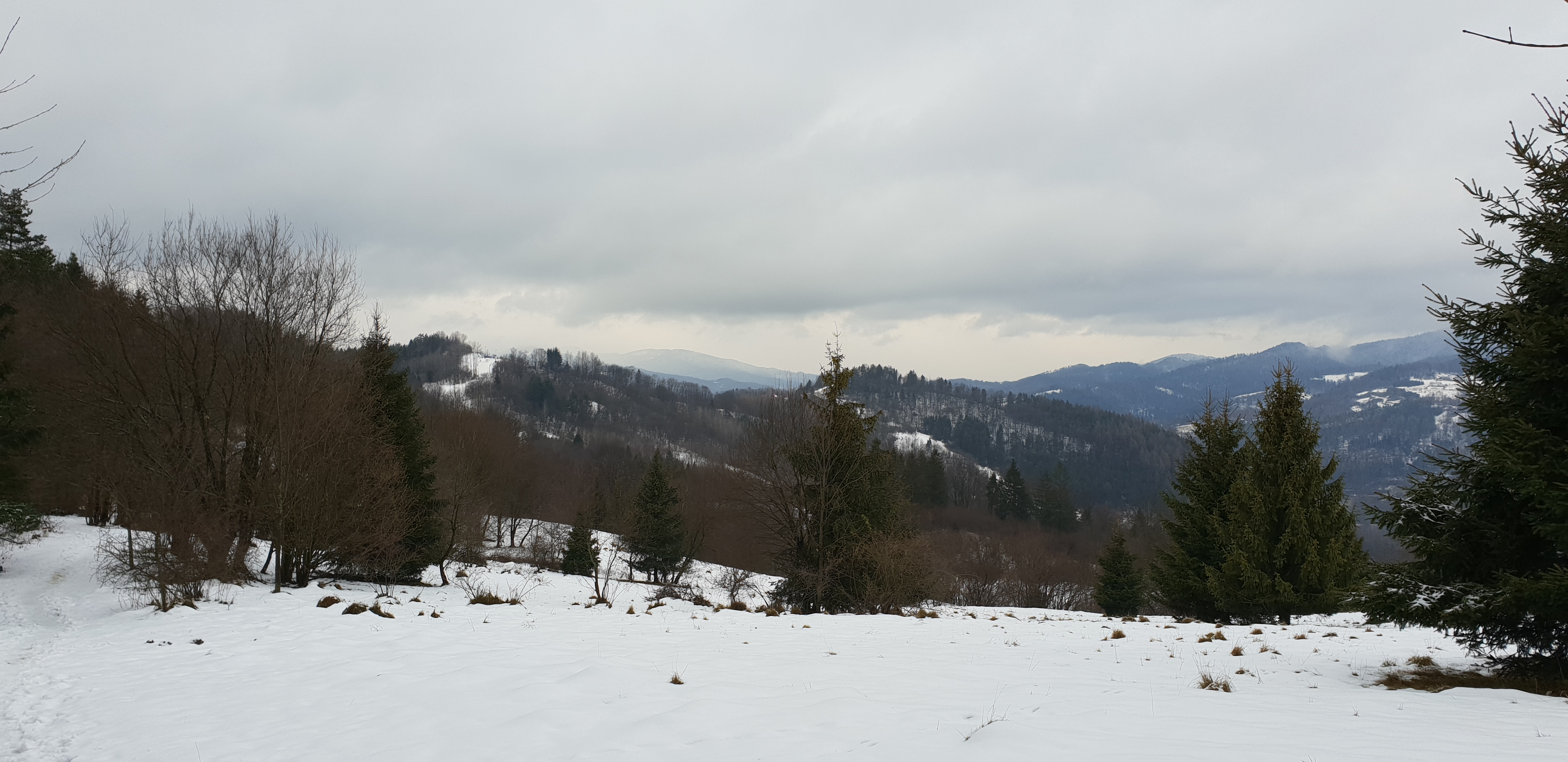 Po krótkim postoju ruszam dalej zielonym szlakiem. Dochodzę do szerokiej gruntowej drogi, którą bez większych podejść idziemy na południe. Gdy doszedłem do polany pod Wysoką mogę podziwiać jej zalesiony szczyt w całej okazałości. Od tego miejsca szlak zaczyna wznosić się ku górze i rozpoczyna się niezbyt strome podejście. Z każdym metrem wysokości coraz bardziej okazalszy staje się również widok za mną. Gdy docieram do porośniętego lasem stożka Wysokiej, opuszczam zielony szlak, który omijając wzniesienie Wysokich Skałek prowadzi dalej na Słowację i wchodzę skręcając w prawo na szlak niebieski. Droga staje się bardziej stroma. Po około 10 minutach dochodzę do niewielkiej polanki na granicy polsko-słowackiej. Szlak niebieski skręca w prawo i prowadzi dalej wzdłuż granicy grzbietem Małych Pienin na zachód ja chcąc wejść na szczyt Wysokiej, schodzę ze szlaku i kieruję się w lewo w linii słupków granicznych w górę.