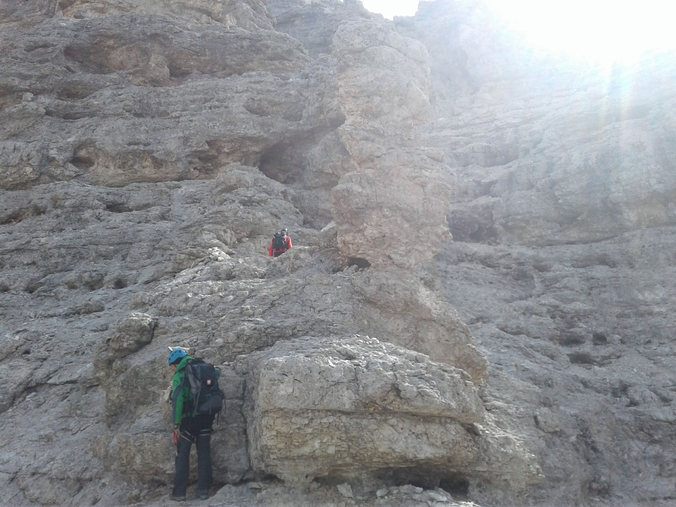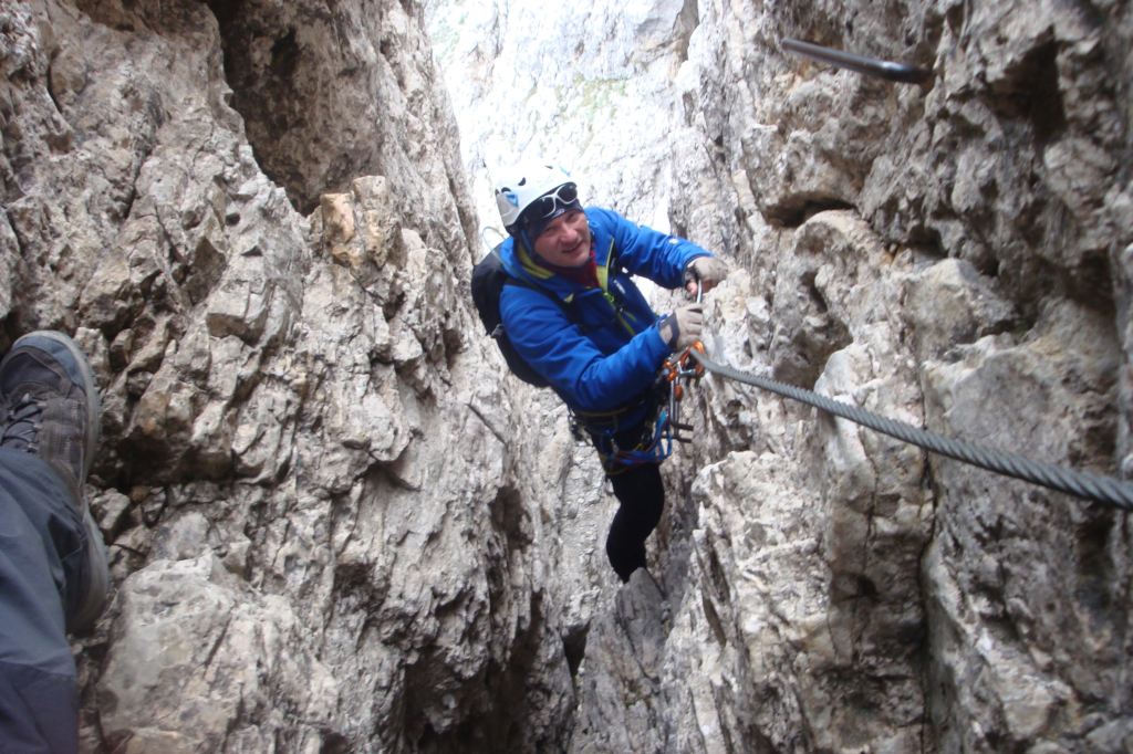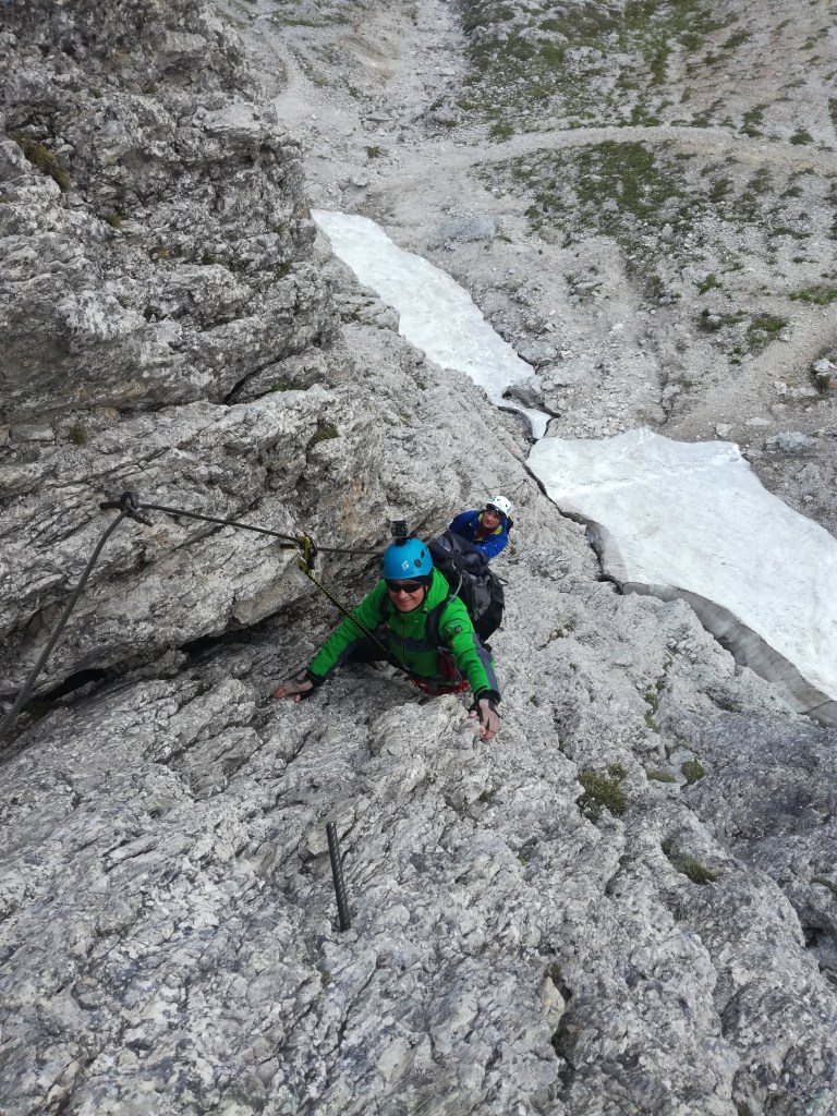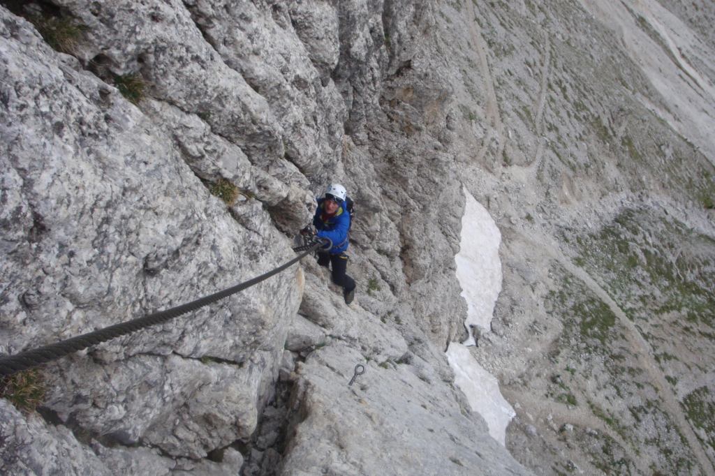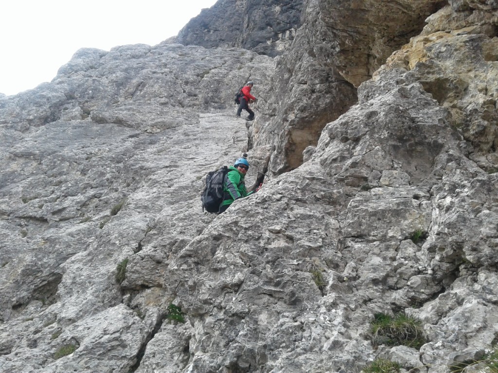 Z Paso Sella kierujemy się wzdłuż północno-zachodnich urwisk grupy. Po około 20 minutach docieramy do początku ferraty. Droga zaczyna się mocnym akcentem – wspinamy się prawie pionowym zacięciem.