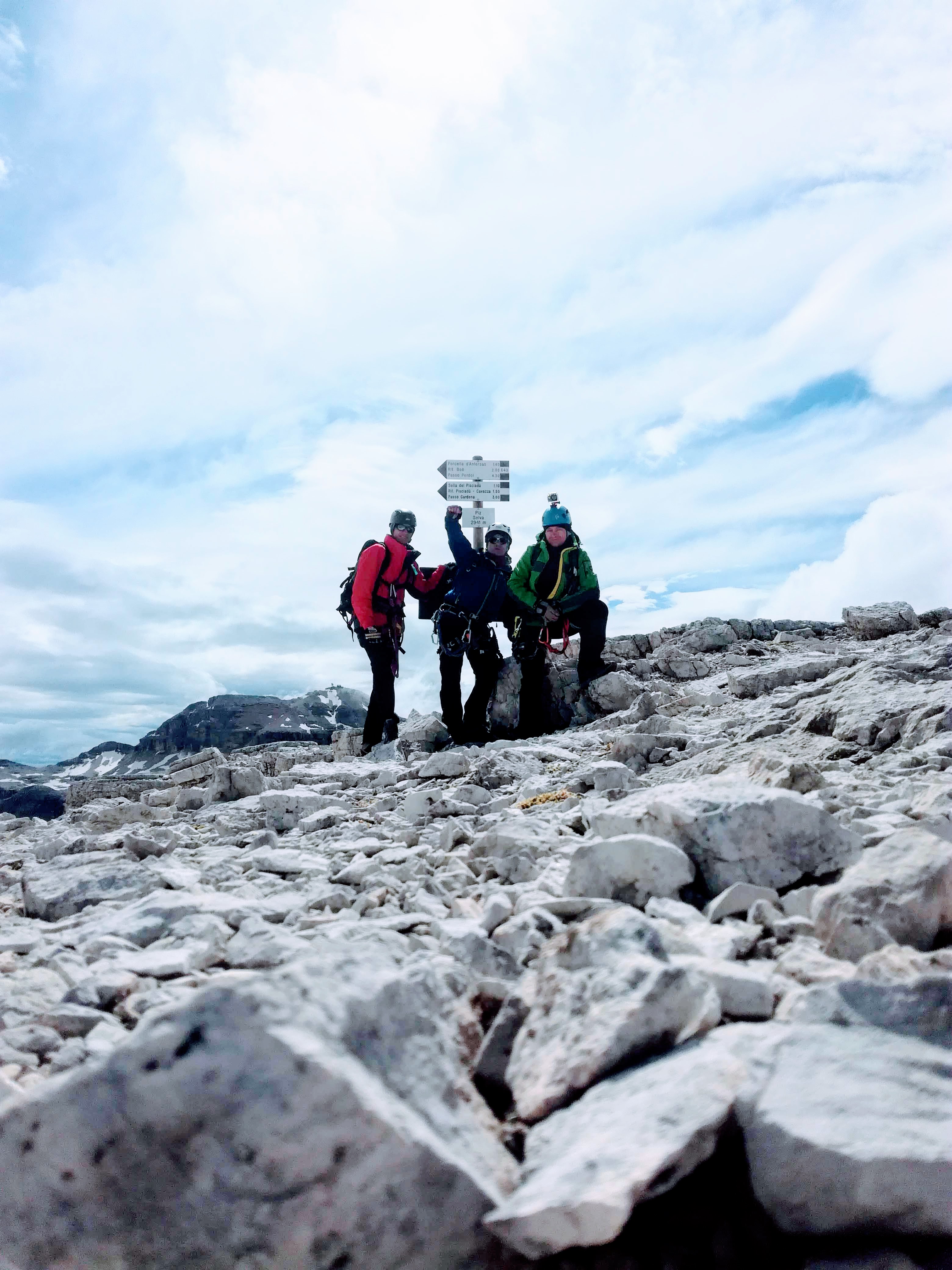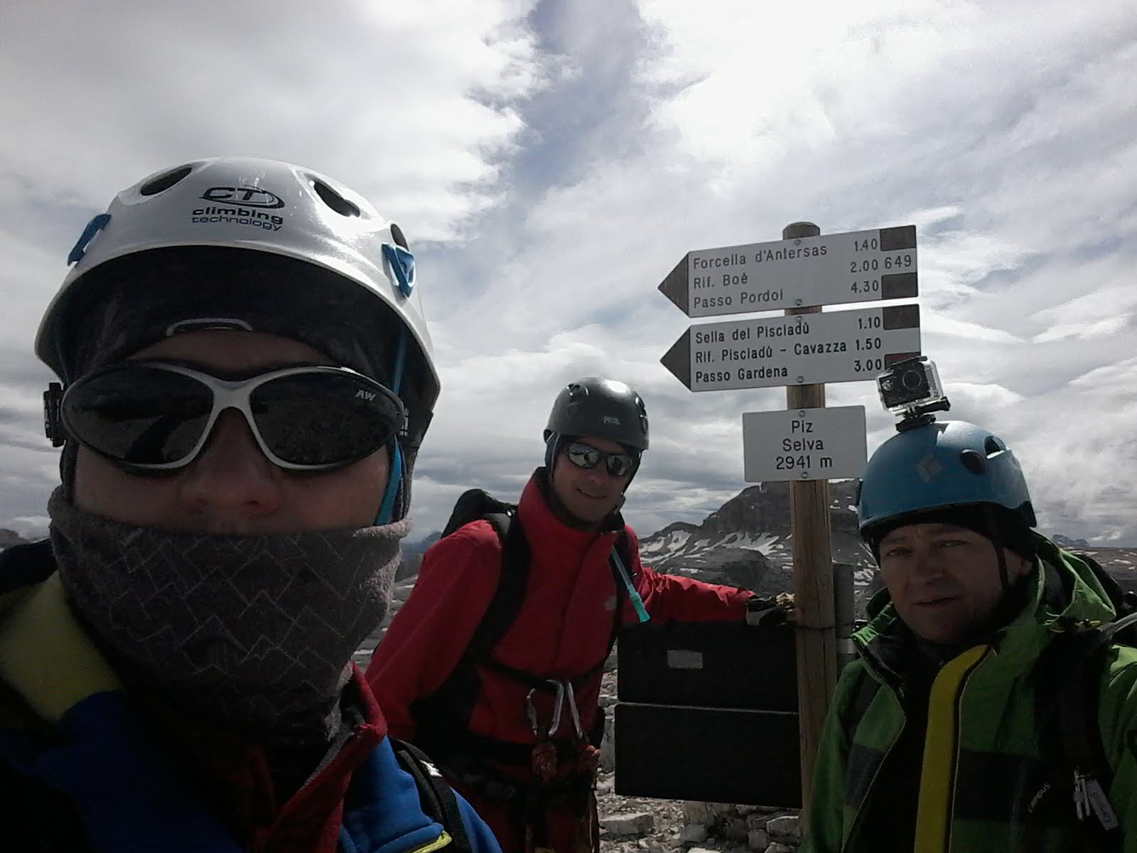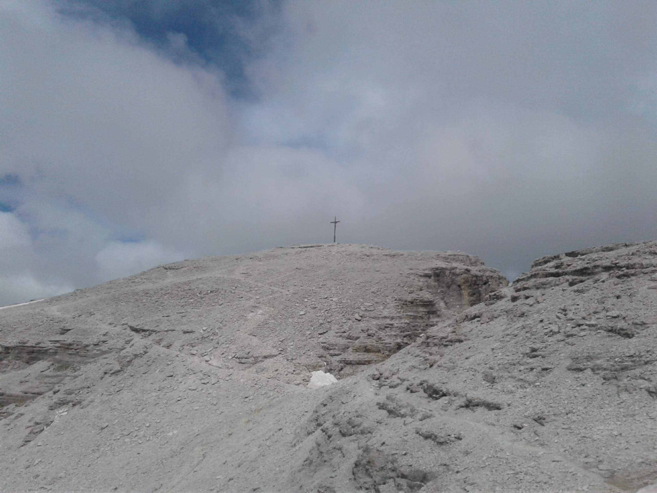 Wychodzimy na grań i nią na szczyt. Na odejściu pod Piz Selva dominują eksponowane nieubezpieczone odcinki. Idziemy wolno, bo każdy błąd może zakończyć się bardzo długim lotem. Osobiście nie chciałbym przechodzić tędy podczas deszczu, gdy skała jest śliska. Wreszcie docieramy na wierzchołek..