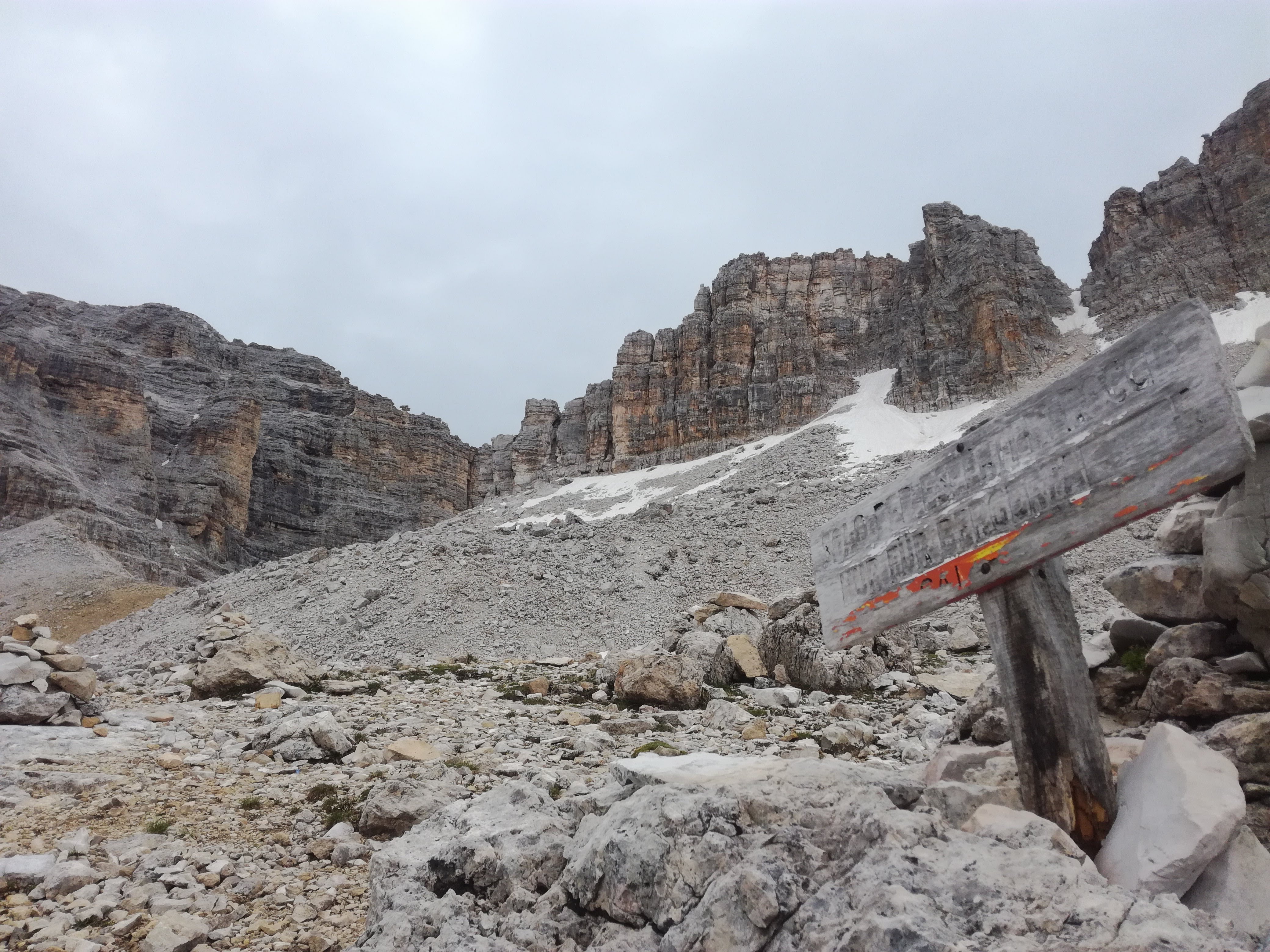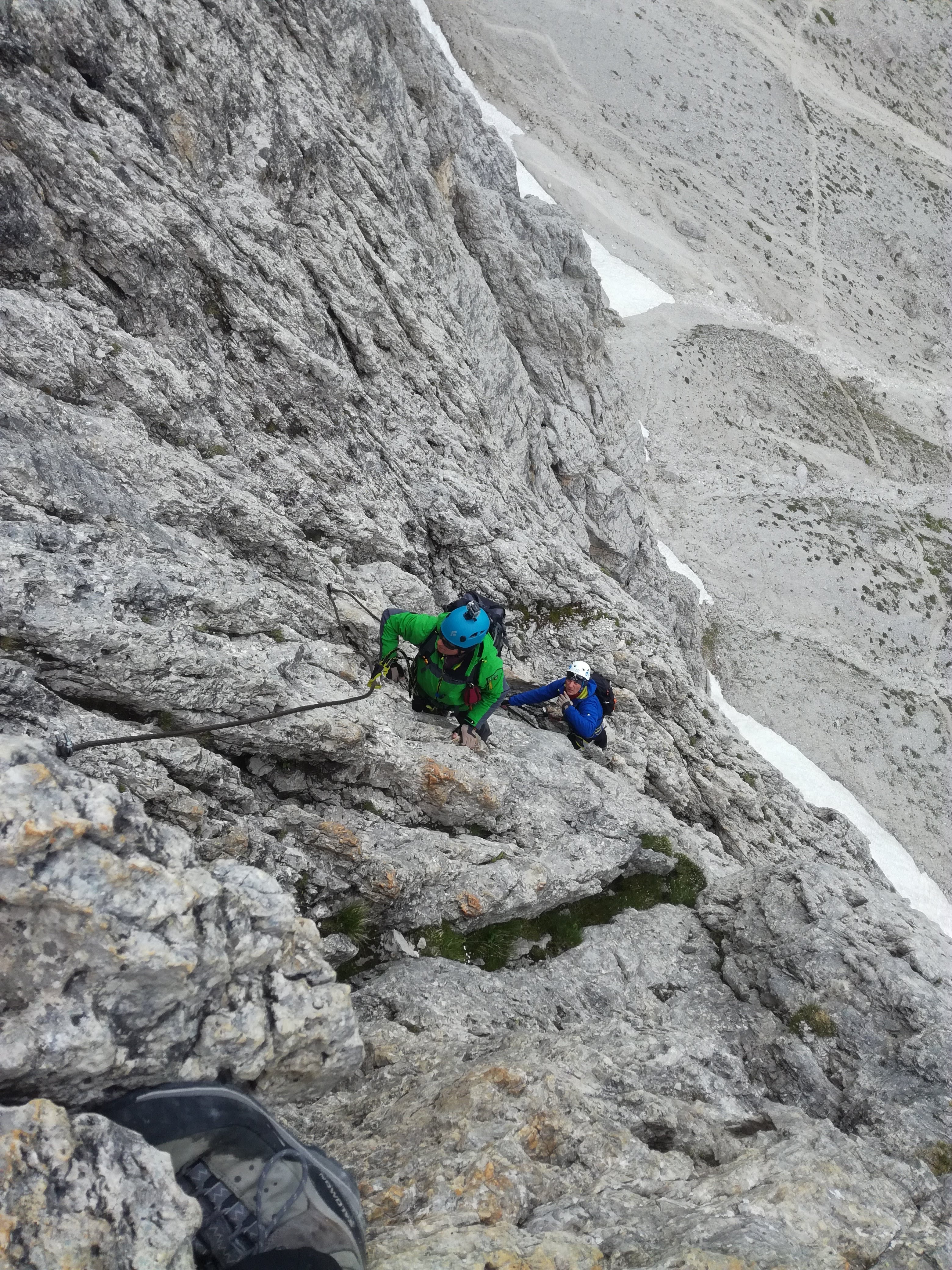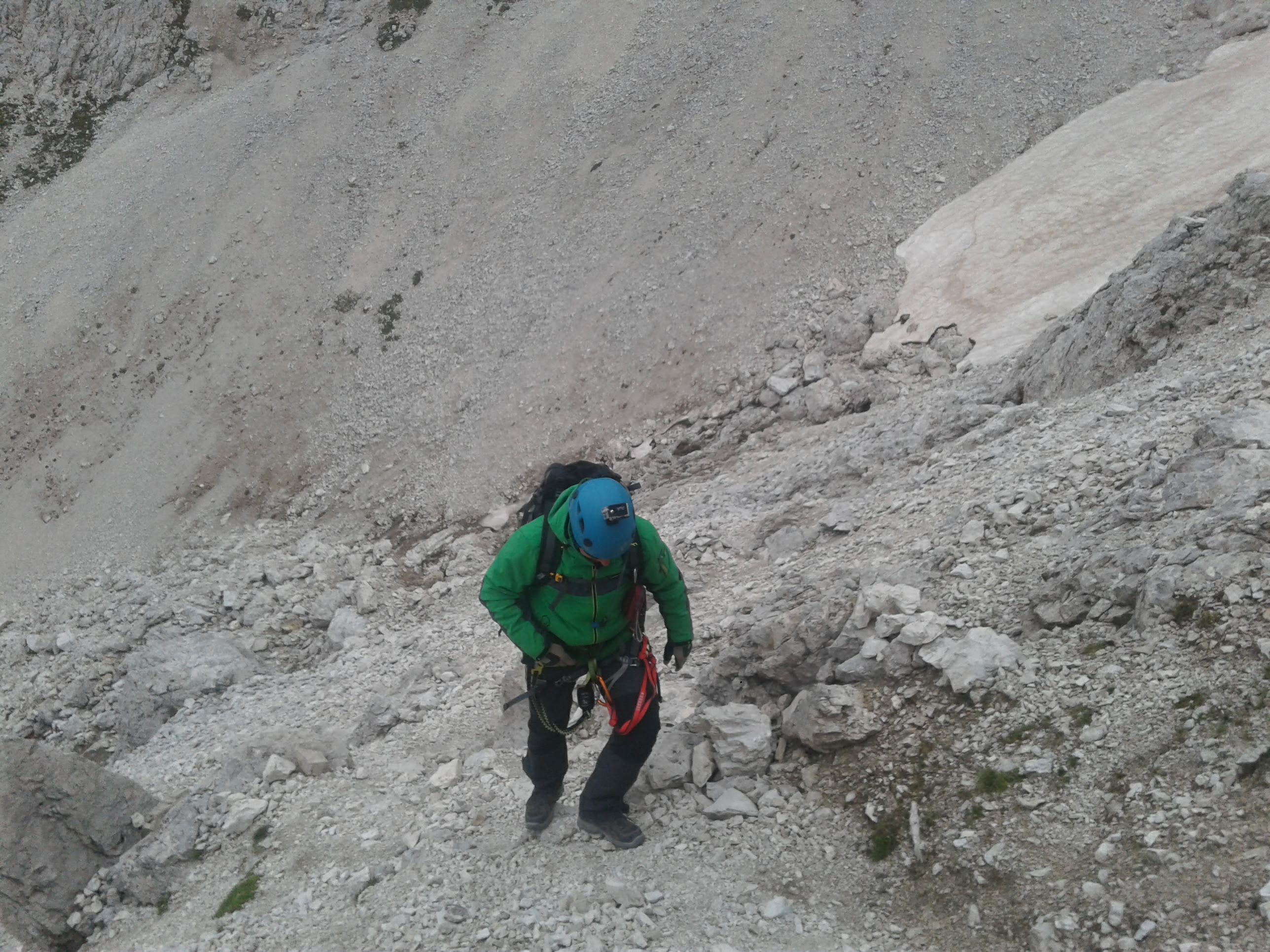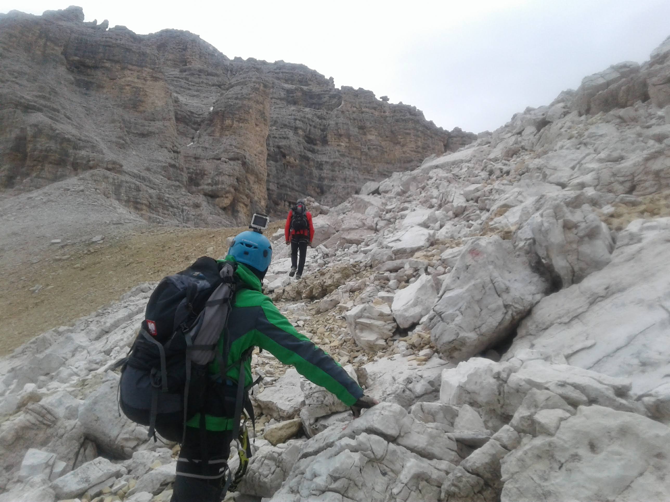 Wychodzimy na nieco bardziej „otwarty” teren. Pod nogami widać piargi, którymi podchodziliśmy pod ścianę. Po kilkunastu minutach niezwykle przyjemnej wspinaczki teren staje się łatwiejszy, półkami wchodzimy do piarżystego kotła. Koniec zasadniczych trudności, zaczyna się żmudny odcinek. Pokonujemy kocioł i wychodzimy na obszerne siodło . Dalej znów pojawiają się ubezpieczenia ale teren jest już łatwiejszy.