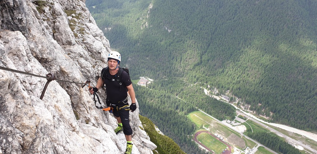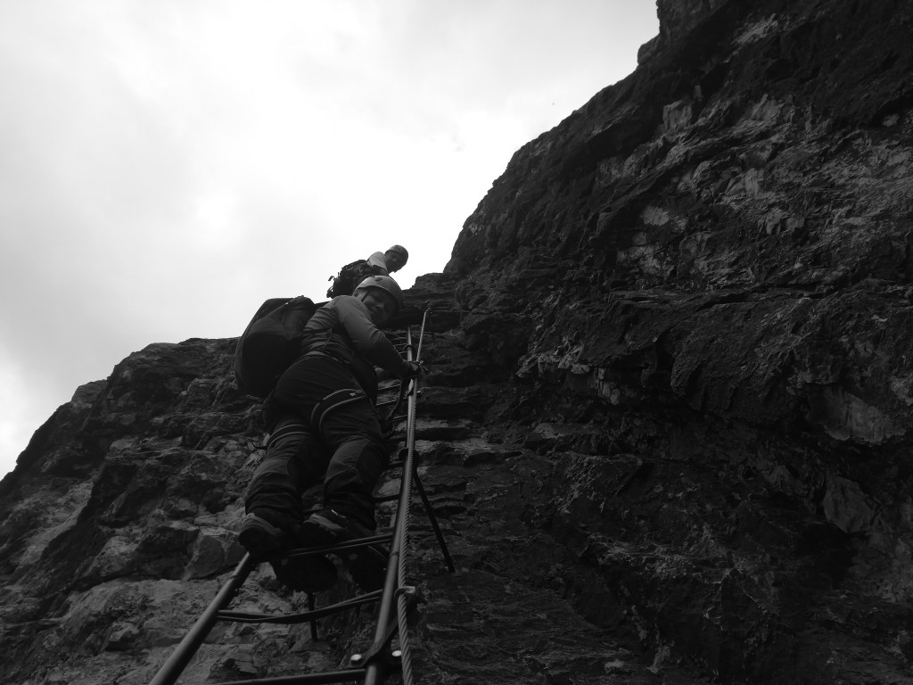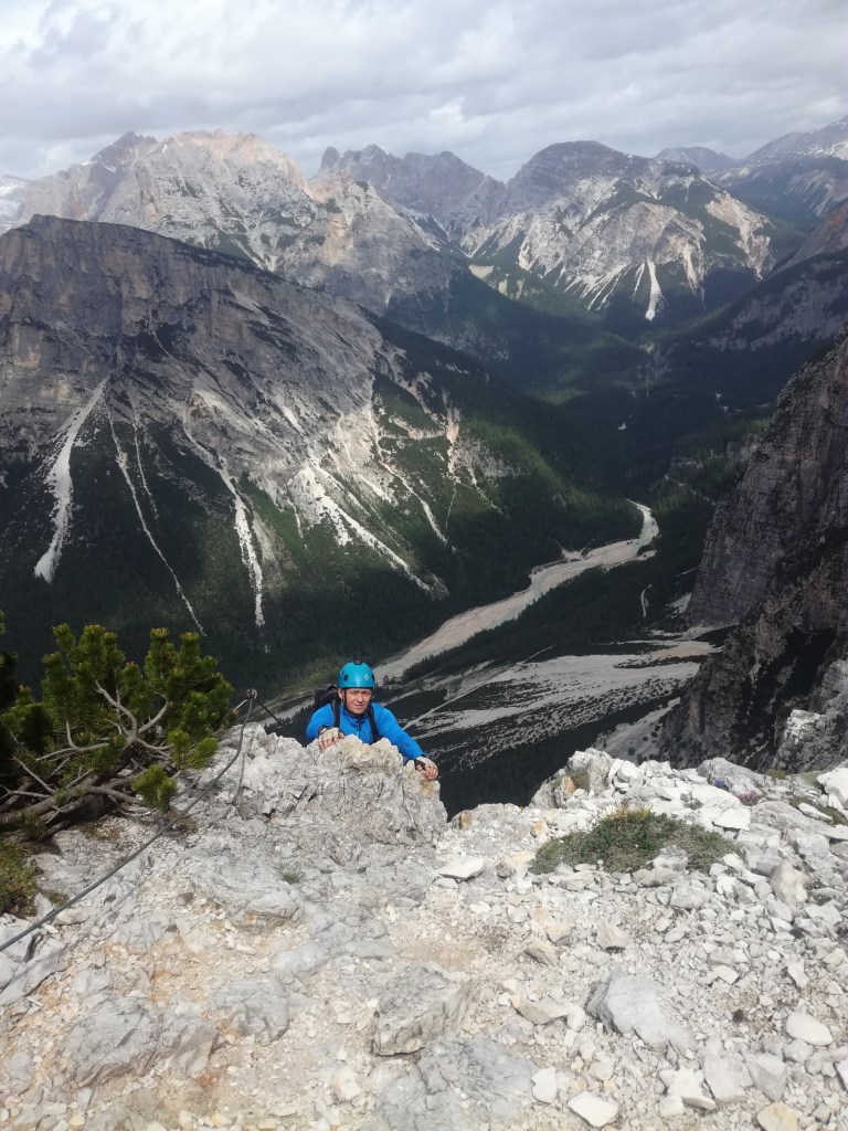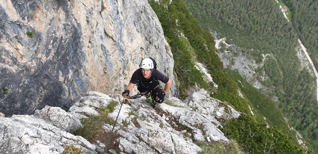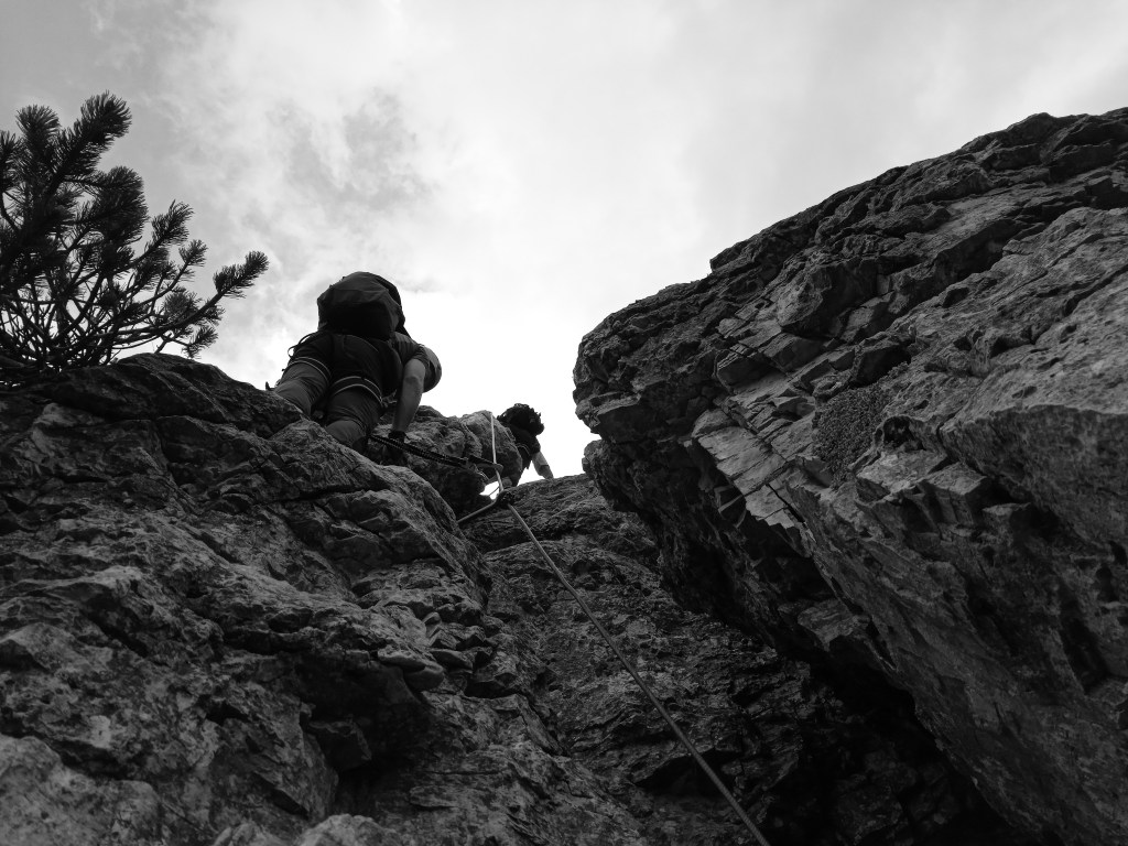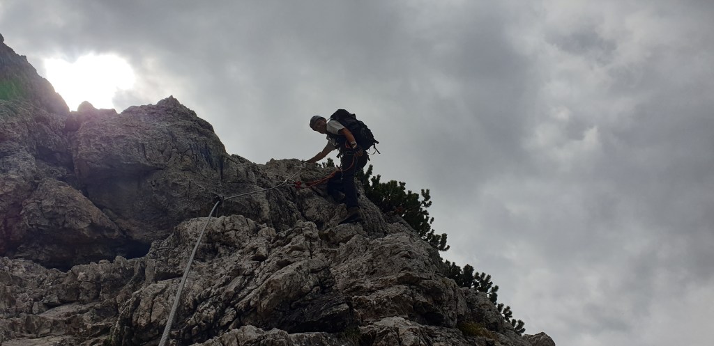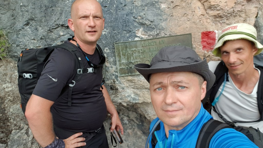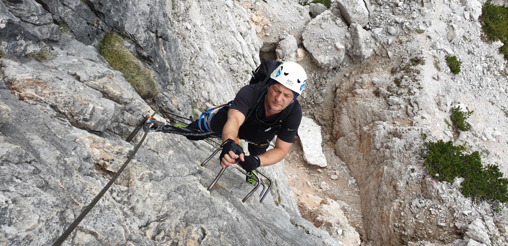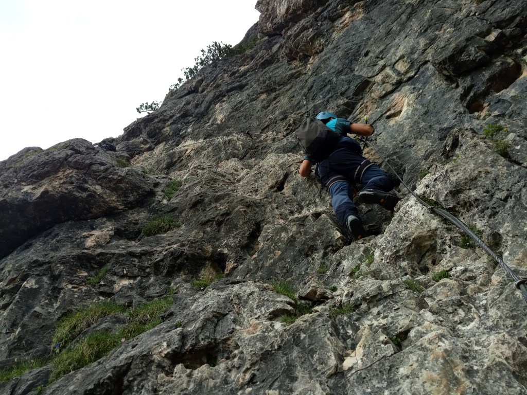 Trudności drogi nazwanej imieniem słynnego alpejskiego przewodnika zostały wycenione na C. Pierwsze metry ferraty to trochę wspinaczki po nieco stromych skałkach, po przejściu, których czeka na nas długi zachód. Trawersujemy nim dolne partie ściany po czym nasza droga znów zaczyna piąć się w górę. Przed nami ciąg kominków i rynien wycenionych na B/C. Wspinaczka sprawia mnóstwo radości i przyjemności, ciągniemy z Pelasiem do góry gdy z dołu słyszymy Wilusia wołającego – ,,gdzie wam się śpieszy, mamy czas” , a więc odpoczynek. W ten oto sposób to zawołanie zostało hasłem przewodnim tegorocznego wyjazdu:) Pod naszymi nogami coraz więcej powietrza. Dalsza droga to eksponowana wspinaczka po przeróżnych formacjach skalnych poprzeplatana trawersami.