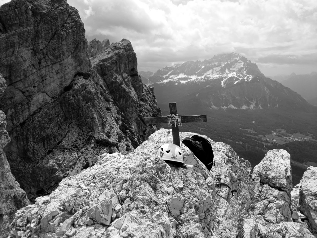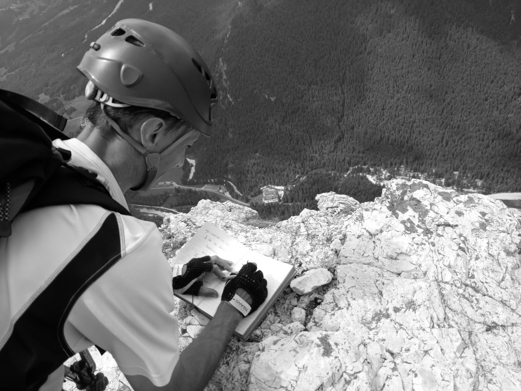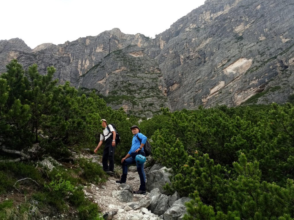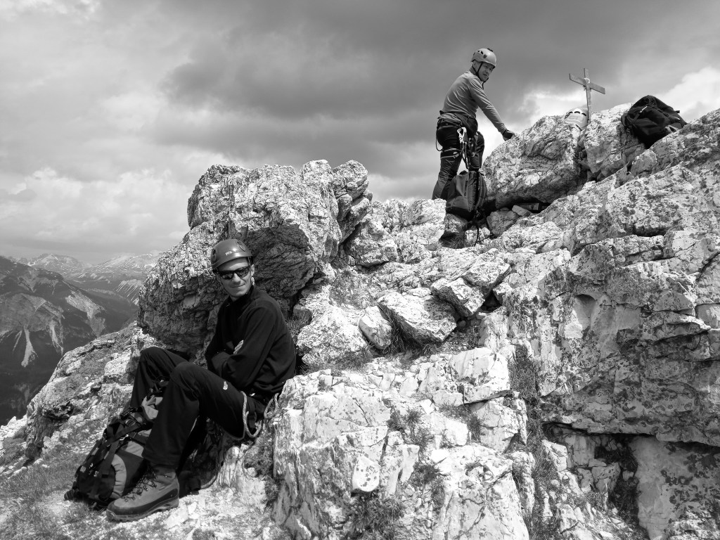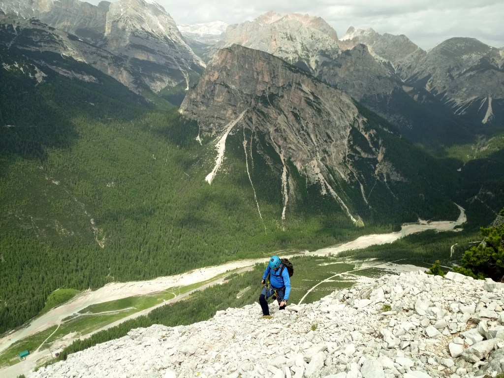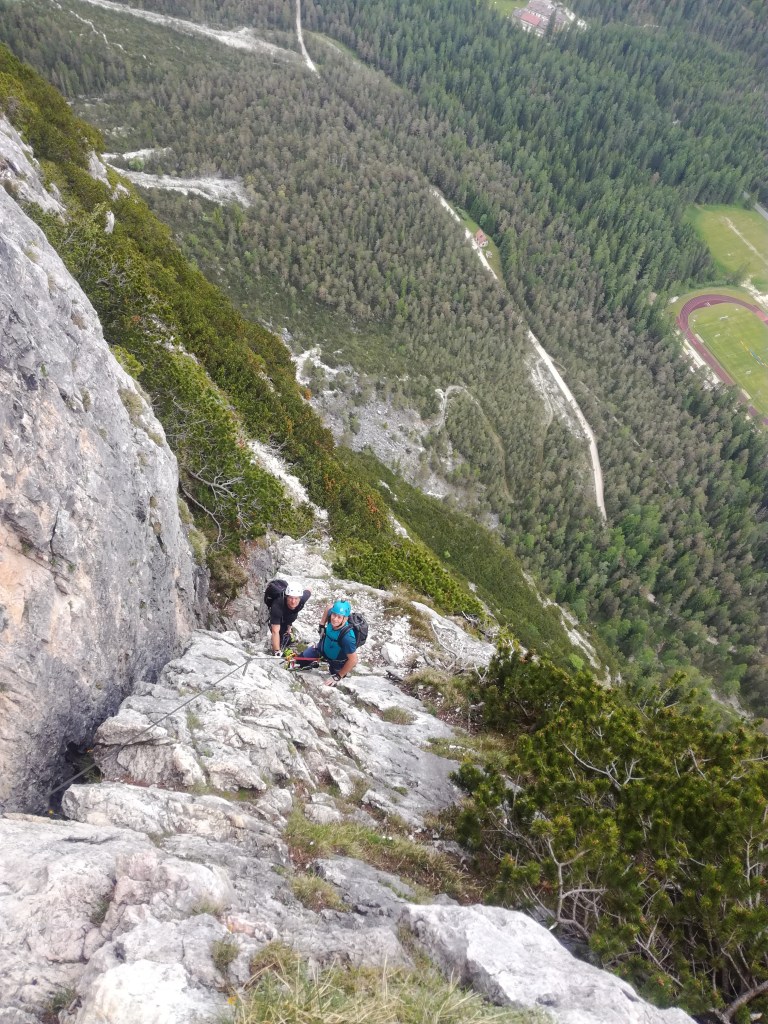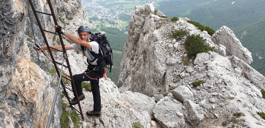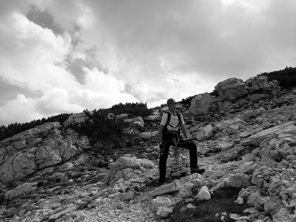 Trudności drogi nazwanej imieniem słynnego alpejskiego przewodnika zostały wycenione na C. Pierwsze metry ferraty to trochę wspinaczki po nieco stromych skałkach, po przejściu, których czeka na nas długi zachód. Trawersujemy nim dolne partie ściany po czym nasza droga znów zaczyna piąć się w górę. Przed nami ciąg kominków i rynien wycenionych na B/C. Wspinaczka sprawia mnóstwo radości i przyjemności, ciągniemy z Pelasiem do góry gdy z dołu słyszymy Wilusia wołającego – ,,gdzie wam się śpieszy, mamy czas” , a więc odpoczynek. W ten oto sposób to zawołanie zostało hasłem przewodnim tegorocznego wyjazdu:) Pod naszymi nogami coraz więcej powietrza. Dalsza droga to eksponowana wspinaczka po przeróżnych formacjach skalnych poprzeplatana trawersami.