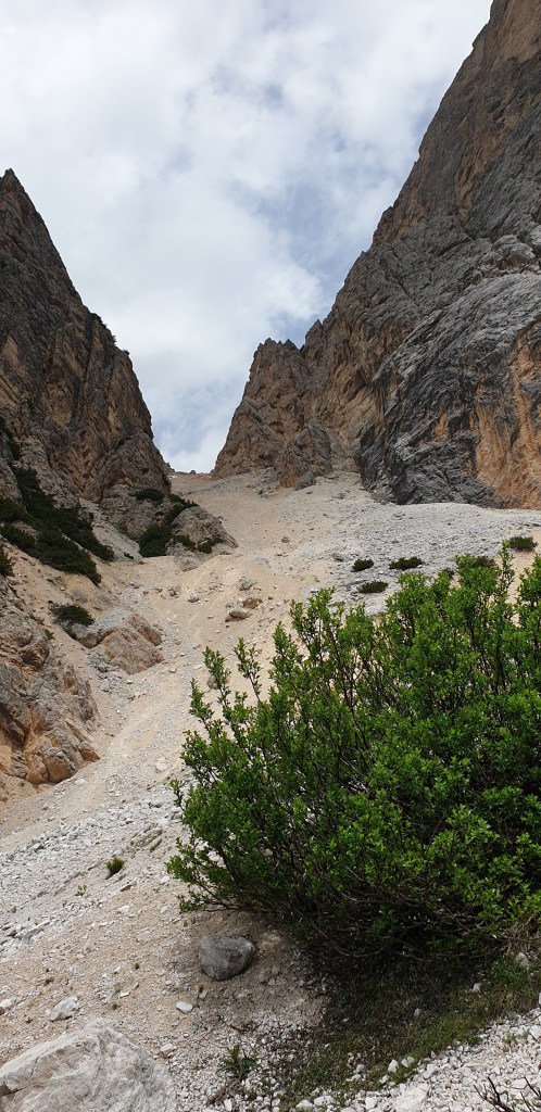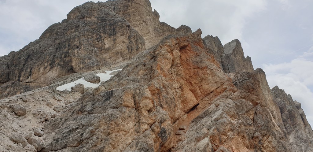 Zejście prowadzi inną drogą . Schodząc ze szczytu kierujemy się w prawo, w stronę Val Pamagagnon i przełęczy o tej samej nazwie. Ścieżka jest bardzo wyraźna i nie mamy problemu z właściwym kierunkiem schodzenia. Dookoła panuje absolutna cisza, jesteśmy sami pośród gór. To jest nieprawdopodobne, kiedy pomyślę sobie, że w tym samym momencie w Tatrach tłoczy się mnóstwo ludzi bijąc rekordy wejść do TPN. Uwielbiamy za to Dolomity