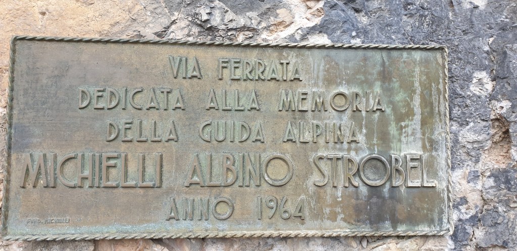 Stąd już w kilka minut piargiem w górę i jesteśmy pod ścianą, gdzie znajduje się początek ferraty. Nazwa drogi pochodzi od nazwiska słynnego alpejskiego wspinacza i przewodnika Albino- Michielli Strobel pochodzącego z okolic Cortiny d’ Ampezzo, który zginął wskutek upadku, w ścianie Pomagagnon. co upamiętnia znajdująca się tutaj tablica.