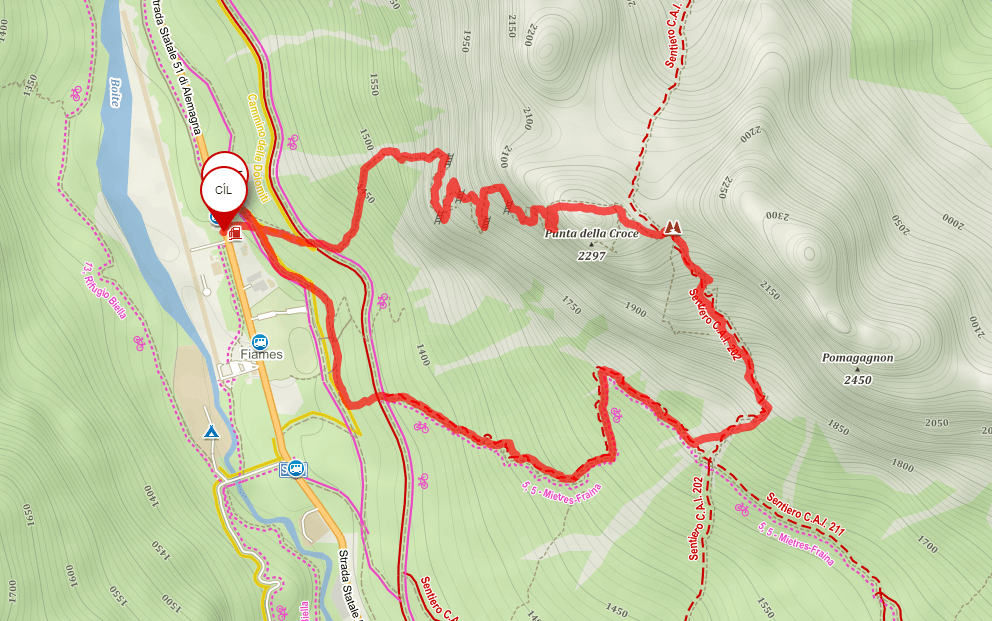 Jest 7.10 kiedy docieramy na parking przed hotelem Fiames, krótki odpoczynek po podróży, śniadanie i w drogę. Nie mamy zamiaru marnować pierwszego dnia wspaniale zapowiadającego się urlopu. Po spakowaniu plecaków, przechodzimy na drugą stronę drogi i wchodzimy w las. Idziemy ścieżką kierującą nas znakami w stronę ferraty Albino- Michielli Strobel którą mamy wejść na szczyt Punta Fiames 2240 m n.p.m.