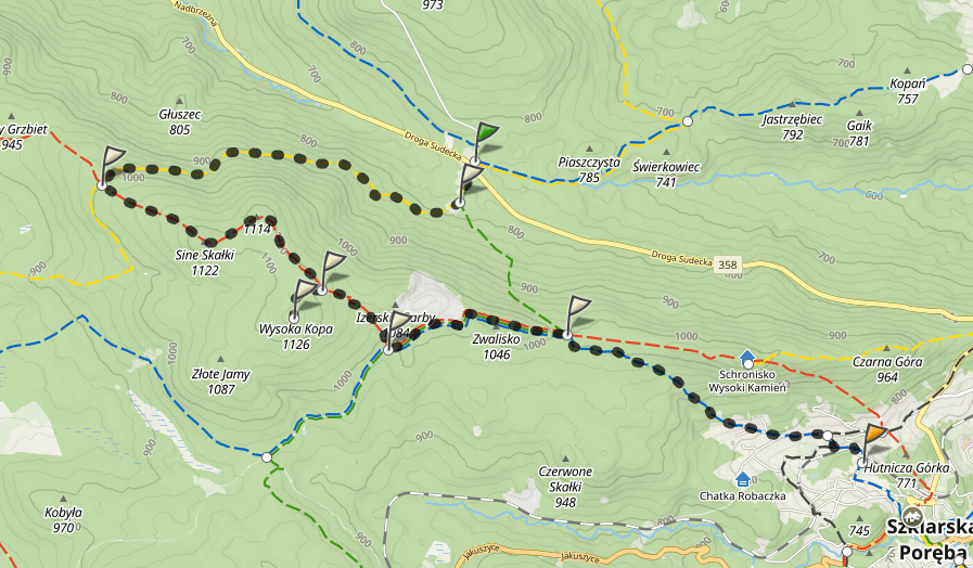 Aby nie wracać tą samą trasą kierowałem się najpierw szlakiem żółtym. Jest to łagodna, szeroka i utwardzona droga, w sporej części biegnąca przez las. Można tutaj dotrzeć i wózkiem i rowerem. Później przy oznakowanym rozwidleniu dróg wchodzę na szlak czerwony w kierunku Świeradowa Zdroju którym dochodzę do drewnianej wiaty Pod Wysoką Kopą 1092 m n.p.m.