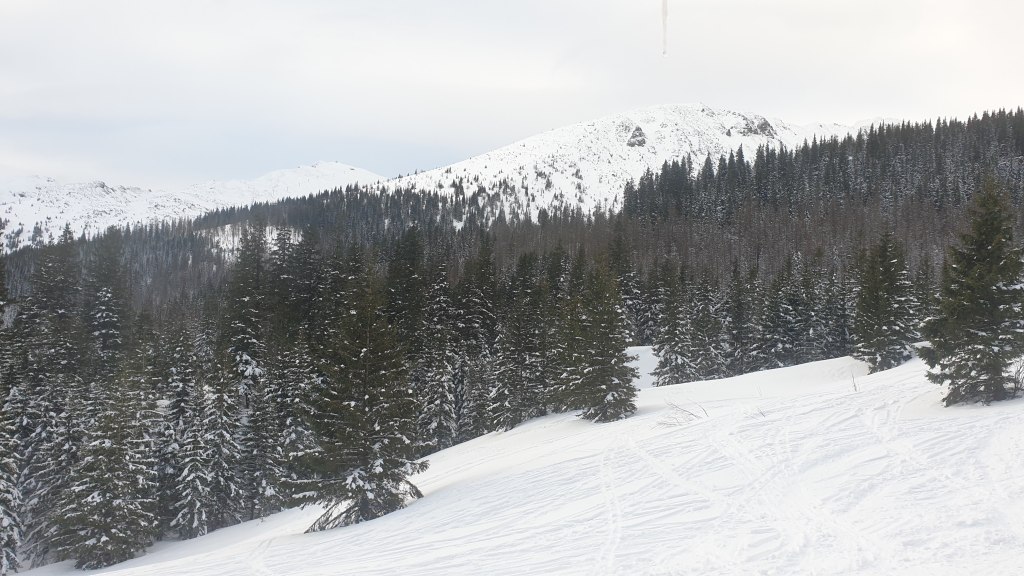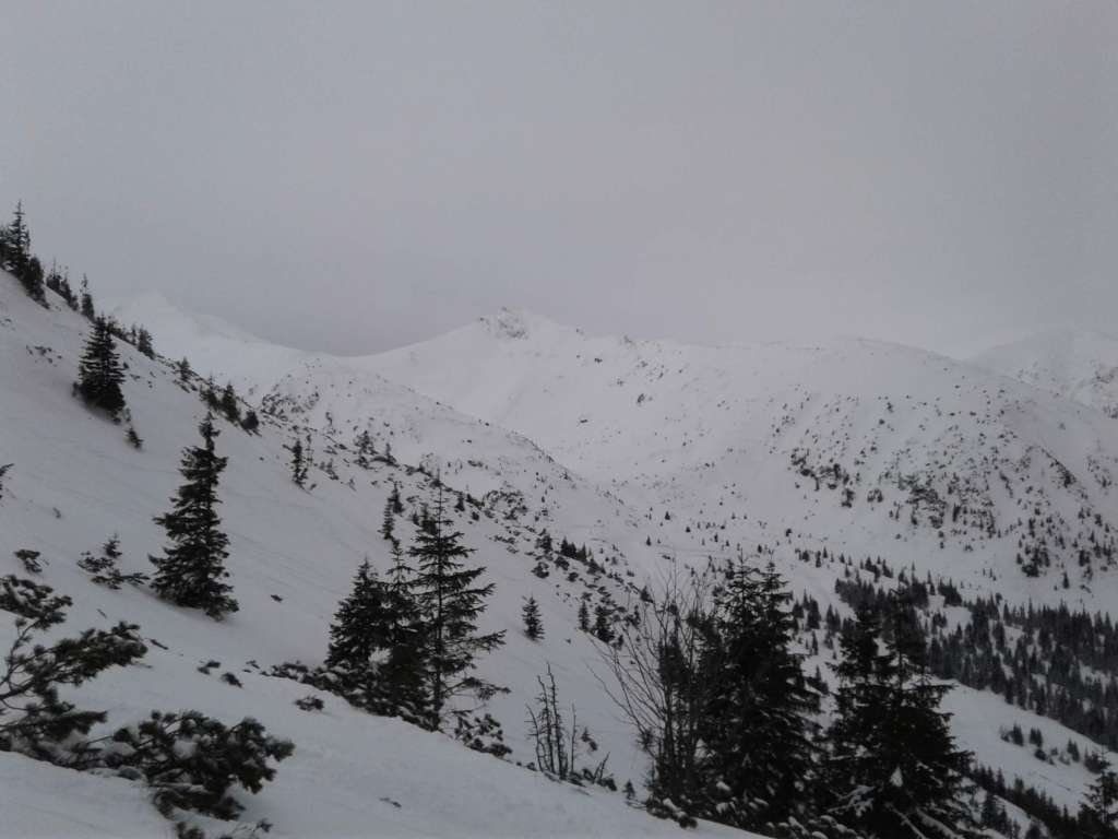 Z Pośredniego Goryczkowego Wierchu schodzimy, klucząc między kamieniami i polami śniegu na przemian, na Goryczkową Przełęcz Świńską 1801 m i kontynuujemy podejście na Goryczkową Czubę 1913 m. Idziemy tutaj dość eksponowanym trawersem, za szlakiem czerwonym, z Goryczkowej Czuby przez Suche Czuby, na Suchy Wierch Kondracki. Idąc między skałkami, w dość stromym terenie mamy świadomość, że jest to teren zagrożony zejściem lawin, dlatego staramy się iść w pobliżu grani bądź samą granią nie zapuszczając się na niebezpieczne południowe stoki aby nie zaliczyć dupozjazdu w stronę naszych południowych sąsiadów. Zdecydowanie przydatne w tym terenie raki oraz czekan. Gdzieś tutaj pod nami, po północnej stronie jest Dolina Sucha Kondracka a po południowej stronie głęboko wcięta w masyw tatrzański Dolina Cicha niestety nie dane nam dzisiaj zachwycać się tymi widokami. Schodzimy na przełęcz pod Kopą Kondracką i dalej przyjemnym i dość stromym terenem przez Długi Żleb do schroniska PTTK na Hali Kondratowej .