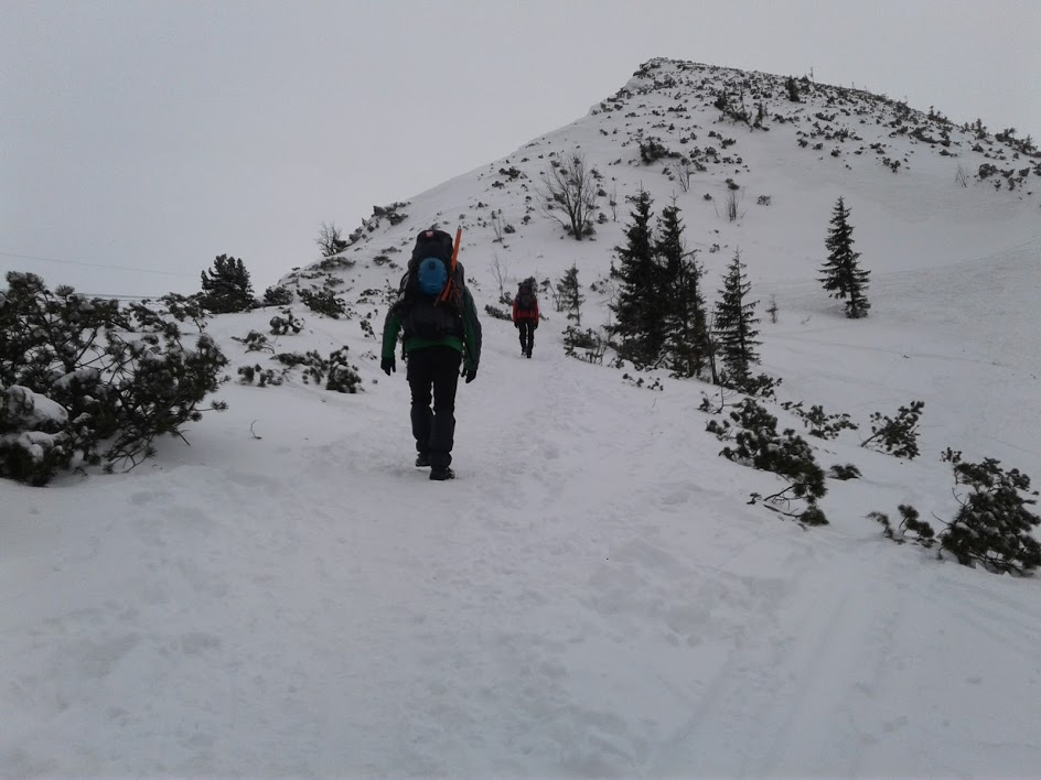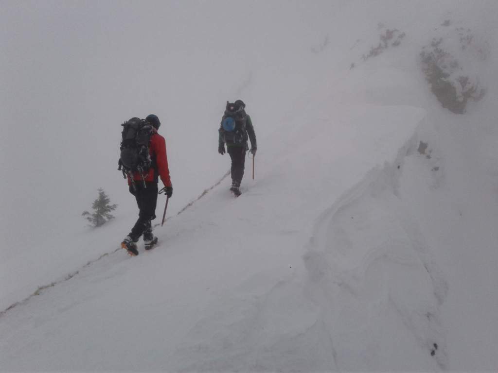 Na początku drogi idziemy szerokim grzbietem Goryczkowej Przełęczy nad Zakosy 1816 m. (słow. Východné Goričkovo sedlo), ostatni fragment podejścia stąd na Pośredni Goryczkowy Wierch 1874 m jest dość wąską i dość stromą granią. Szlak jak na razie jest przetarty więc dobrym tempem posuwamy się do przodu. gdzieś tam po prawej stronie powinniśmy mieć widok na Goryczkową Dolinę oraz w oddali Giewont, niestety nie widać dalej niż jakieś 20 metrów.