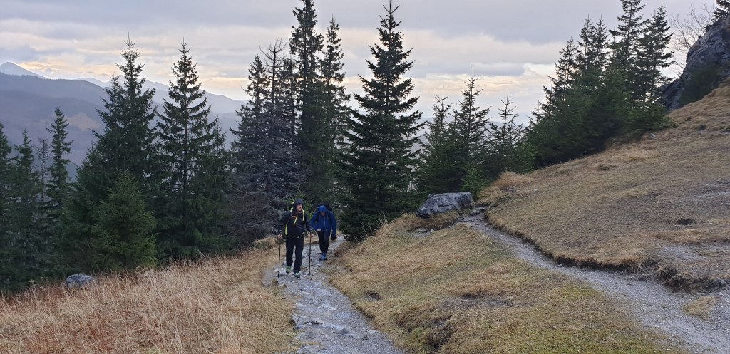 Od tego miejsca szlak bierze się ostro do roboty i szybko zaczynamy zdobywać wysokość. Teraz, aż do szczytu Ciemniaka, cały czas jest pod górę. Od początku roztaczają się piękne widoki. Początkowo głównie na otaczające Dolinę Kościeliską szczyty, widać również Babią Górę. Gdy dochodzimy po około 2h do Pieca (1460 m) otwiera się też widok na drugą stronę, jednak wzmaga się coraz silniejszy wiatr.