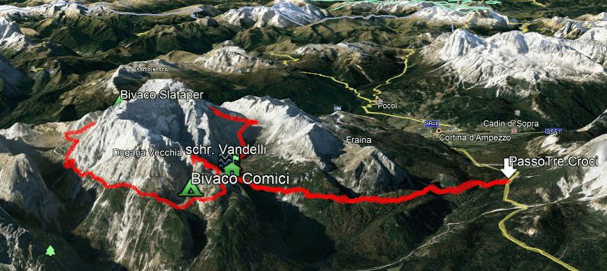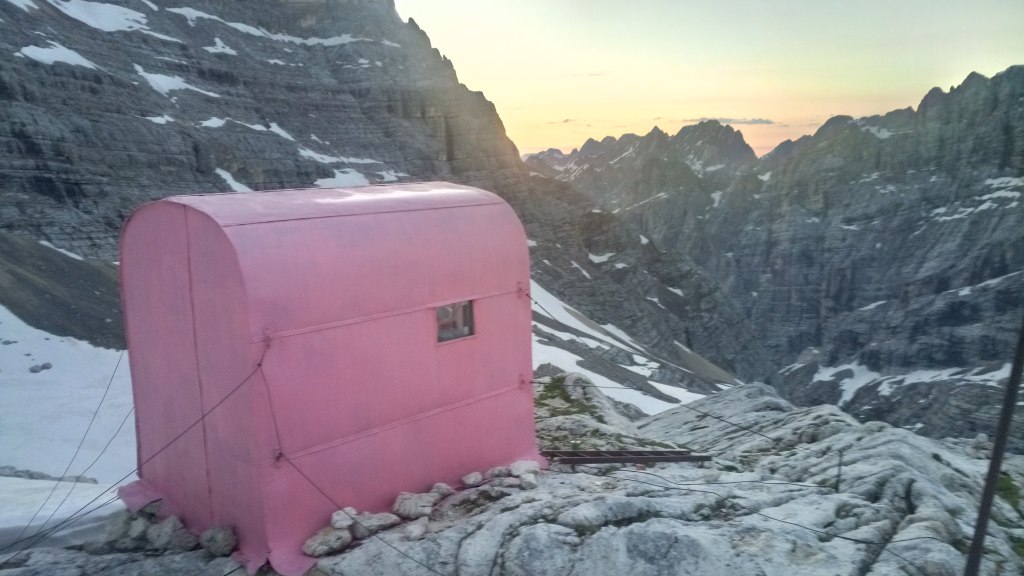 przepaścistych ściankach. Następnie schodzimy ostro w dół trawersami przecinającymi strome zbocze – z tego miejsca widać już czerwoną kapsułę bivacco Comici.