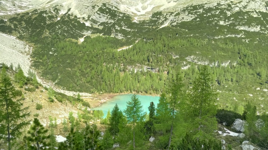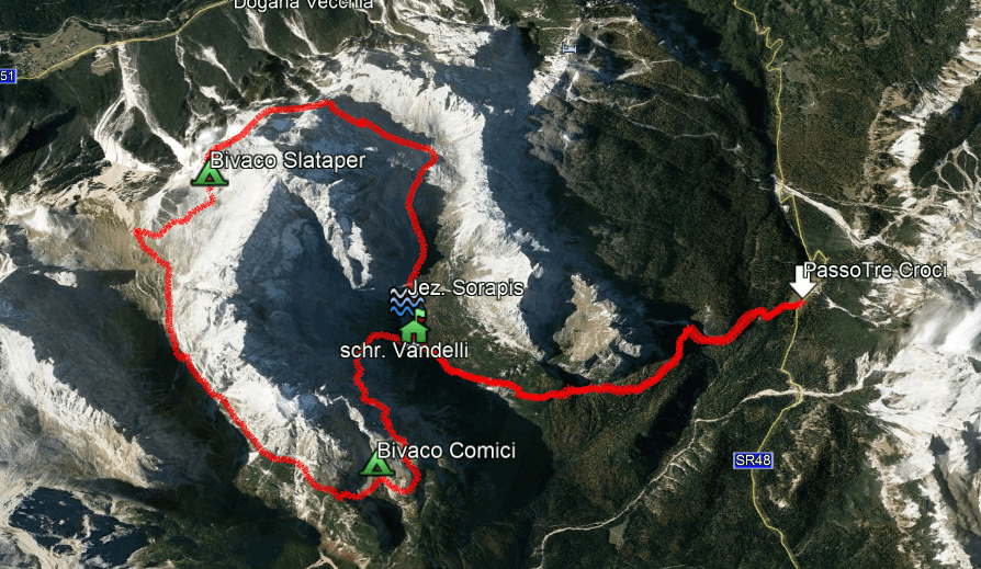 Naszą wycieczkę rozpoczynamy na Paso Tre Croci. Perć Orti di Marcoira to zwykły, początkowo szeroki i wygodny szlak turystyczny, którym wędrujemy do schroniska Rif. Vandelli oraz do słynnego jeziora Lago di Sorapiss. Pokonanie go wg przewodnika zajmuje ok. 2 – 2,5 godz. Nam z dość ciężkimi plecakami (zapas wody i jedzenia na dwa dni oraz śpiwory) udało się pokonać tę trasę w 1.40 min. Trasa jest bardzo ciekawa i widokowa, a w końcowej części również nieco przepaścista, bo wiedzie półkami zawieszonymi wysoko ponad urwiskiem (znajdują się tu stalowe ubezpieczenia oraz czasami stopnie, ułatwiające pokonanie kilku progów skalnych). Podobno minusem tej drogi, jak też otoczenia schroniska, są ogromne tłumy ludzi, których można uniknąć tylko przez wyjście na szlak we wczesnych godzinach rannych lub późnych wieczornych. Cóż, atrakcyjność turkusowego jeziorka sprawia, że chce go zobaczyć wielu – podobnie jak wnaszych Tatrach Morskie Oko… My jesteśmy tutaj w środku tygodnia , przed sezonem więc tłumów nie ma.