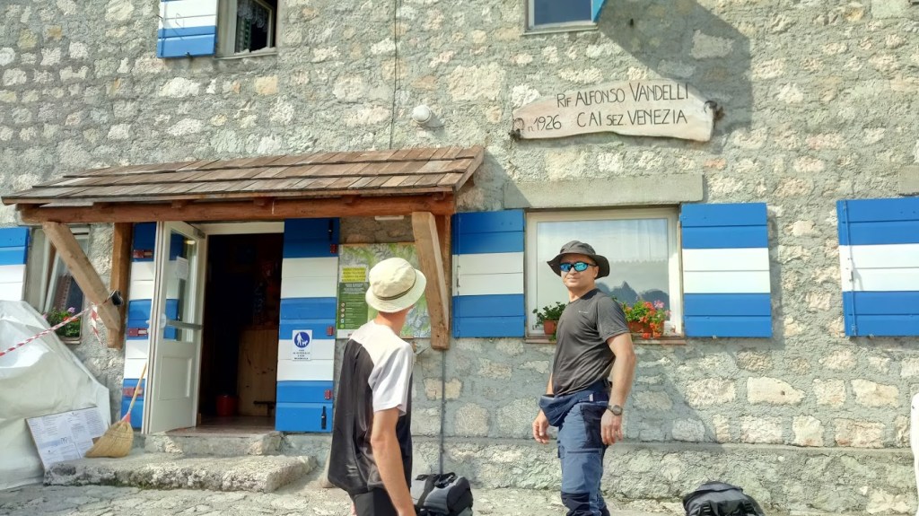 Podchodzimy do rifugio Vandelli gdzie zaplanowaliśmy krótki odpoczynek. Od starszej Pani pracującej w bufecie dowiadujemy się że w tym roku jeszcze nikt nie zrobił obejścia Sorapiss, ale dzisiaj przed nami wyszła dwójka która zmierzała w kierunku ferraty Vandelli.