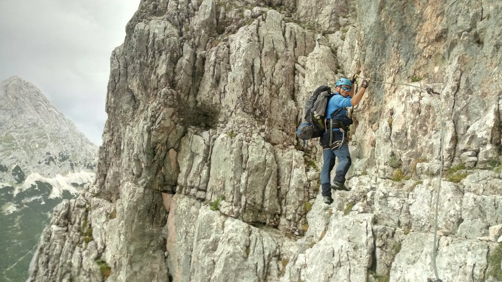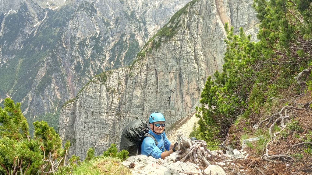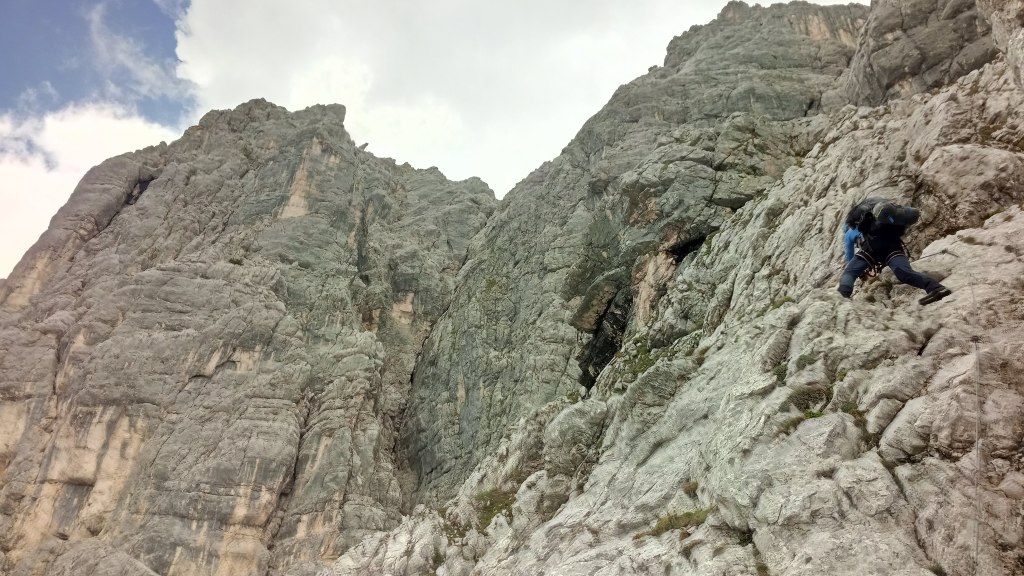 o długości ok. 250 m, jest bardzo narażony na spadające kamienie, które mogą strącać ludzie znajdujący się powyżej, nam to dzisiaj nie grozi ponieważ jesteśmy tutaj sami, więc musimy uważać tylko na siebie. Wysokość pokonuje się w dobrze urzeźbionej skale, a w trudniejszych miejscach po wielu drabinach,które miejscami są zniszczone lub słabo przymocowane do skały – dodatkowa atrakcja. Natomiast ubezpieczenia ze stalowej liny są w dobrym stanie, a odległości między kotwami odpowiednie do pokonywanych trudności. Ten wyprowadzający na półki fragment w mojej opini był najtrudniejszy na ferracie Vandelli – dalej, poza kilkoma miejscami, było już znacznie łatwiej.
