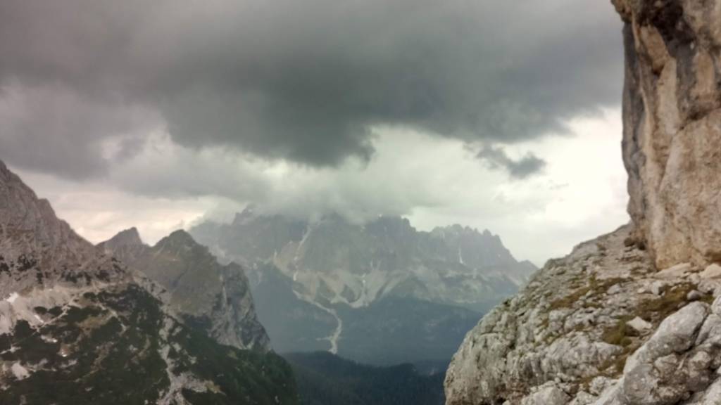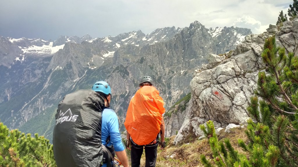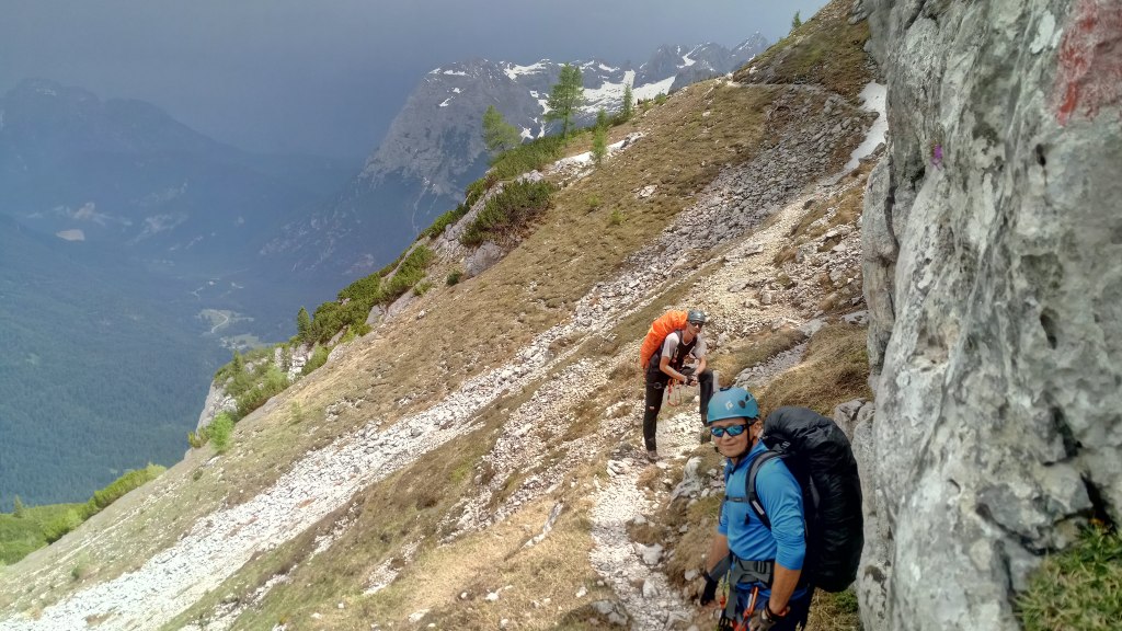 Trawers półkami zanika w momencie przewinięcia się naszej drogi na drugą stronę grzbietu – w tym miejscu kończą się na jakiś czas ubezpieczenia. Kruchą i stromą percią wiodącą wśród skał i traw schodzi się do niewielkiego kociołka. Mimo że już wcześniej padał deszcz teraz pogoda psuje się jeszcze bardziej, w oddali słychać grzmoty które góry jeszcze potęgują.