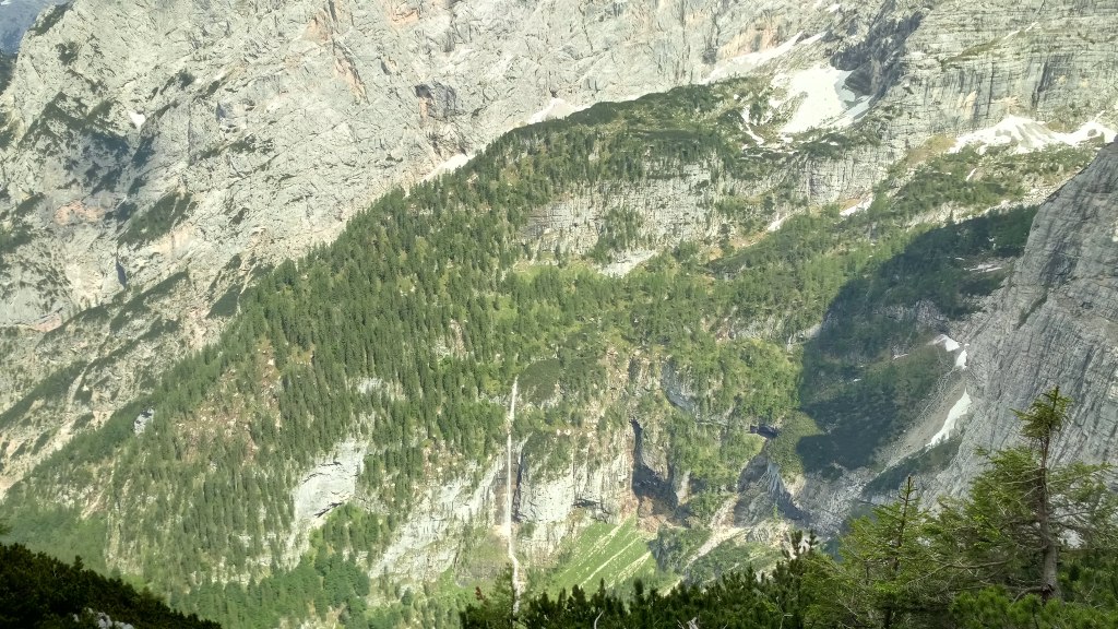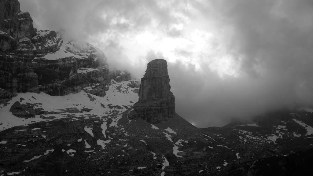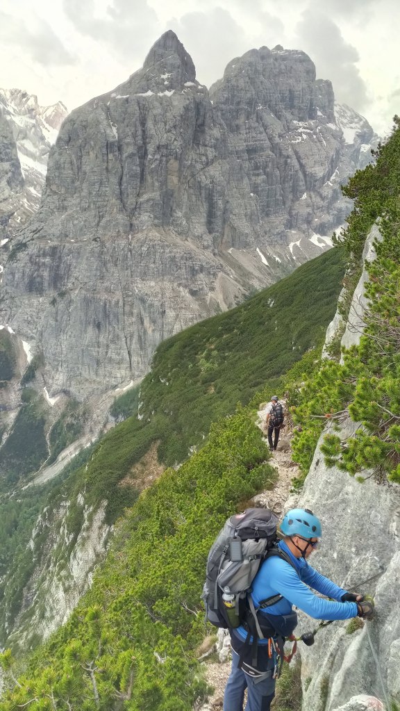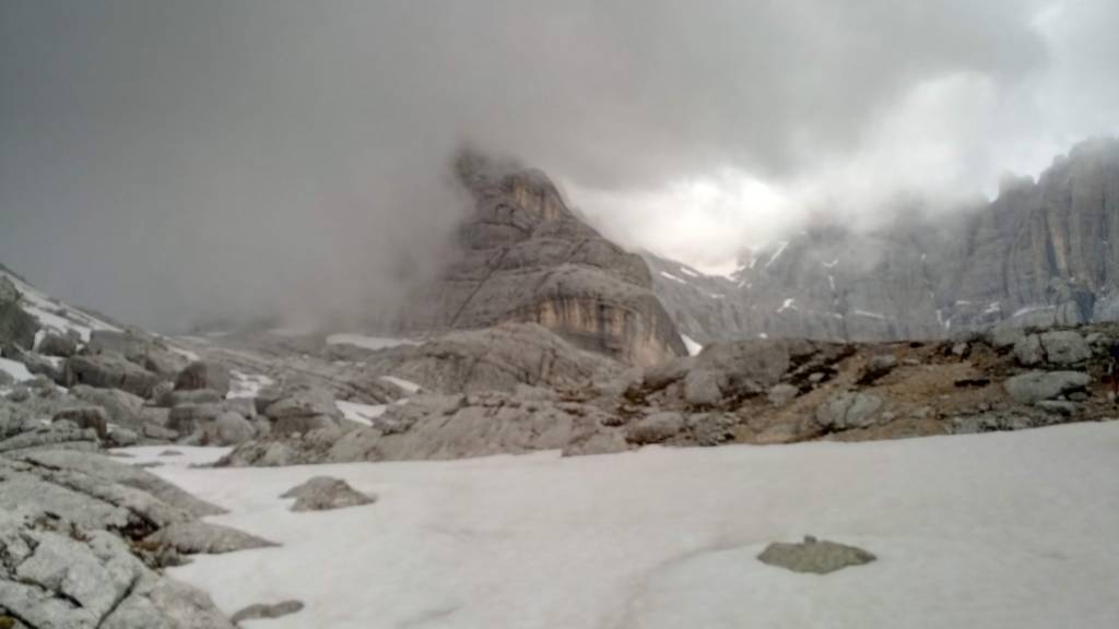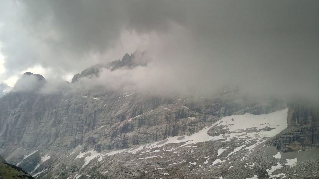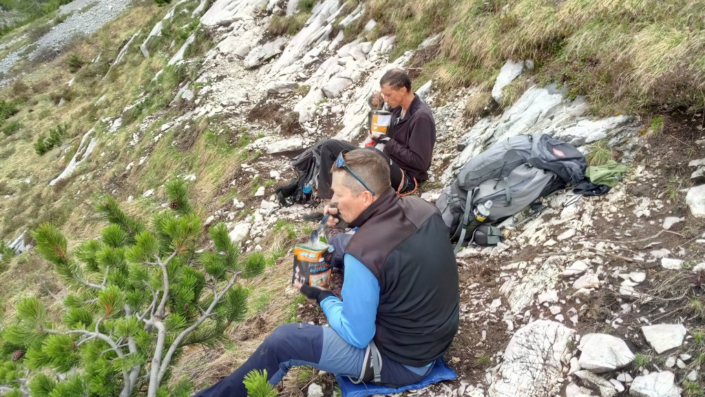 Robimy parę odpoczynków po drodze w tym jeden dłuższy na posiłek, pogoda nie rozpieszcza coraz częściej pojawiają się przelotne opady, a grzmoty zdają się być tuż nad naszymi głowami. Zastanawiamy się czy dwoje turystów przed nami idzie do biwaku Slataper i czy nie lepiej rozbić obóz gdzieś w skale na drodze Carlo Minazio aby nie gnieść się w piątkę w kapsule. Po posiłku zapada decyzja – ruszamy dalej.
