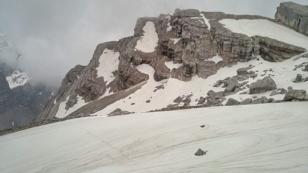 Po dotarciu do trawiastej hali dotychczasowy szlak skręca łagodnie w lewo w kierunku przełęczy Forc. Grande. Odtąd zaczyna się widokowe, bardzo łatwe, a pod koniec żmudne podejście do leżącego ponad 500 m wyżej Bivacco Slataper (2600 m). Szlak w tym miejscu jest słabo oznakowany z czego część oznaczeń pod śniegiem. Przegapiliśmy skrót – powinniśmy byli na początku łąki opuścić wygodną ścieżkę i skręcić w prawo ku perci wydeptanej w piargu u stóp potężnych ścian. Niestety z powodu zalegającego śniegu odgałęzienie nie było widoczne.