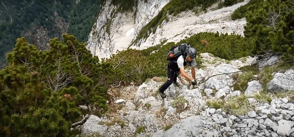 Po przejściu tego odcinka zaczyna się prawie poziomy trawers wiodący półką, sporadycznie ubezpieczony liną. Trasa od przełęczy w większości wiedzie w otoczeniu kosówek i wbrew pozorom, miejscami jest bardzo eksponowana (zwłaszcza na początku). Cały czas wędrówce towarzyszą świetne widoki na leżącą niżej dolinę i przeciwległy zwarty mur skalny, a pod koniec, na