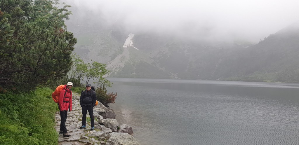 Maszerujemy w deszczu brzegiem Czarnego Stawu. Idzie się podobne, jak przy Morskim Oku, z tym, że tu kamienny chodnik jest nieco mniej równy i wymaga odrobinę więcej ostrożności.Na przeciwnym brzegu ścieżka zaczyna się wznosić. Najpierw łagodnie, później coraz stromiej. Teren, z trawiastego, stopniowo zmienia się w bardziej skalisty. Początkowo równy chodnik też traci swoją regularność i zmienia się w luźno ułożone kamienie.