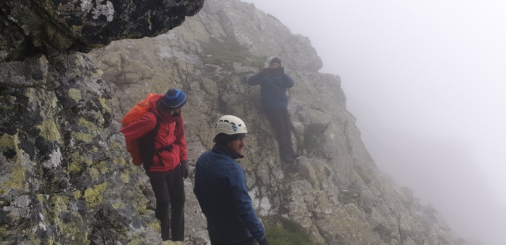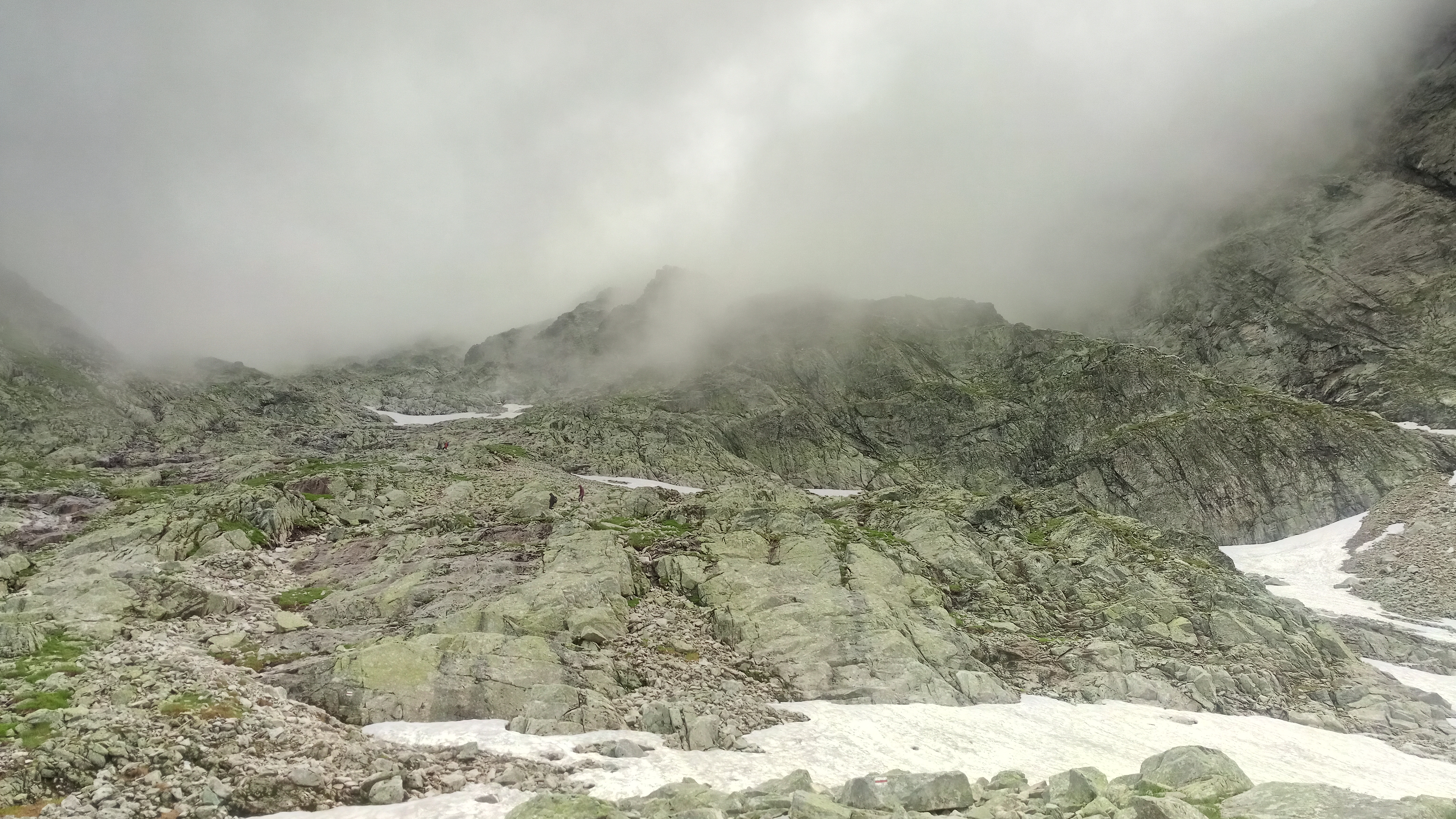 Po lewej stronie widzimy coś, co można by uznać za ścieżkę wydeptaną po kruchej, niemal żwirowej nawierzchni. Niby jest to „przed pierwszymi łańcuchami”, ktoś tędy chodził, to pewnie i my możemy spróbować. Po 10 min marszu stwierdzamy ze to nie jest jednak ta trasa postanawiamy zawrócić z powrotem do łańcuchów. Przy tak słabej widoczności nie jesteśmy w stanie ocenić naszej drogi. Przechodzimy przez pierwszą linię sztucznych ułatwień i kiedy myślimy że trzeba zrezygnować spotykamy gościa który schodzi z Niżnich Rysów, po krótkiej rozmowie naprowadza nas na szlak. A więc idziemy. Rozglądamy się za jakimiś kopczykami, ale na tym gruzowisku i przy takiej pogodzie trudno jakikolwiek wypatrzeć.