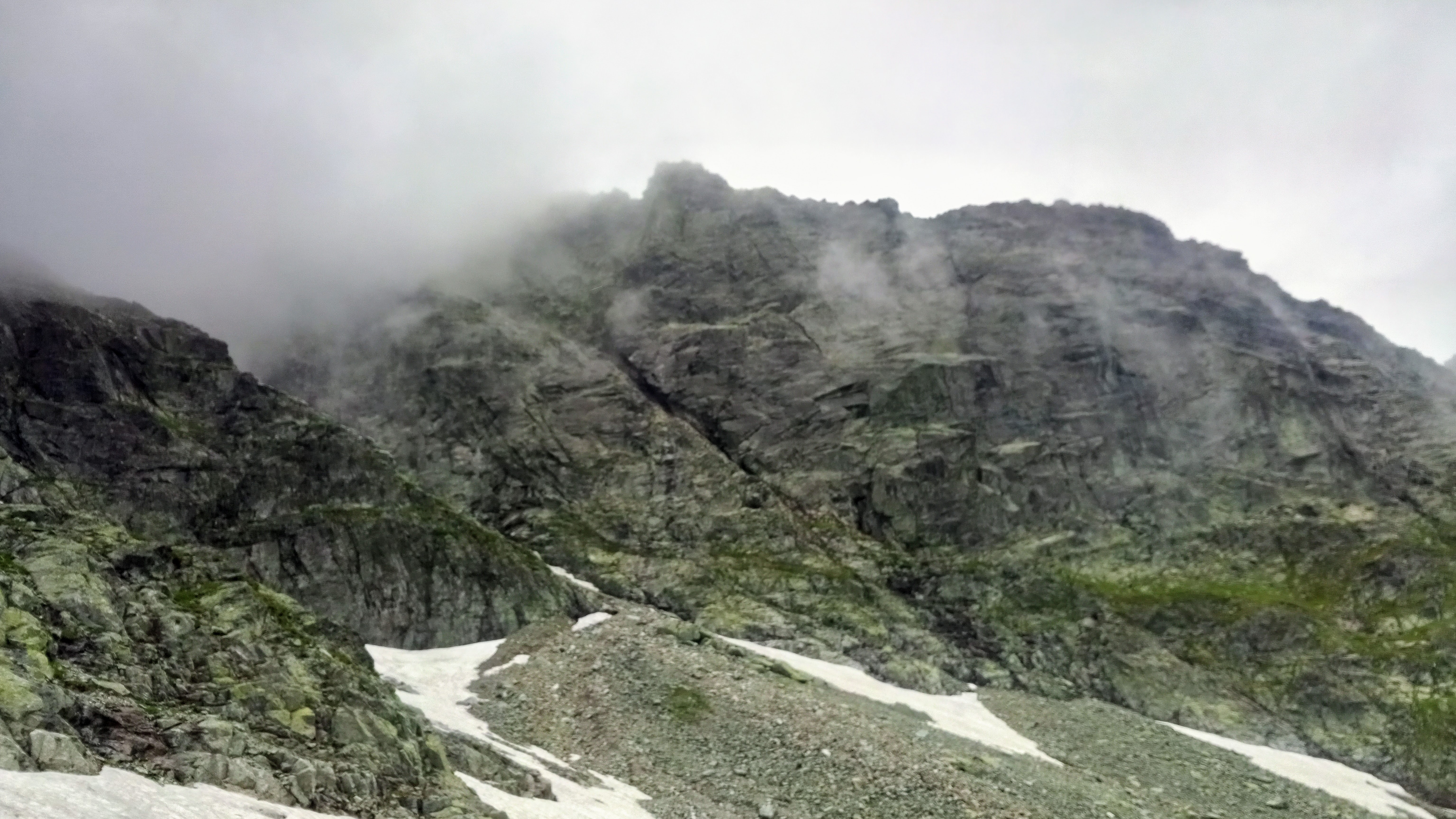 Idziemy więc tak, jak nam się wydaje, że ma sens. Wiemy, że należy się kierować na przełęcz pomiędzy głównym a południowym wierzchołkiem, a trasa ma się lekko odchylać w lewo – ale nic nie widzimy. Kojarzę też, z któregoś z opisów, że przy trasie powinien być jakiś mokry żleb. I faktycznie mamy coś takiego po swojej lewej stronie, więc idziemy wzdłuż tego płytkiego rowu, starając się wybierać możliwie najmniej sypkie podłoże.