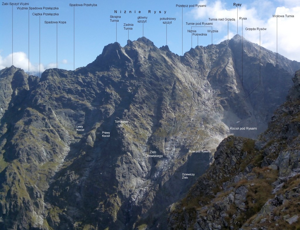Góra ma cztery wierzchołki, oddzielone niewielkimi przełączkami, z których najwyższy mierzy i 2430 metry. Pozostałe to: południowy wierzchołek (2405 m) oraz Zadnia (2410 m) i Skrajna (2375 m) Turnia w Niżnich Rysach.