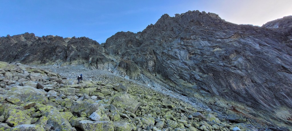 Idziemy Batyżowiecką Doliną, podchodzimy stromymi piargami na ostatnie pięterko doliny, pod Batyżowiecki Żleb, dalej po kamieniach i piargach wzdłuż ściany. Mijamy skały za Batyzowieckim Żlebem i wchodzimy w Walowy Żleb.
