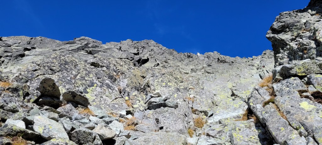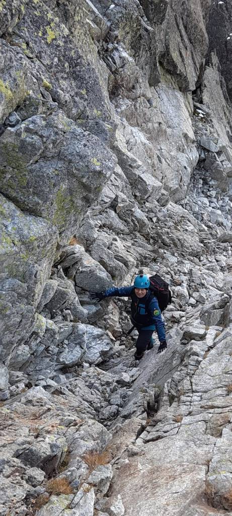 Na początek przechodzimy, próg skalny próg oceniany jest na I-II, dalej ma być jedynkowo. Pniemy się w górę w kierunku przełęczy, teren zaczyna być coraz bardziej kruchy, czego by się nie dotknąć jest ruchome.
