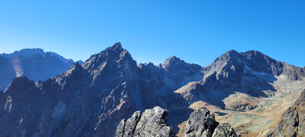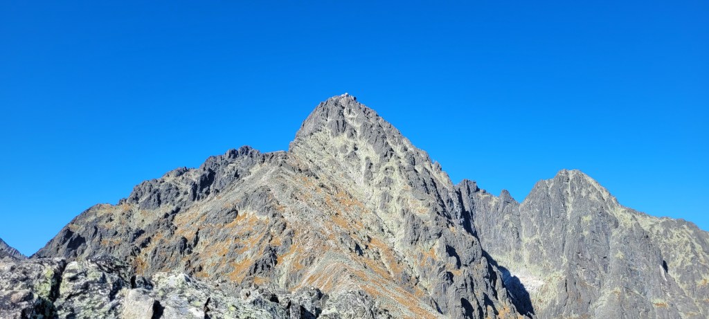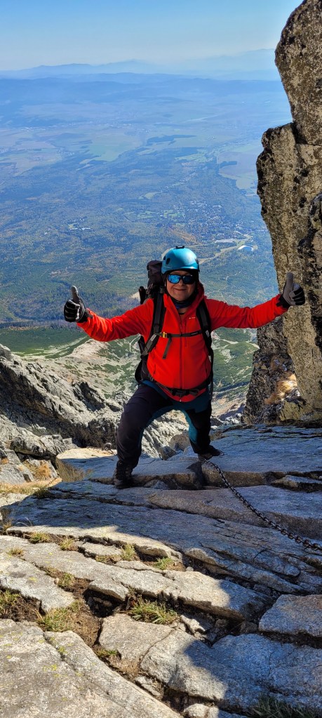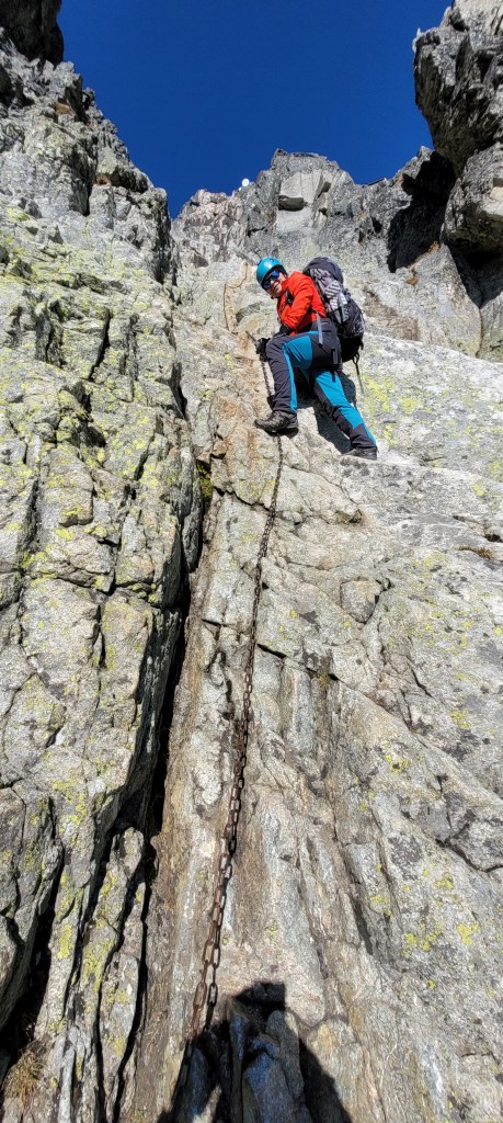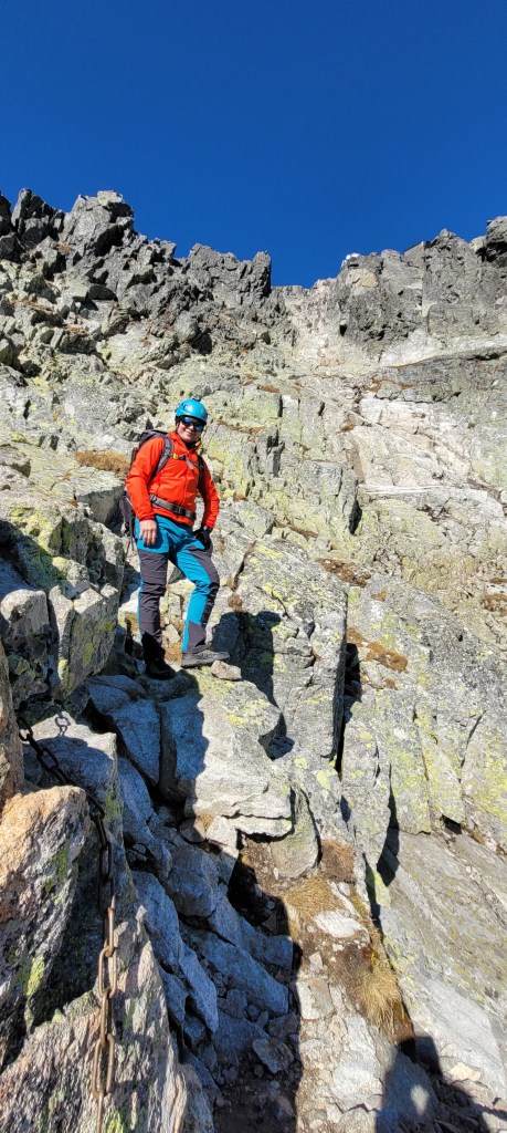 Idę dalej spadzistym żlebem zakończonym krótkim płytowym zacięciem, które wyprowadza mnie ponownie na żebro. Poziomym trawersem osiągam dno płytkiego żlebu, z tego miejsca w górę po skałkach. Łańcuchy ułatwiają mi pokonanie gładkiej płyty o nachyleniu niemal 45°. Podążam dnem żlebu poprzez ścianki i płytowe progi w pobliże wierzchołka. Póżniej skręcam w lewo na południową grań i nią dostaję się na szczyt. Jestem – Łomnicki Szczyt 2634 m n.p.m. 😀