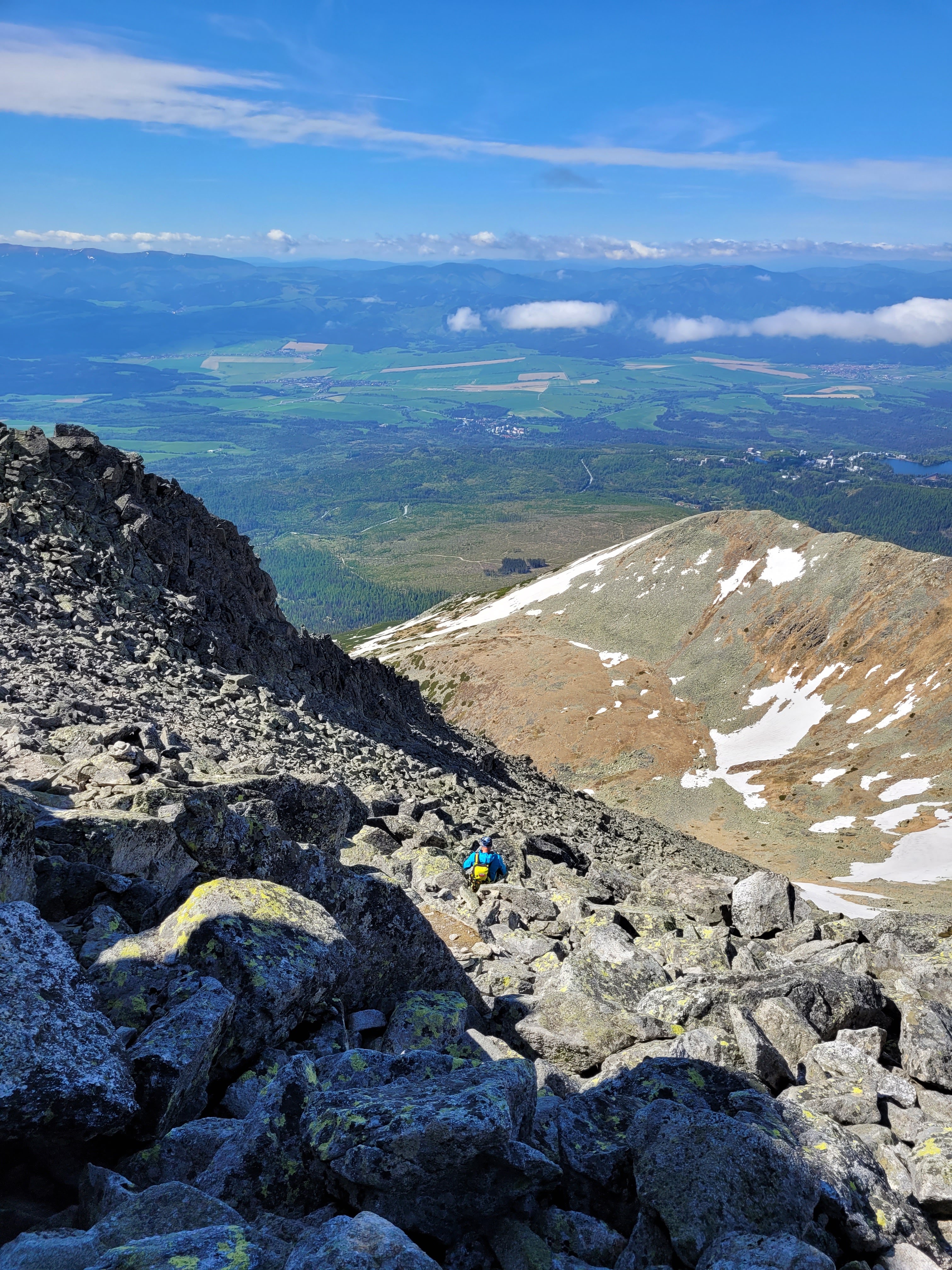 Zdarza się nam przysiąść obejmując kamień aby nie polecieć w dół. Obchodzimy grań od zachodu, wchodzimy lekko do góry, przechodzimy trawiasto – piarżystą granią i rozpoczynamy zejście na coraz bardziej rozszerzający się grzbiet góry. Przechodzimy przez rozległe głazowiska zblizając się do magistrali tatrzańskiej. Wchodzimy na czerwony szlak skręcając w lewo w kierunku Batyżowieckiego Stawu, po kilku minutach jesteśmy w miejscu z którego żólty szlak zaprowadi nas do Wyżnich Hag.