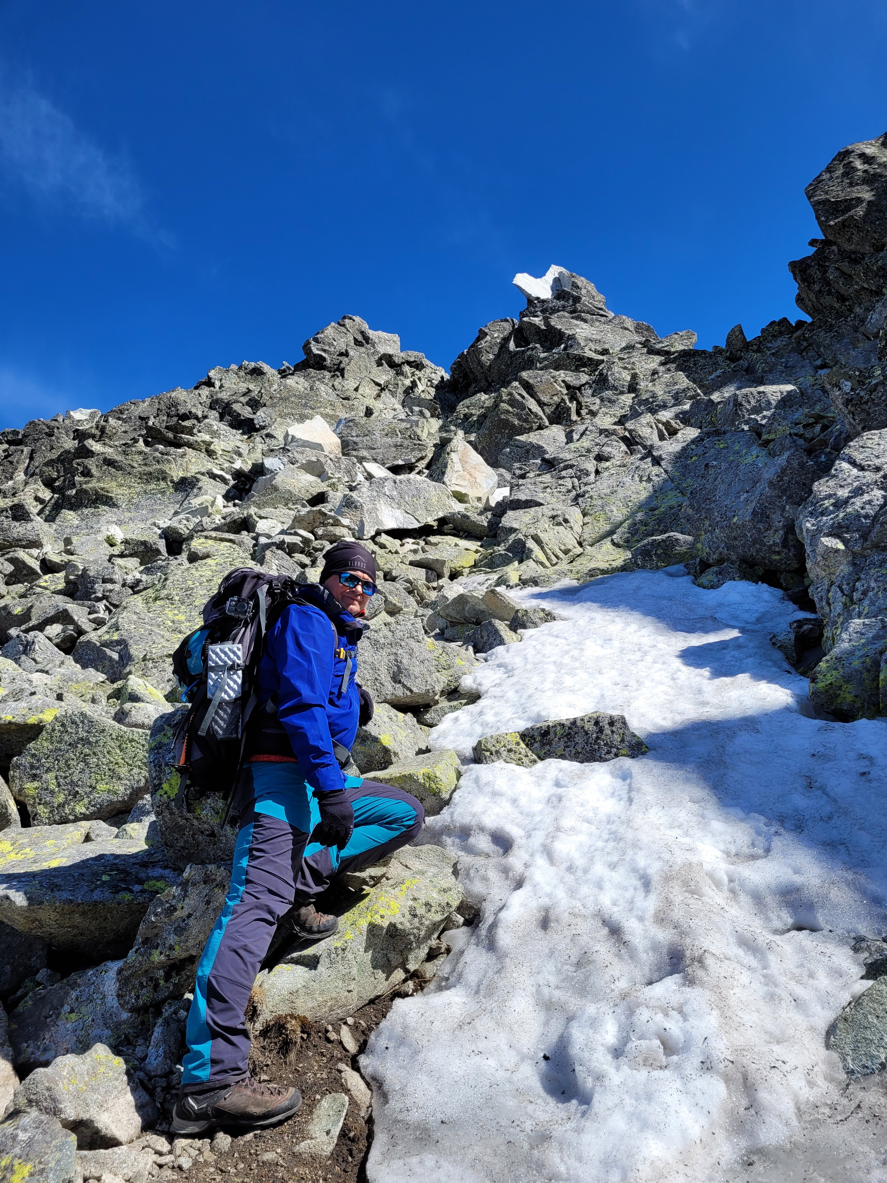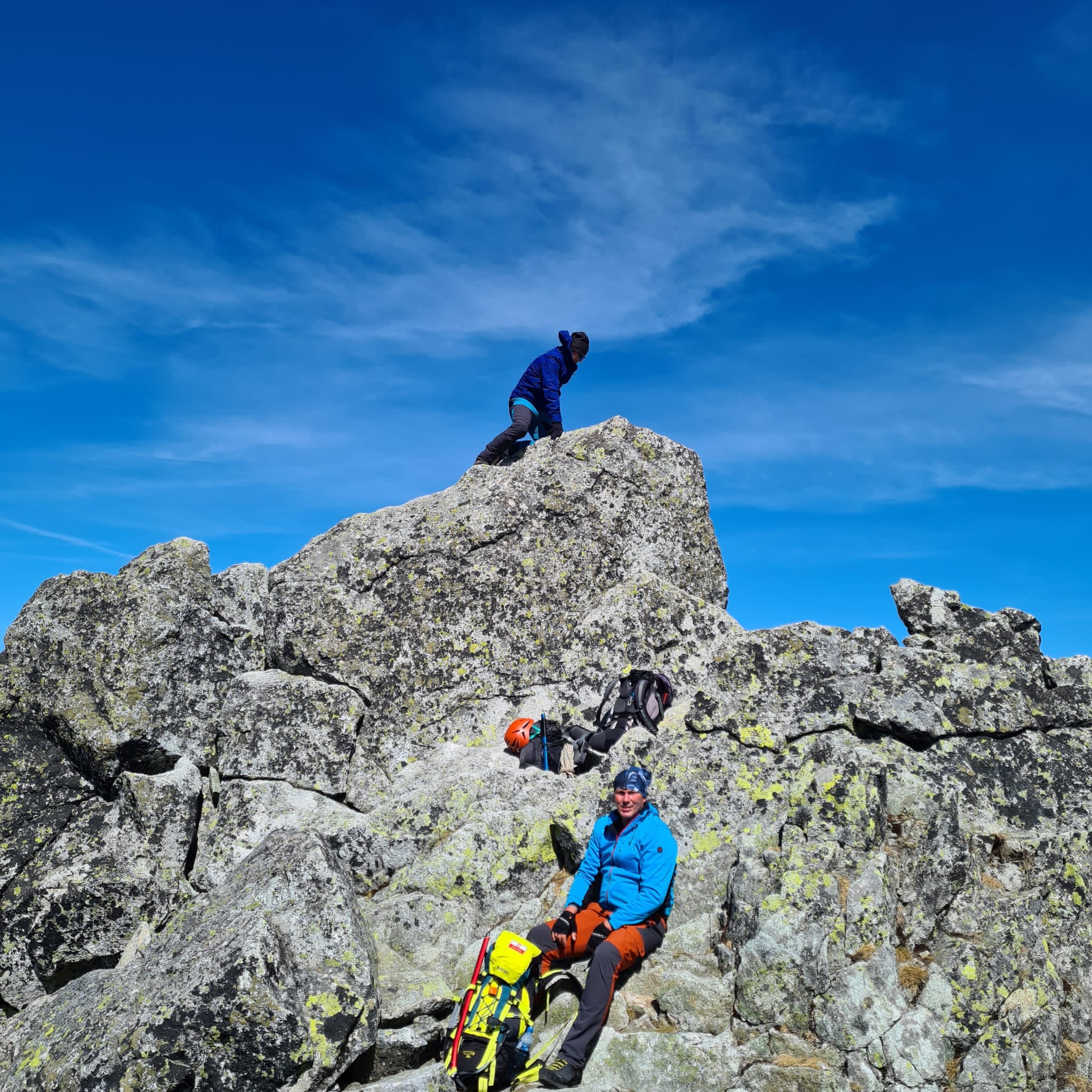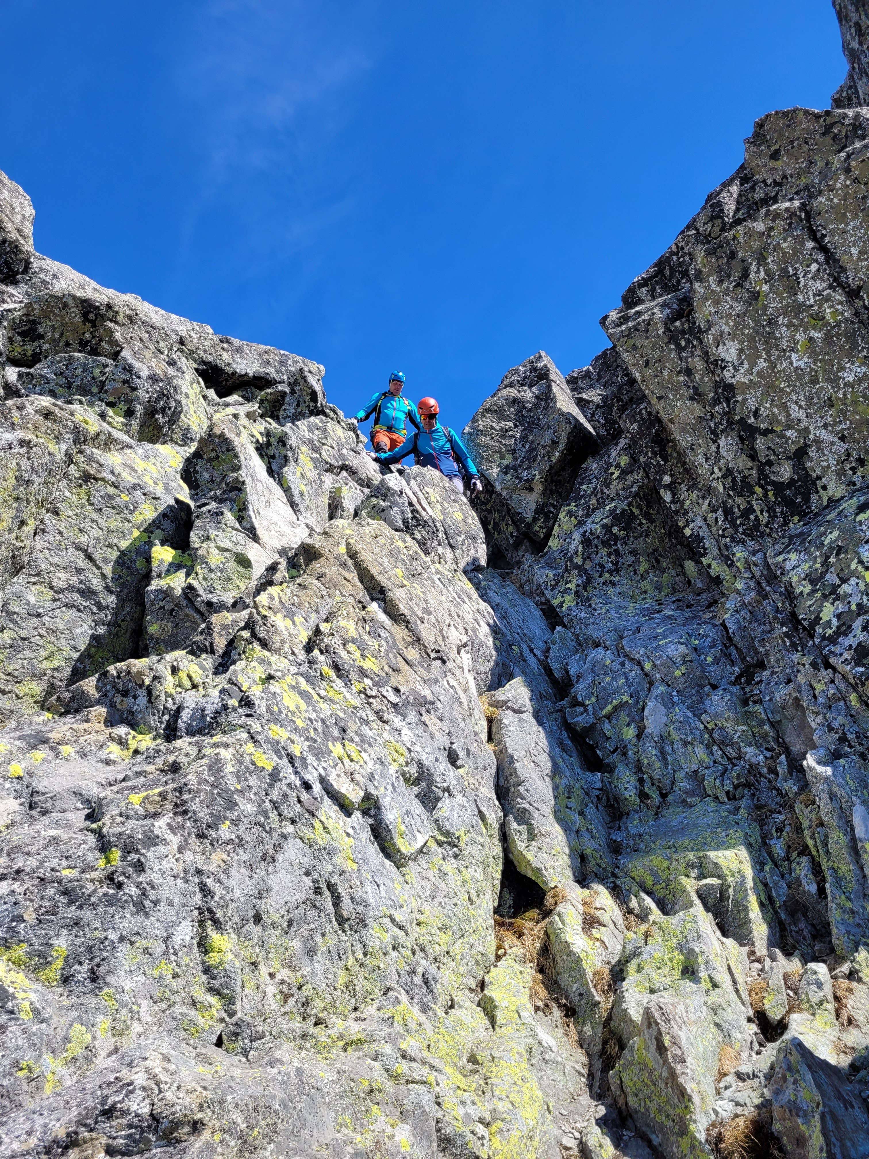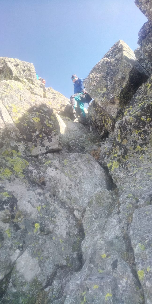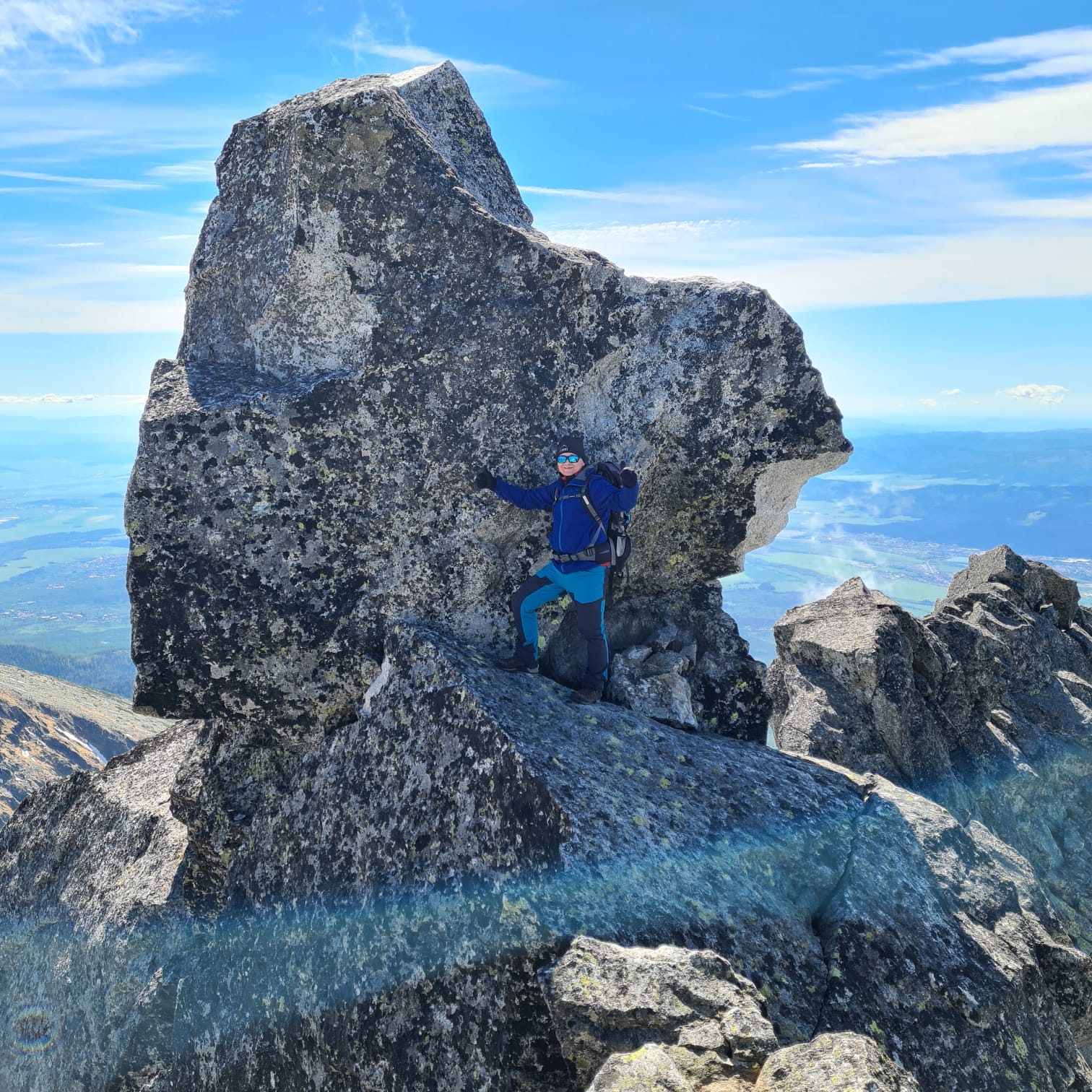 Czekamy na szczycie prawie godzinę w nadziei że wiatr chociaż troszkę zesłabnie. Niestety widoków na poprawę brak i trzeba zawijać się w dół. Rozsądek wziął górę nad naszymi ambicjami – Kowadło pozostało niezdobyte, ale jest opcja ze jeszcze tutaj wrócimy i może wtedy na nie wejdziemy. Na pocieszenie pozostaje nam północny wierzchołek o metr niższy.