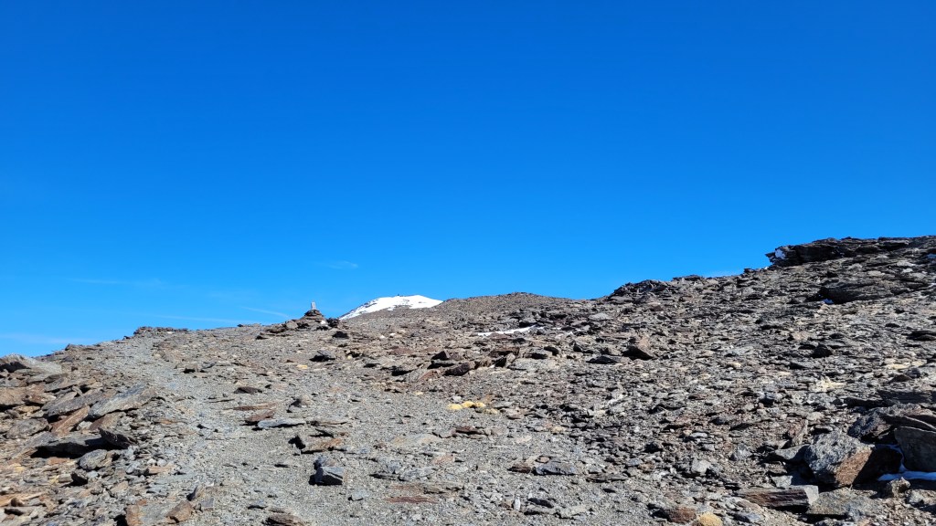 Samo zdobywanie wysokości jest rozłożone na dość sporym odcinku i zanim minęły dwie godziny znalazłem się w miejscu gdzie łączą się szlaki rowerowy i pieszy, a kończy droga dla samochodów. Po drodze mijam przełęcz Collado de Cascajar Negro (2574 m) oraz szczyt Alto del Chorrillo (2721 m). Dochodzi tutaj jeszcze szlak zielony z miejscowości Trevélez. Z tego miejsca do szczytu pozostało mi jakieś trzy i pół godziny wędrówki.